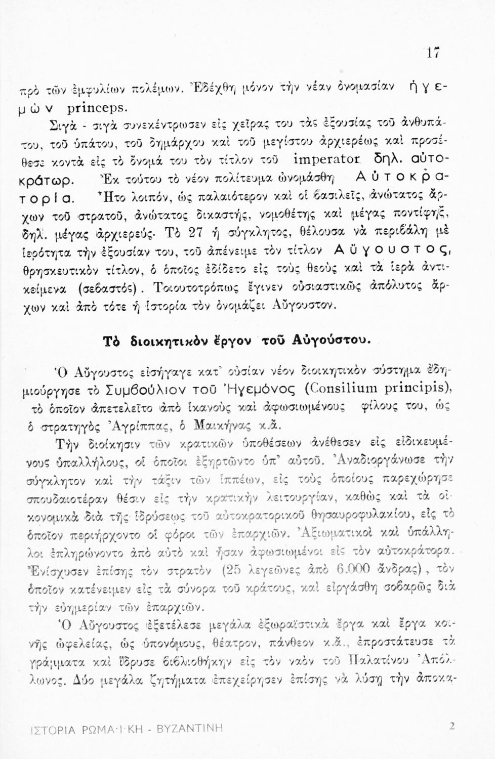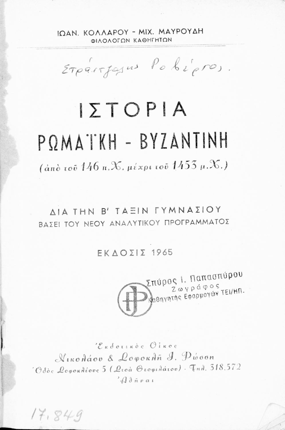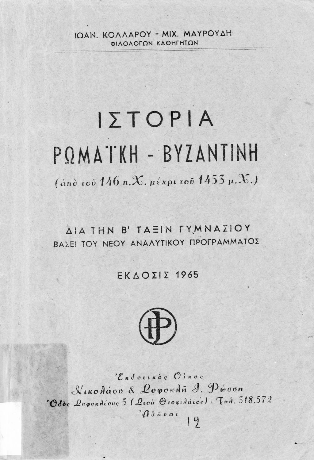 Τίτλος: Ιστορία Ρωμαϊκή-Βυζαντινή (από του 146π. Χ μέχρι του 1453 μ.Χ). Δια την Β΄ Τάξιν Γυμνασίου βάσει του αναλυτικού προγράμματος