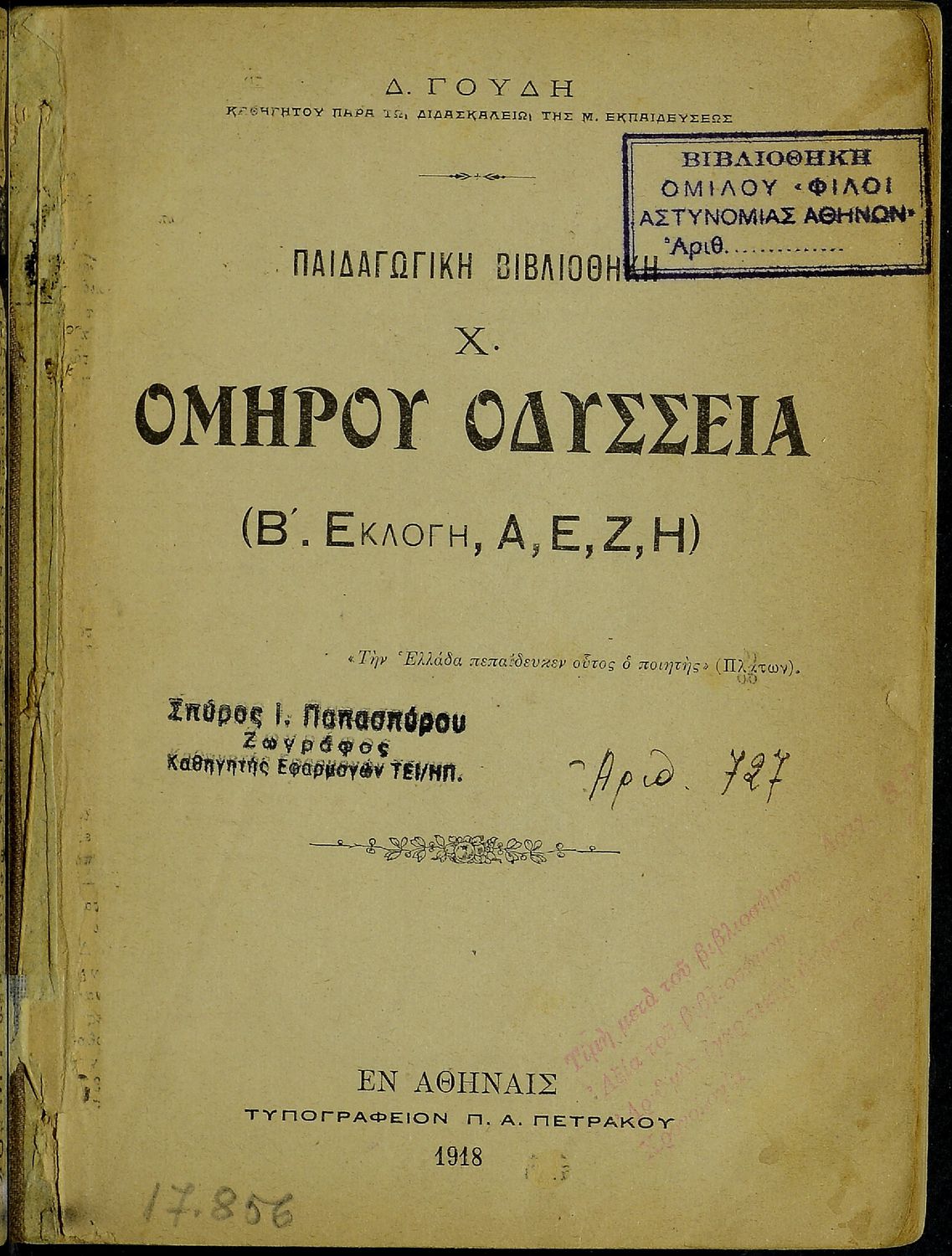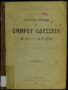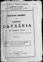 Μαθητικό βοήθημα Αρχαίων Ελληνικών Γυμνασίου που περιλαμβάνει τις ραψωδίες Β΄ εκλογή, Α΄, Ε΄, Ζ΄ και ερμηνευτικές, πραγματολογικές και γλωσσικές παρατηρήσεις . Ο συγγραφέας ήταν Γυμνασιάρχης του πρότυπου ...