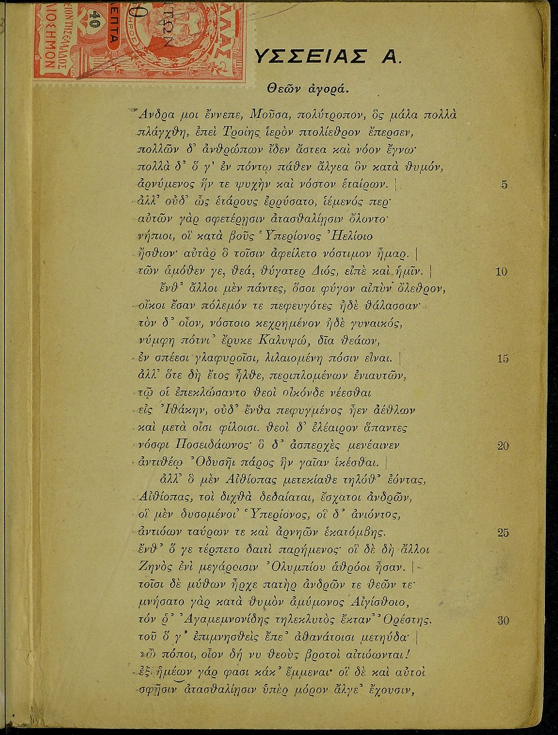 Σχολικό εγχειρίδιο Αρχαίων Ελληνικών Ε΄ Γυμνασίου που περιέχει αποσπάσματα από τις ραψωδίες της Οδύσσειας, εισαγωγή στη ζωή και το έργο του Όμηρου, περιλήψεις των ραψωδιών, ερμηνευτικά, πραγματολογικά σχόλια ...