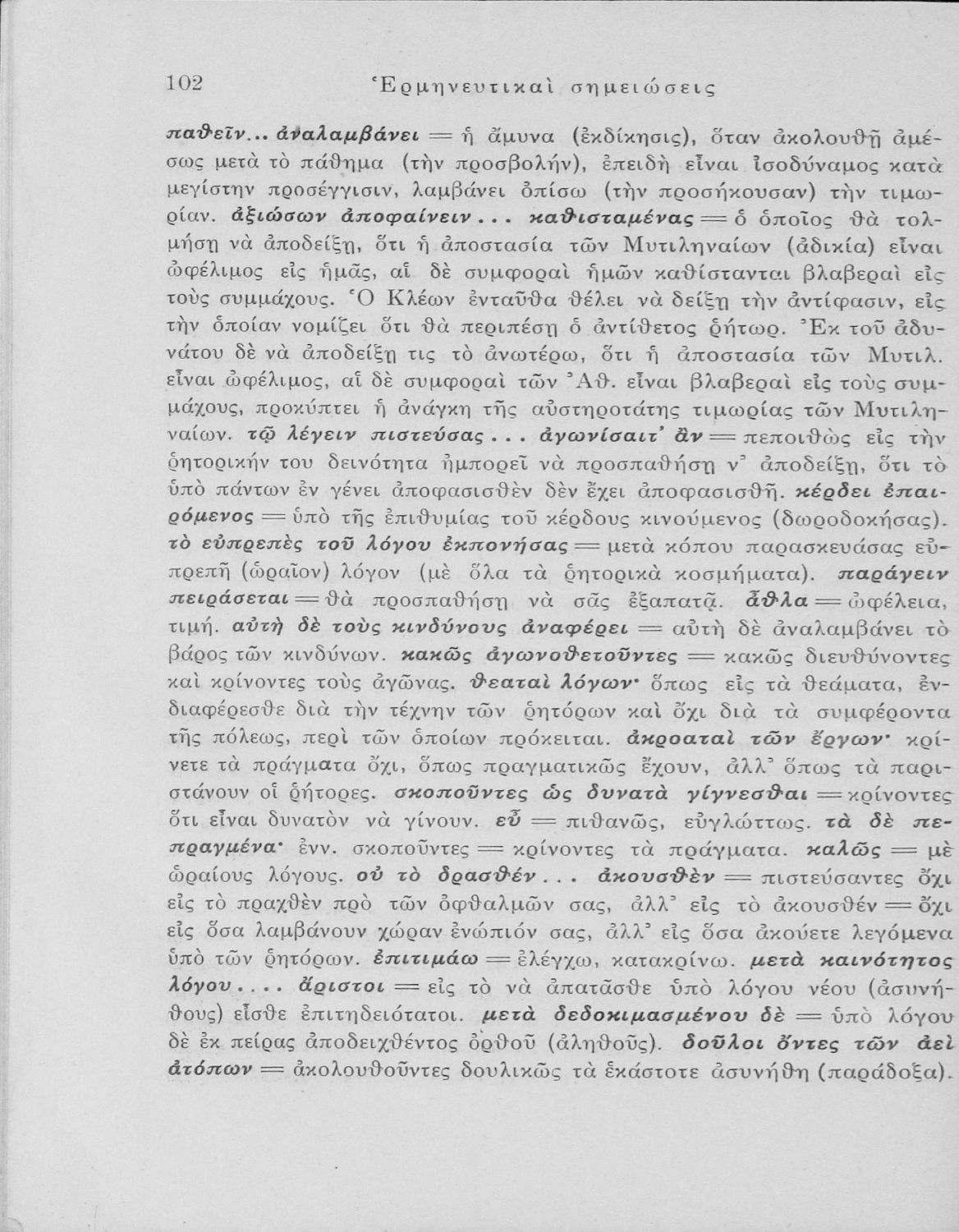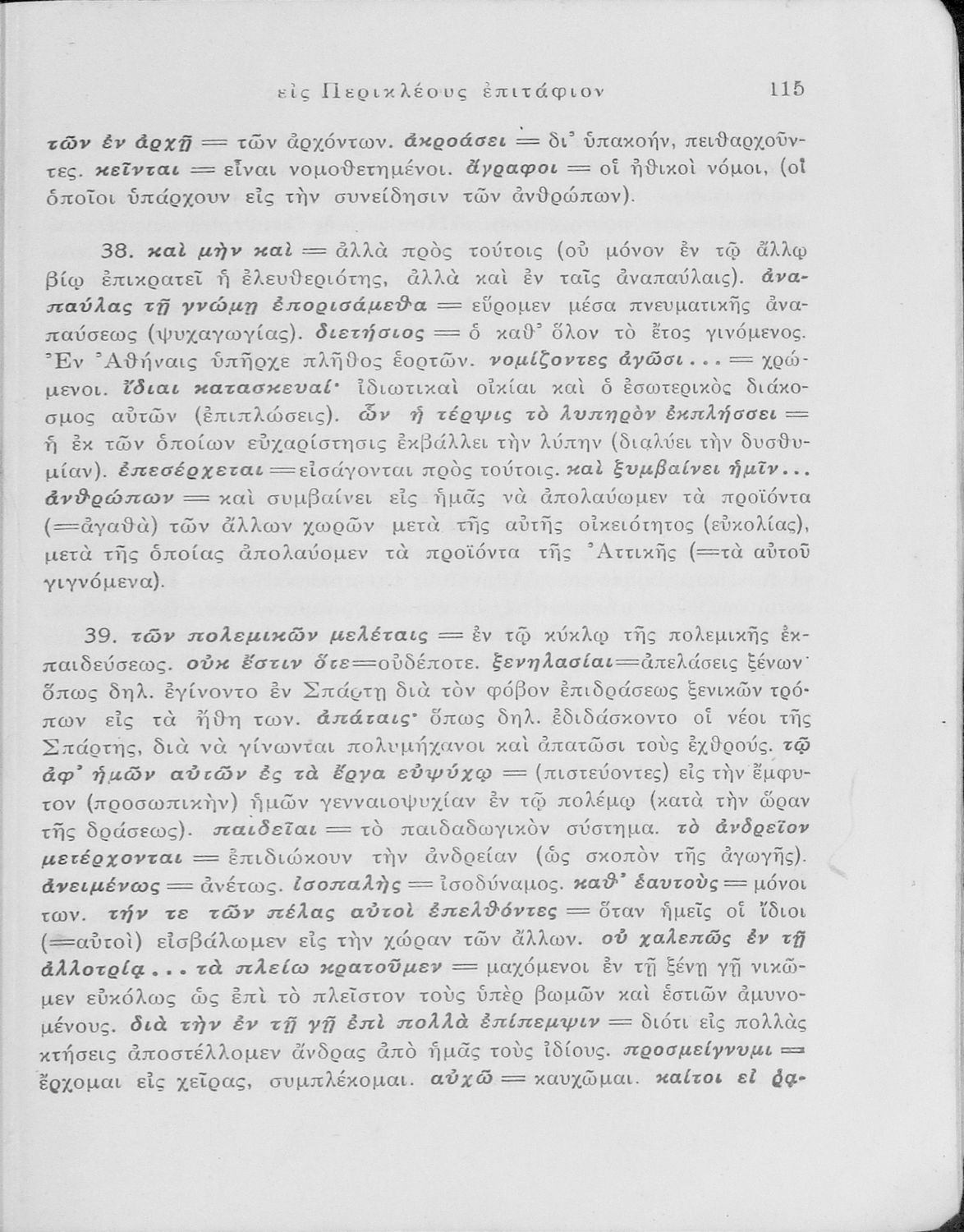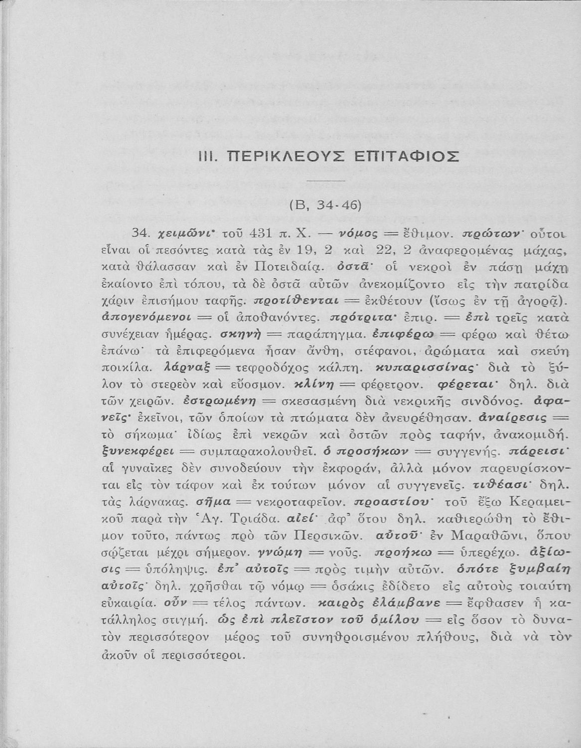 Σχολικό εγχειρίδιο Αρχαίων Ελληνικών για τις Δ΄, Ε΄ και ΣΤ΄ Γυμνασίου παλαιού τύπου που περιλαμβάνει σύντομο βιογραφικό σημείωμα του Θουκυδίδη, περιγραφή του ιστορικού πλαισίου, αποσπάσματα από τα Πλαταϊκά, τα Λεσβιακά και τον Επιτάφιο του Περικλή και ερμηνευτικές σημειώσεις.