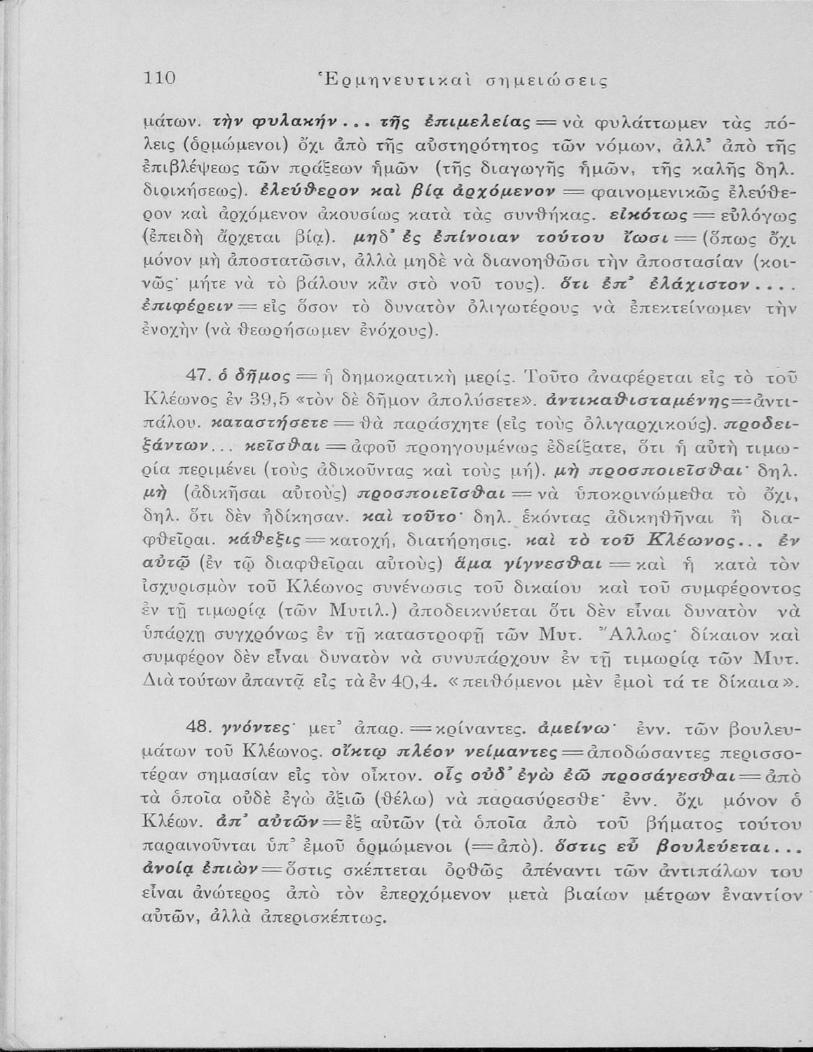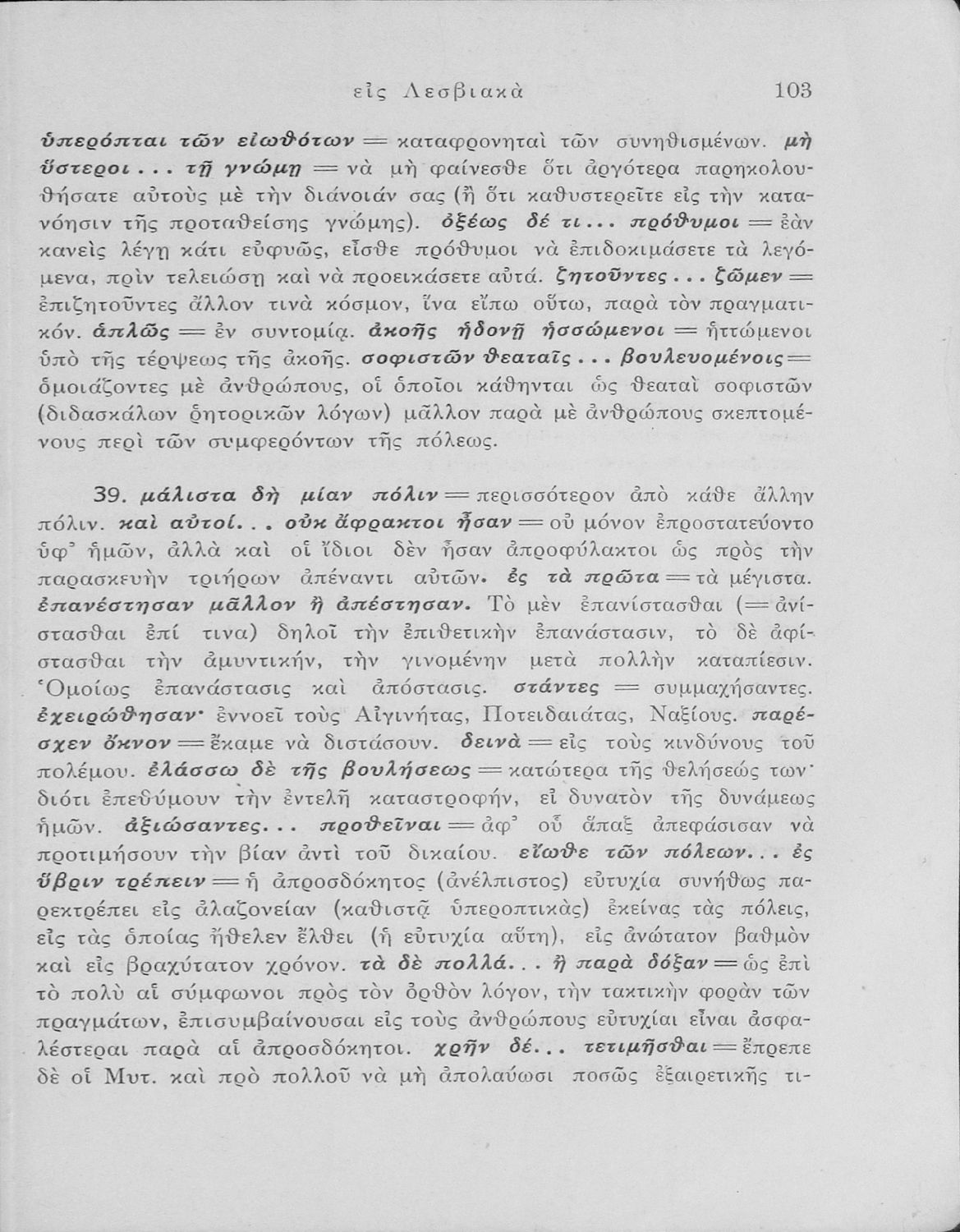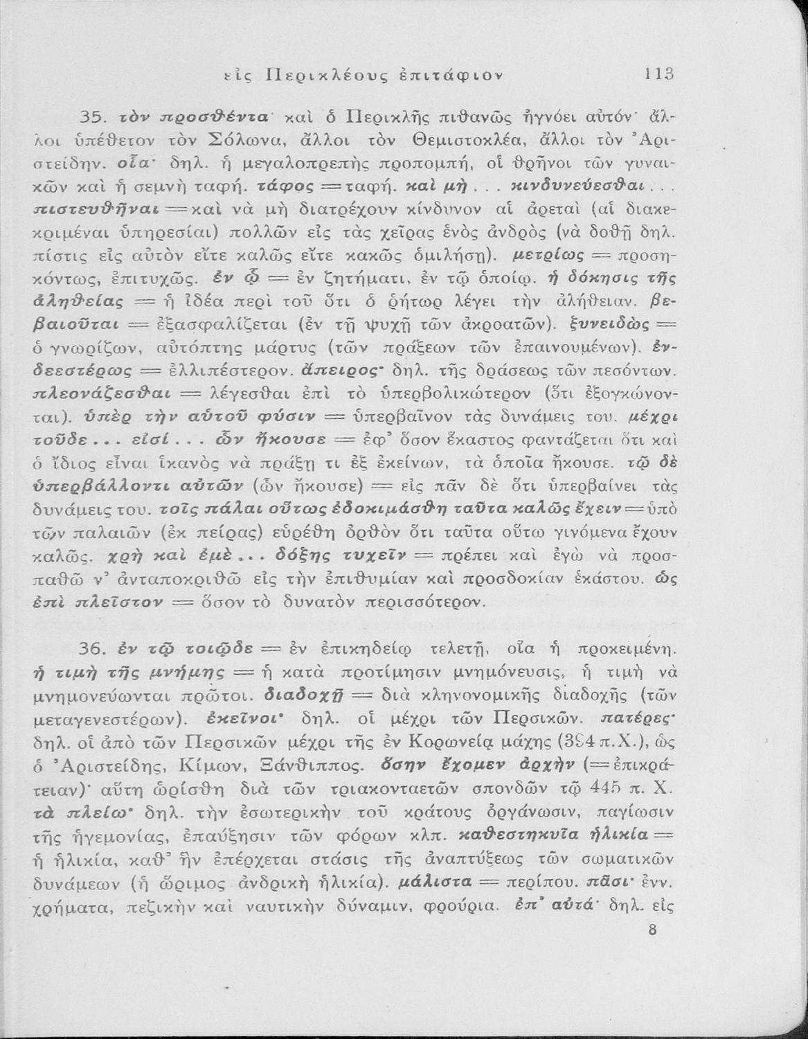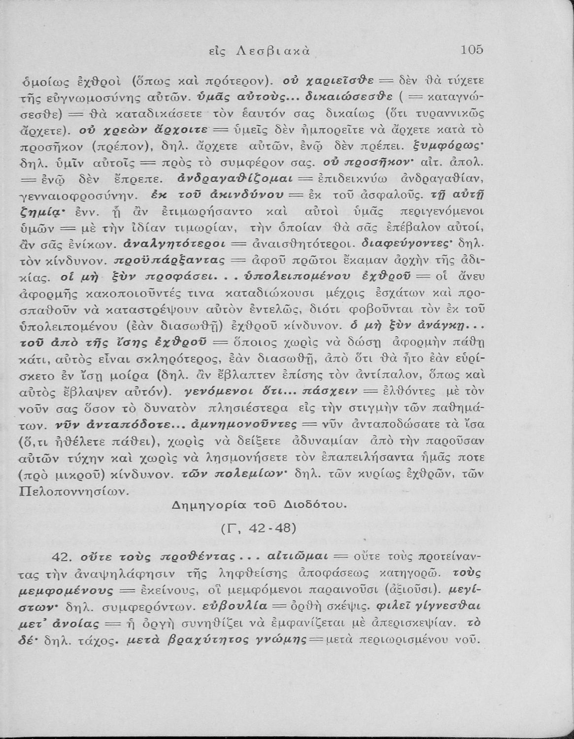 Σχολικό εγχειρίδιο Αρχαίων Ελληνικών για τις Δ΄, Ε΄ και ΣΤ΄ Γυμνασίου παλαιού τύπου που περιλαμβάνει σύντομο βιογραφικό σημείωμα του Θουκυδίδη, περιγραφή του ιστορικού πλαισίου, αποσπάσματα από τα Πλαταϊκά, τα Λεσβιακά και τον Επιτάφιο του Περικλή και ερμηνευτικές σημειώσεις.