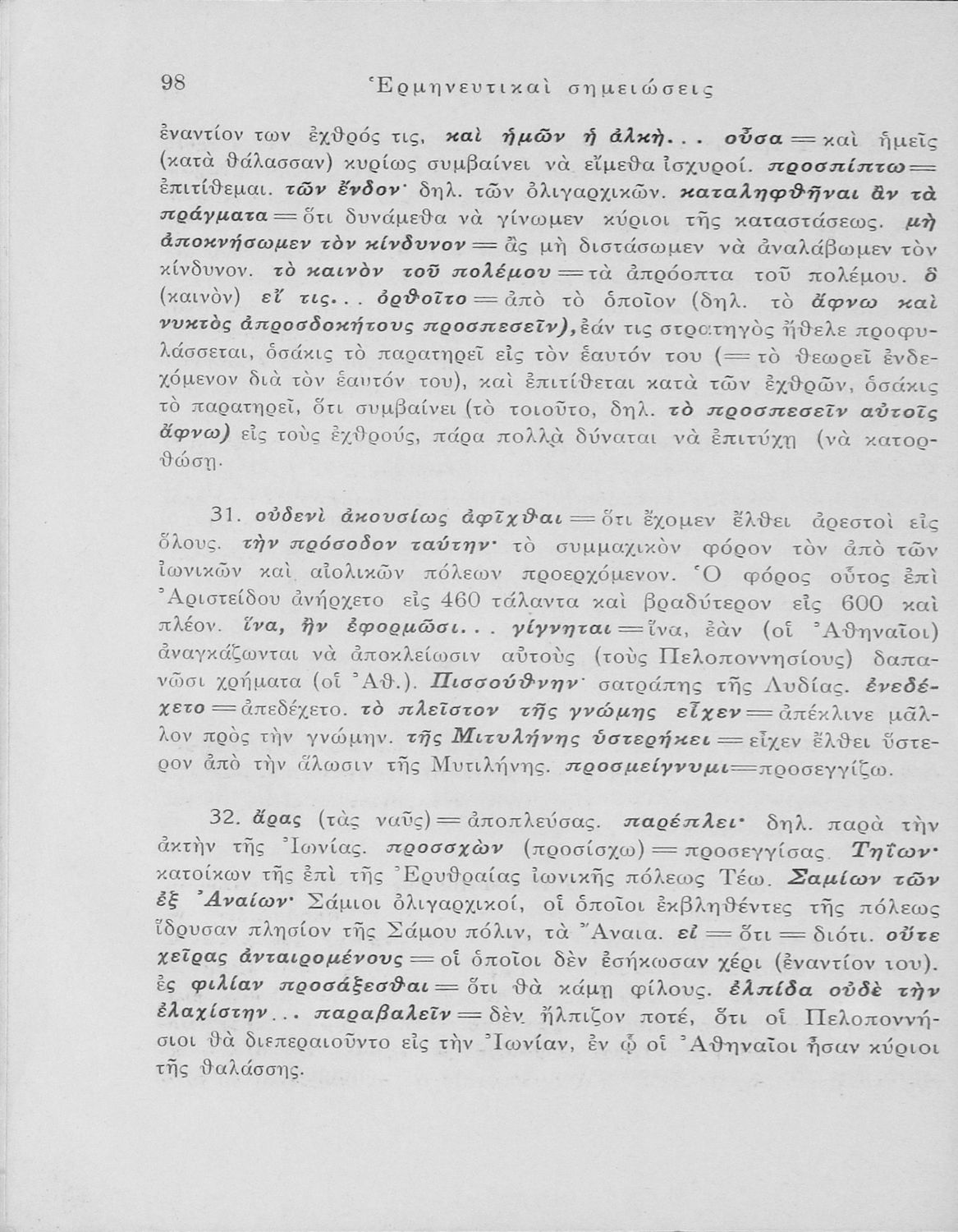 Σχολικό εγχειρίδιο Αρχαίων Ελληνικών Δ΄, Ε΄ και ΣΤ΄ Γυμνασίου που περιέχει αποσπάσματα από το έργο του Θουκυδίδη Ιστορία, ερμηνευτικά και πραγματολογικά σχόλια, και γραμματικές παρατηρήσεις του συγγραφέα.