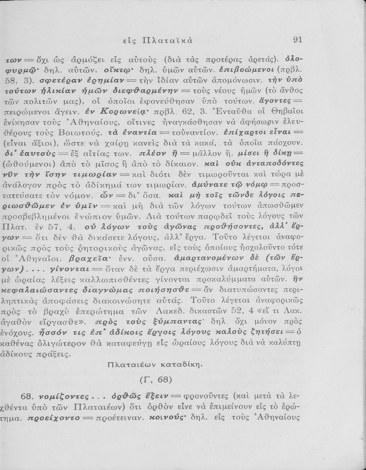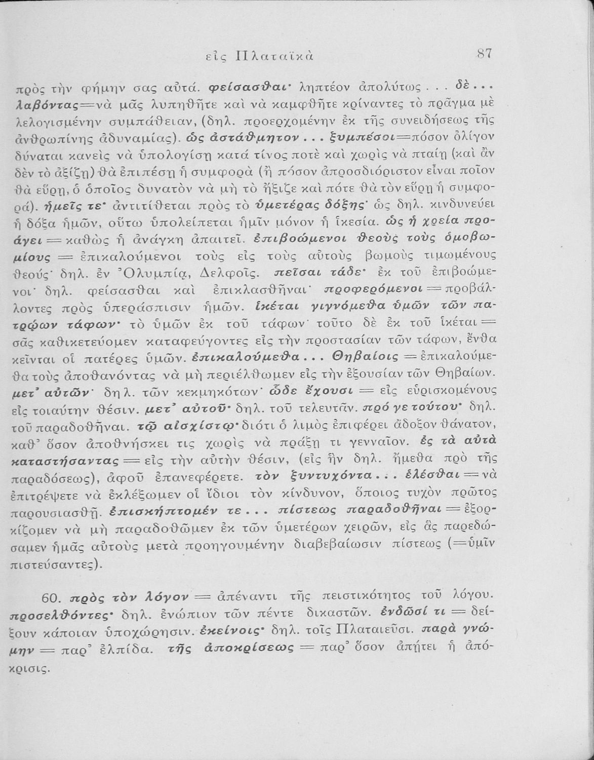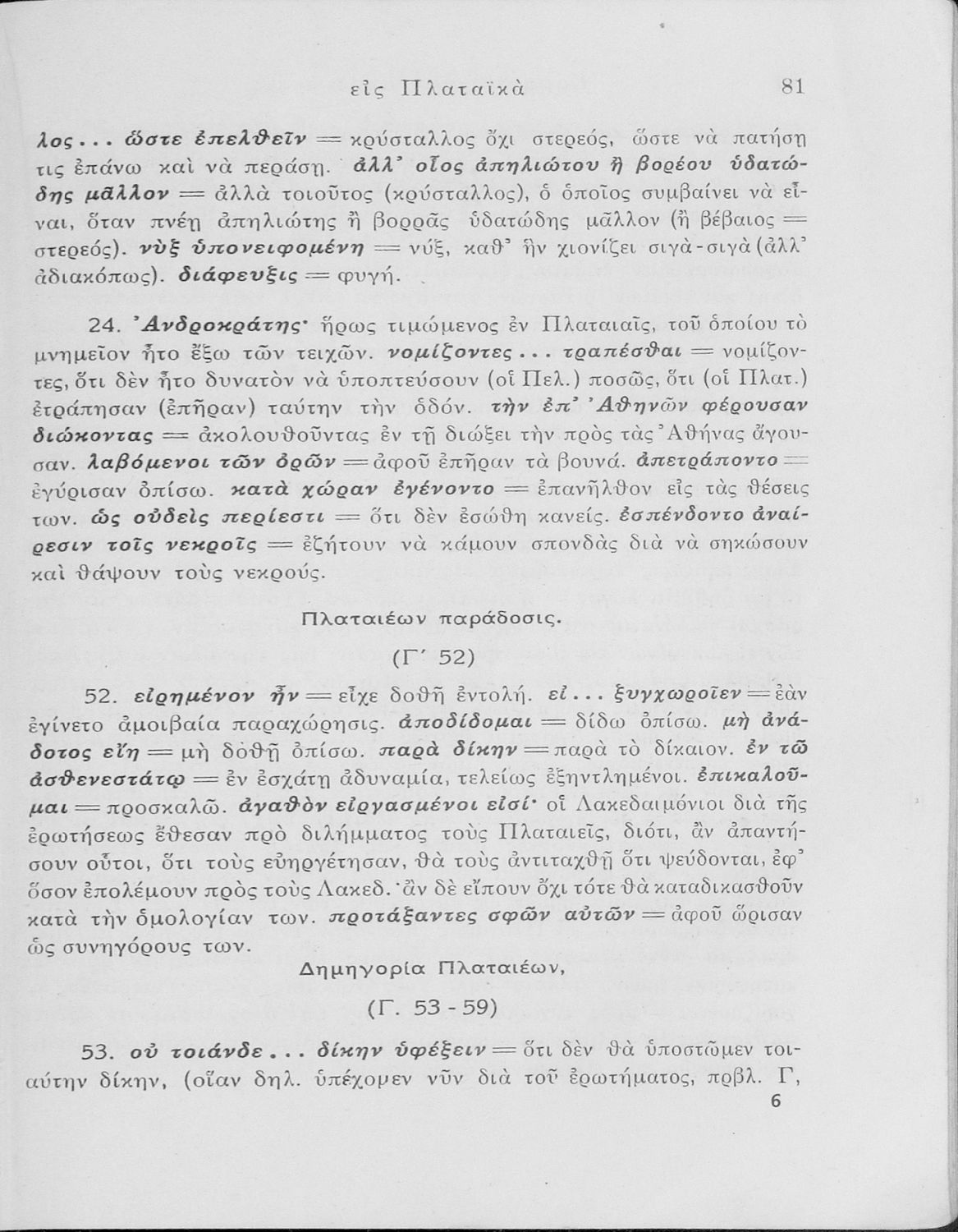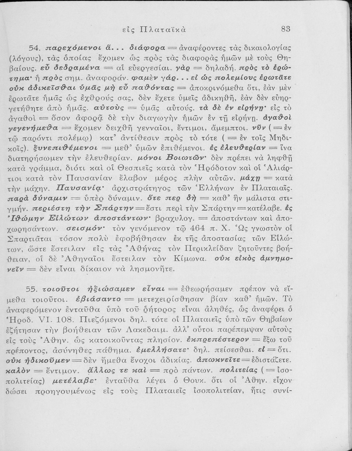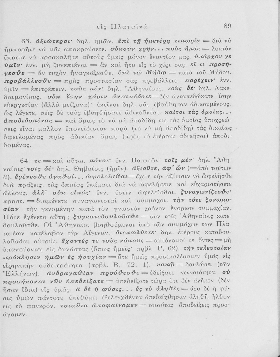 Σχολικό εγχειρίδιο Αρχαίων Ελληνικών για τις Δ΄, Ε΄ και ΣΤ΄ Γυμνασίου παλαιού τύπου που περιλαμβάνει σύντομο βιογραφικό σημείωμα του Θουκυδίδη, περιγραφή του ιστορικού πλαισίου, αποσπάσματα από τα Πλαταϊκά, τα