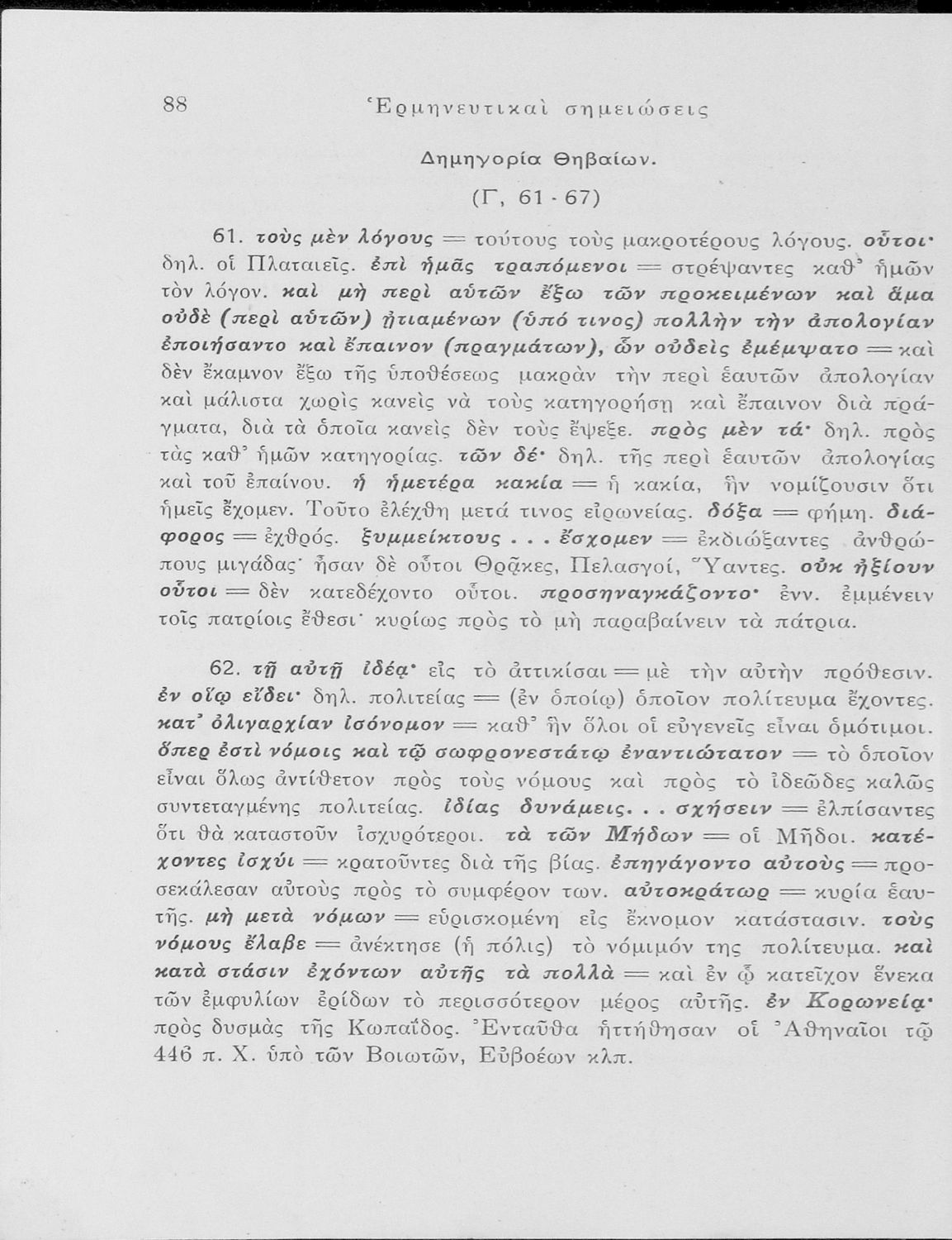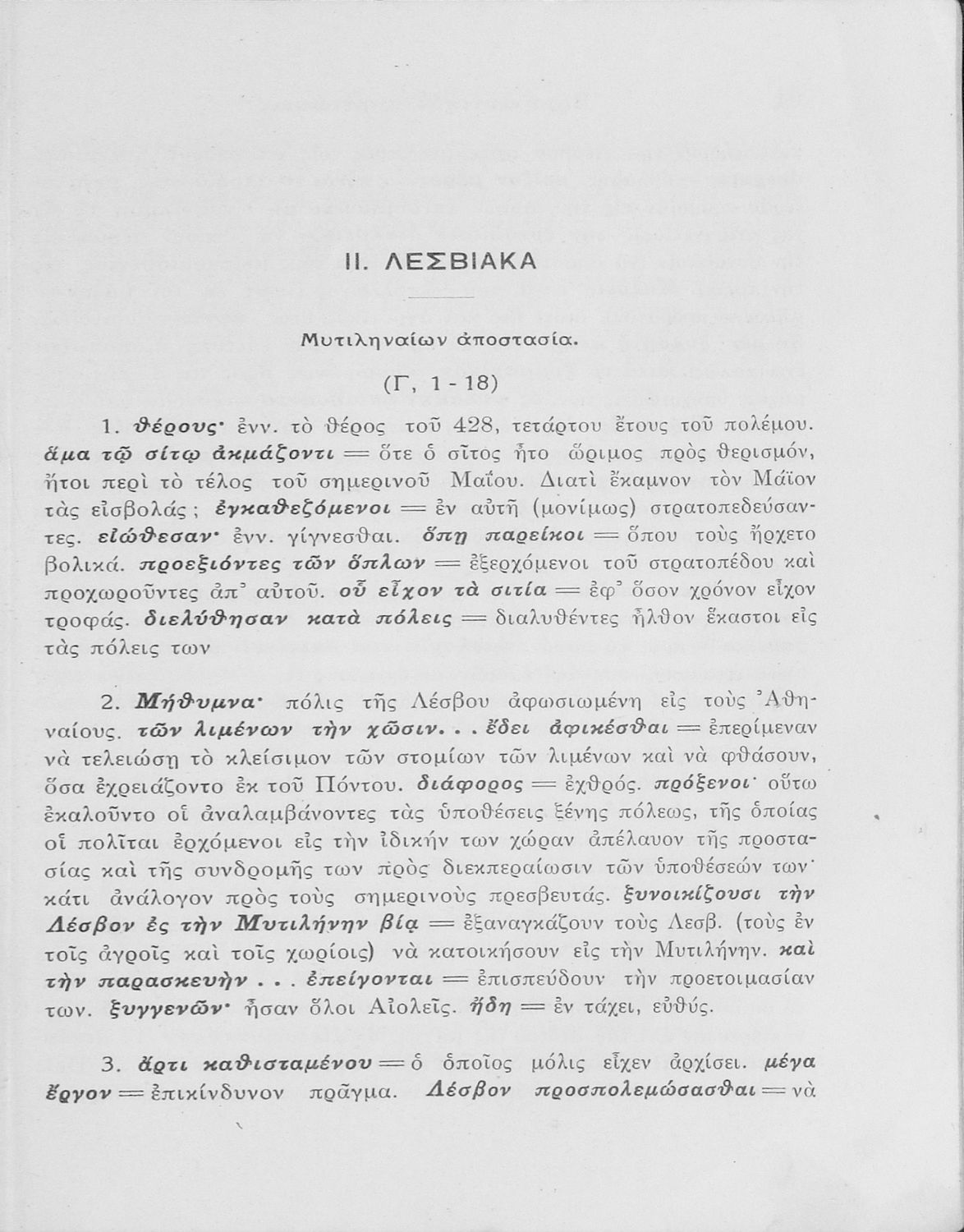 Σχολικό εγχειρίδιο Αρχαίων Ελληνικών για τις Δ΄, Ε΄ και ΣΤ΄ Γυμνασίου παλαιού τύπου που περιλαμβάνει σύντομο βιογραφικό σημείωμα του Θουκυδίδη, περιγραφή του ιστορικού πλαισίου, αποσπάσματα από τα Πλαταϊκά, τα Λεσβιακά και τον Επιτάφιο του Περικλή και ερμηνευτικές σημειώσεις.