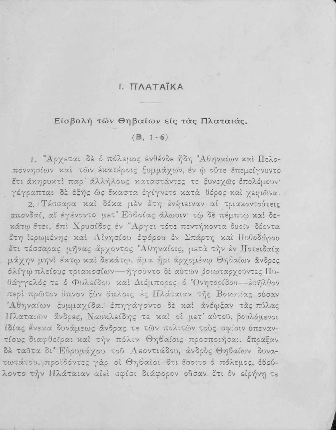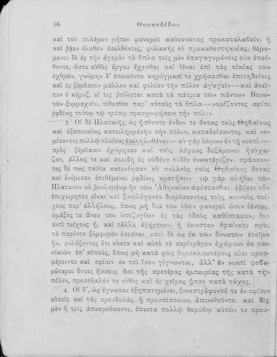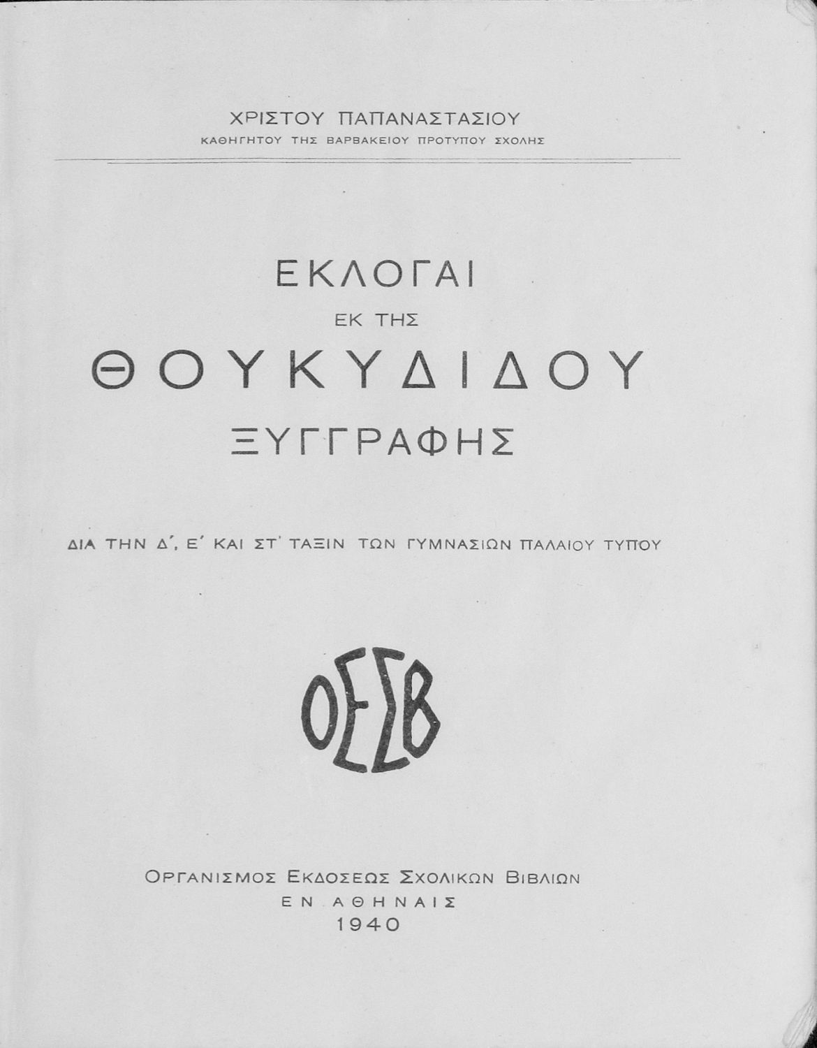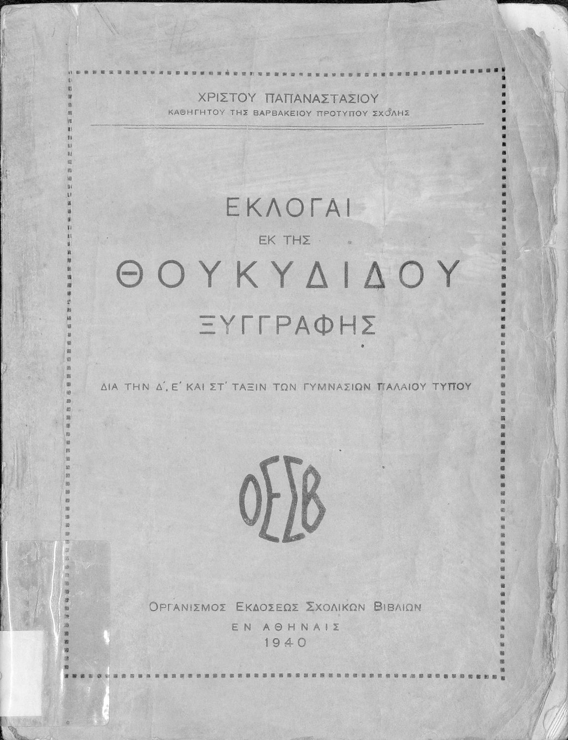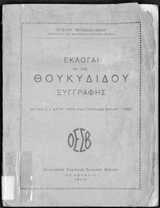 Σχολικό εγχειρίδιο Αρχαίων Ελληνικών για τις Δ΄, Ε΄ και ΣΤ΄ Γυμνασίου παλαιού τύπου που περιλαμβάνει σύντομο βιογραφικό σημείωμα του Θουκυδίδη, περιγραφή του ιστορικού πλαισίου, αποσπάσματα από τα Πλαταϊκά, τα Λεσβιακά και τον Επιτάφιο του Περικλή και ερμηνευτικές σημειώσεις.