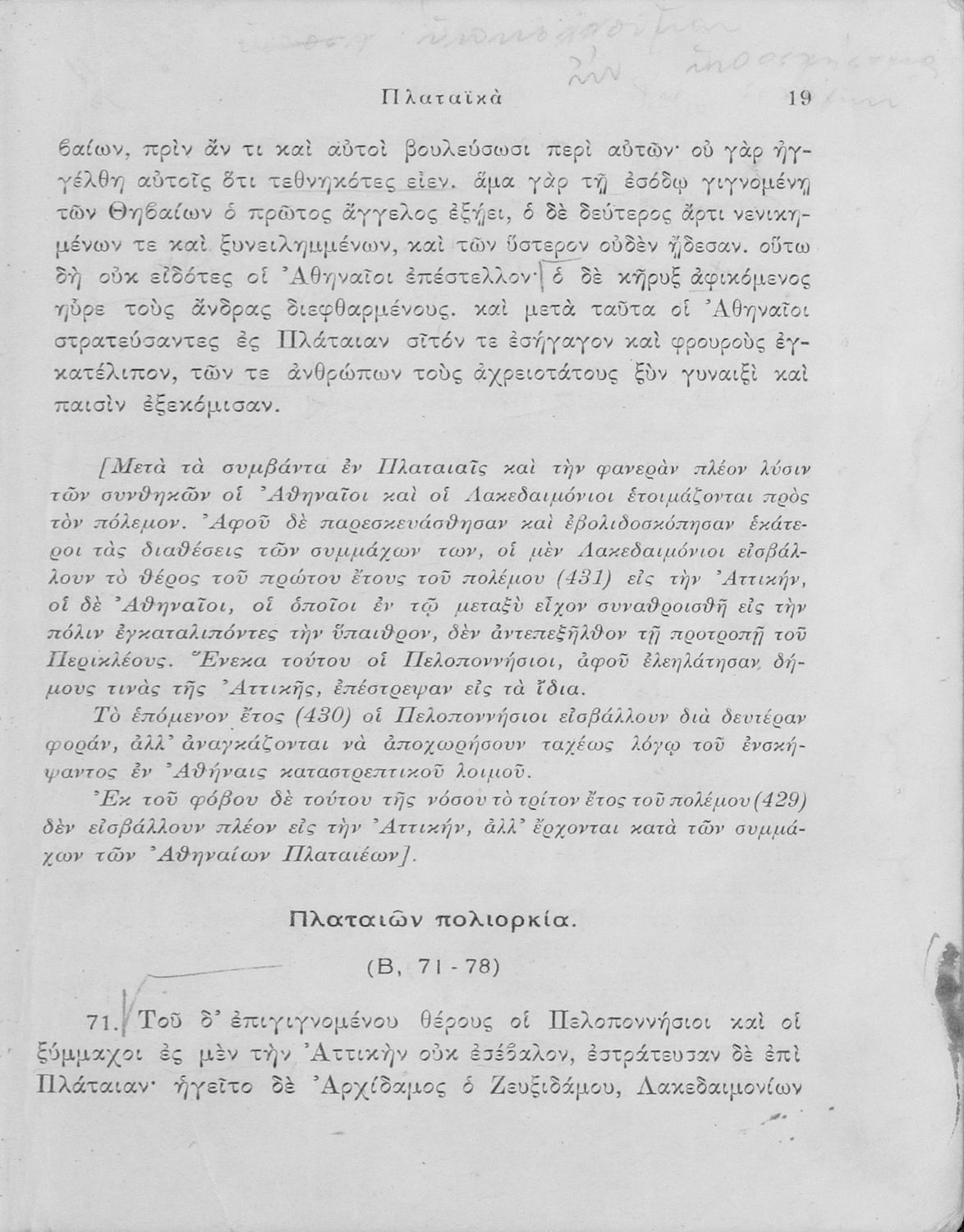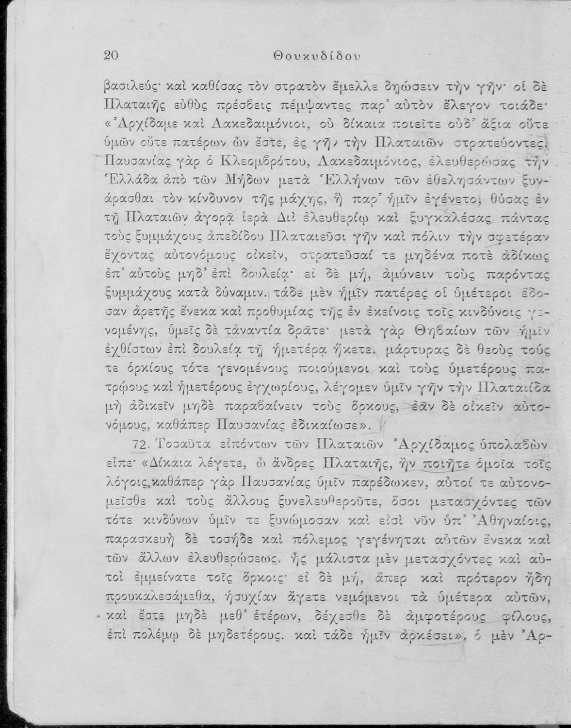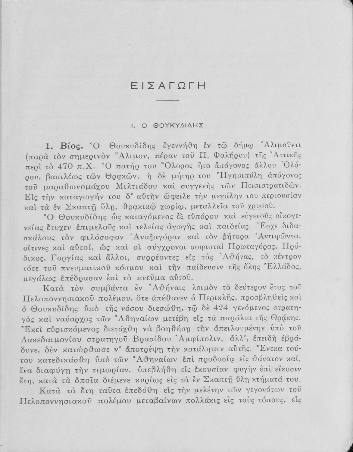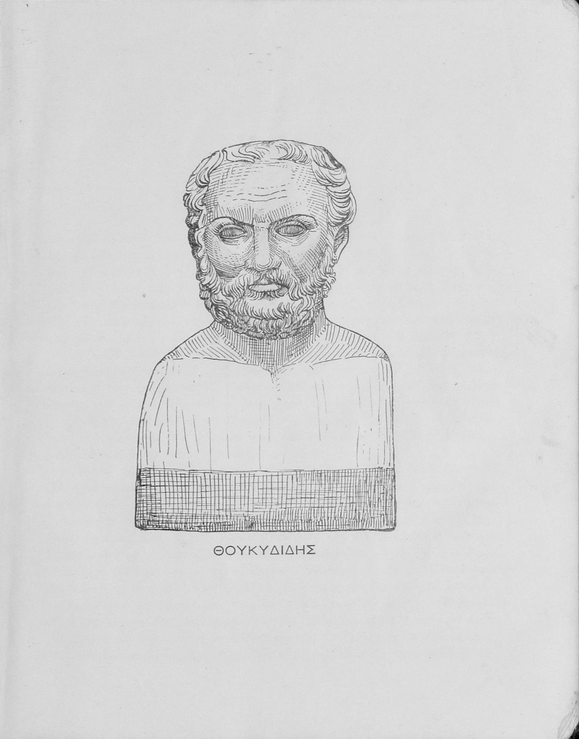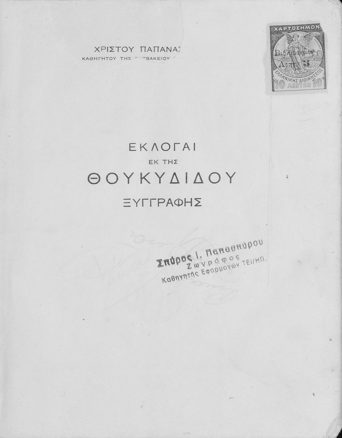 Σχολικό εγχειρίδιο Αρχαίων Ελληνικών για τις Δ΄, Ε΄ και ΣΤ΄ Γυμνασίου παλαιού τύπου που περιλαμβάνει σύντομο βιογραφικό σημείωμα του Θουκυδίδη, περιγραφή του ιστορικού πλαισίου, αποσπάσματα από τα Πλαταϊκά, τα Λεσβιακά και τον Επιτάφιο του Περικλή και ερμηνευτικές σημειώσεις.