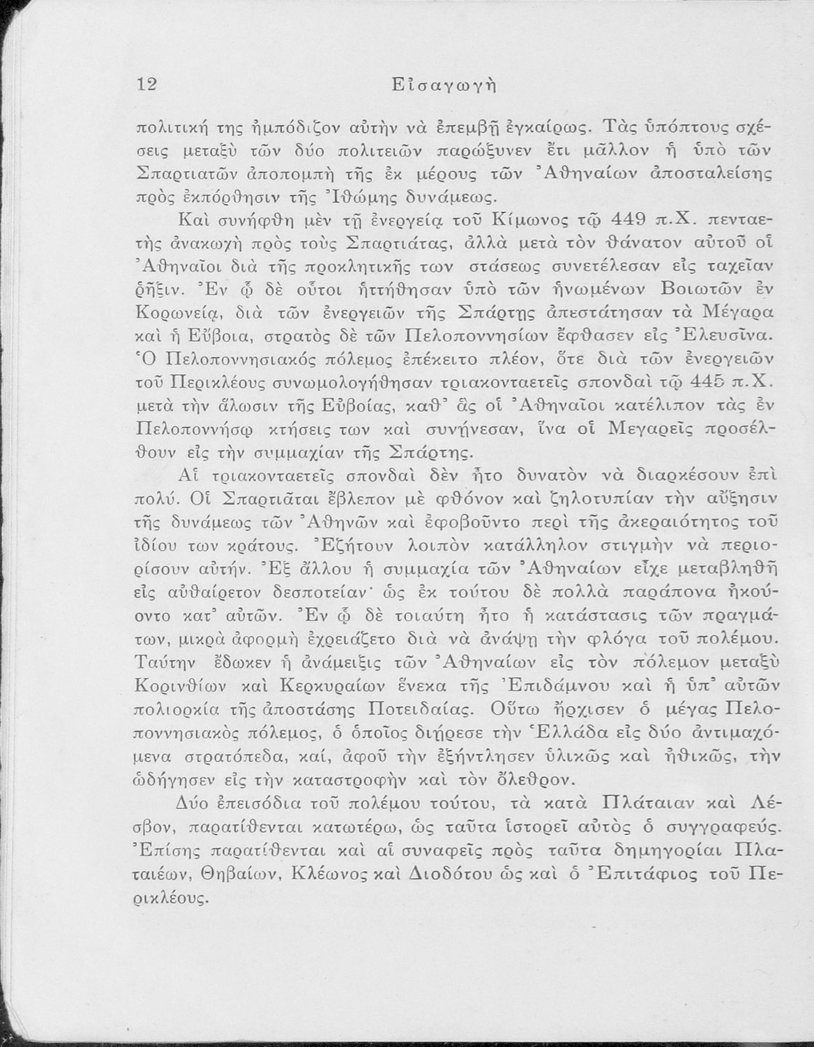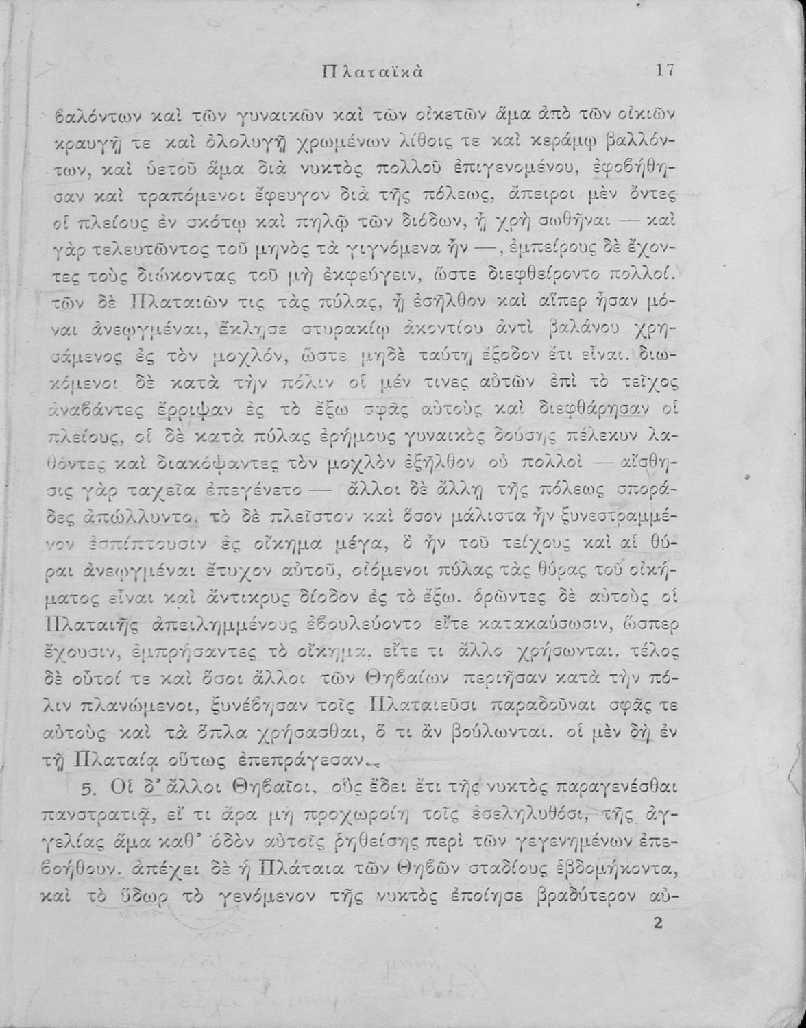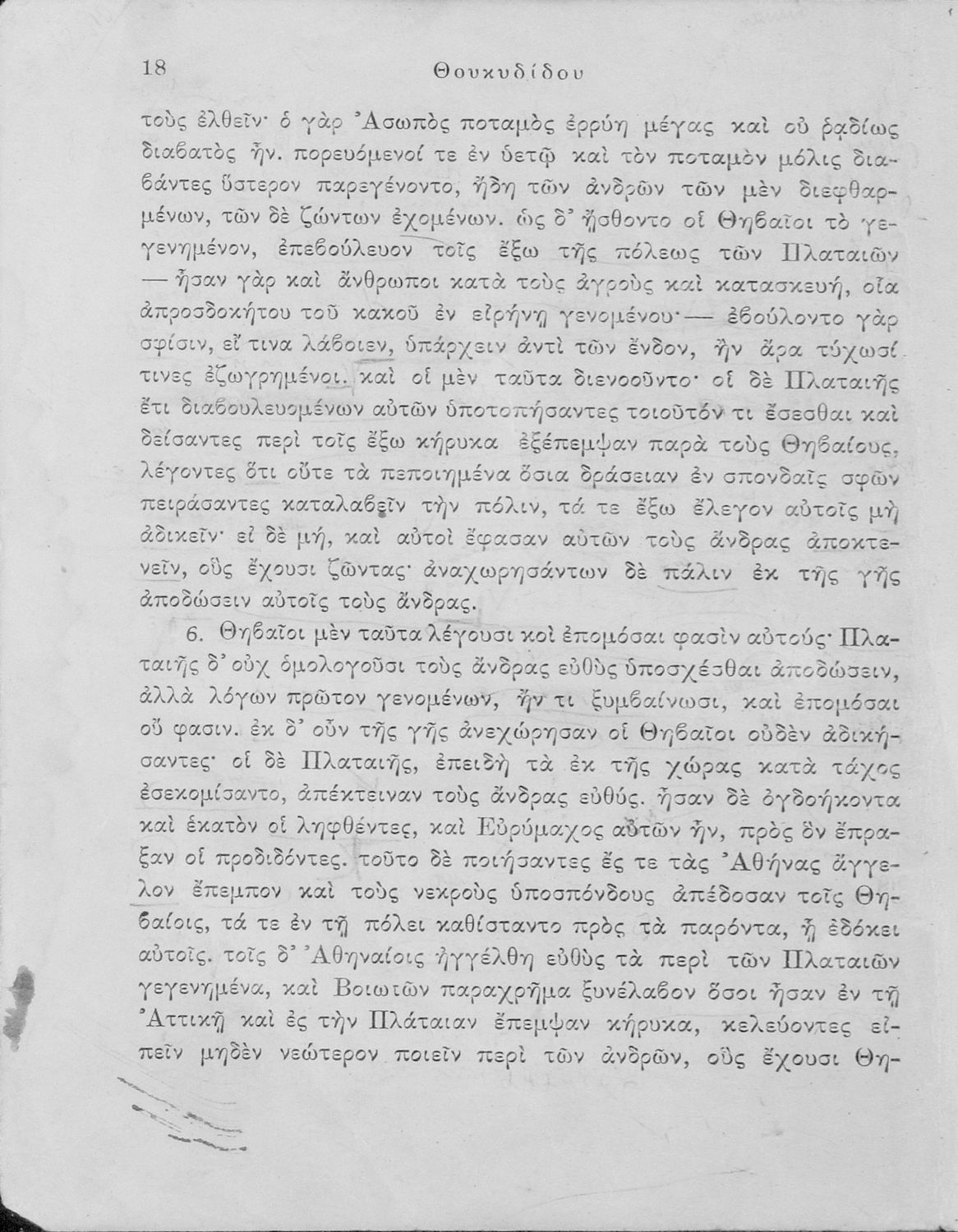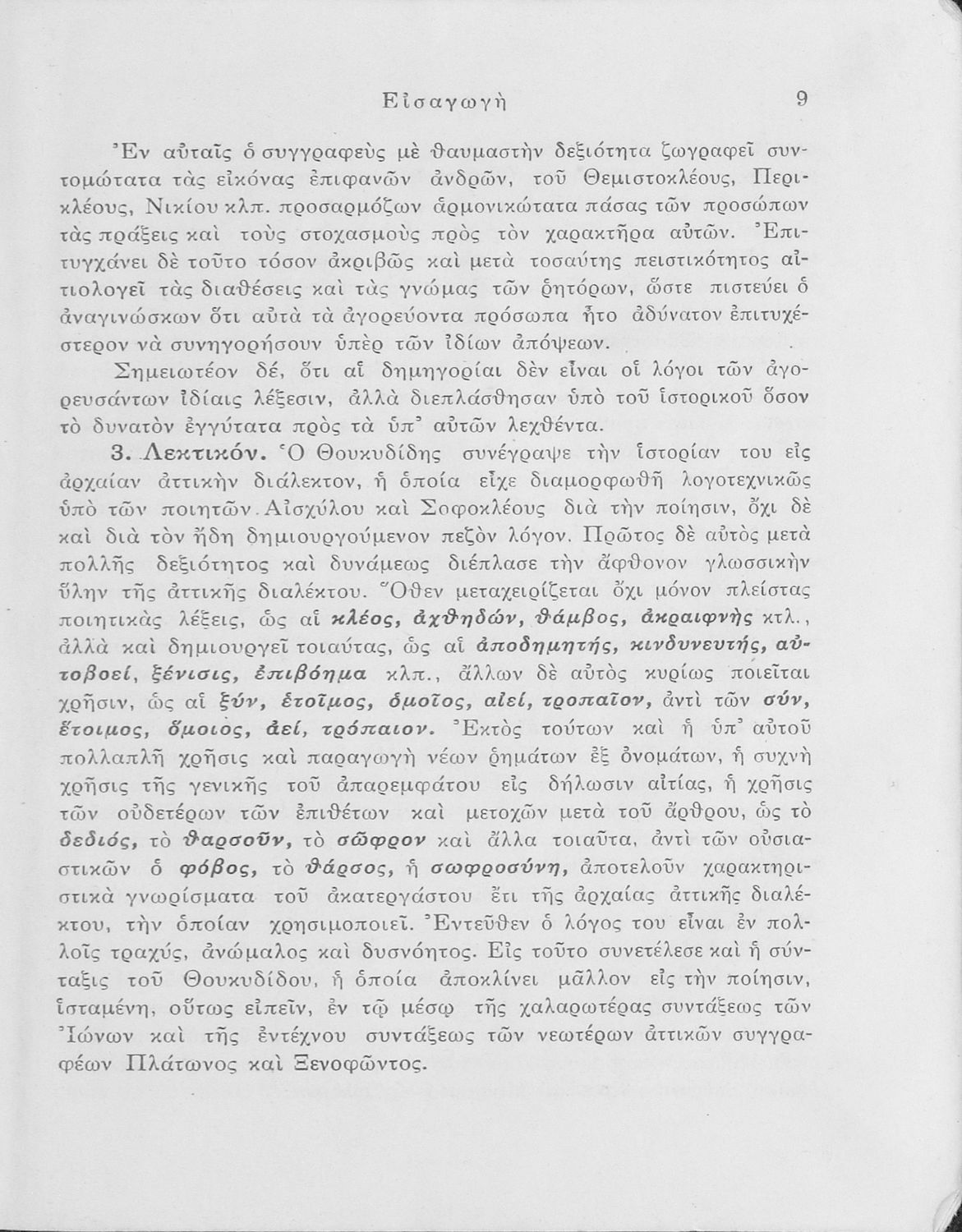 Σχολικό εγχειρίδιο Αρχαίων Ελληνικών για τις Δ΄, Ε΄ και ΣΤ΄ Γυμνασίου παλαιού τύπου που περιλαμβάνει σύντομο βιογραφικό σημείωμα του Θουκυδίδη, περιγραφή του ιστορικού πλαισίου, αποσπάσματα από τα Πλαταϊκά, τα Λεσβιακά και τον Επιτάφιο του Περικλή και ερμηνευτικές σημειώσεις.