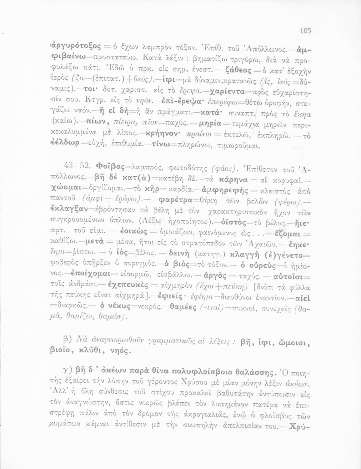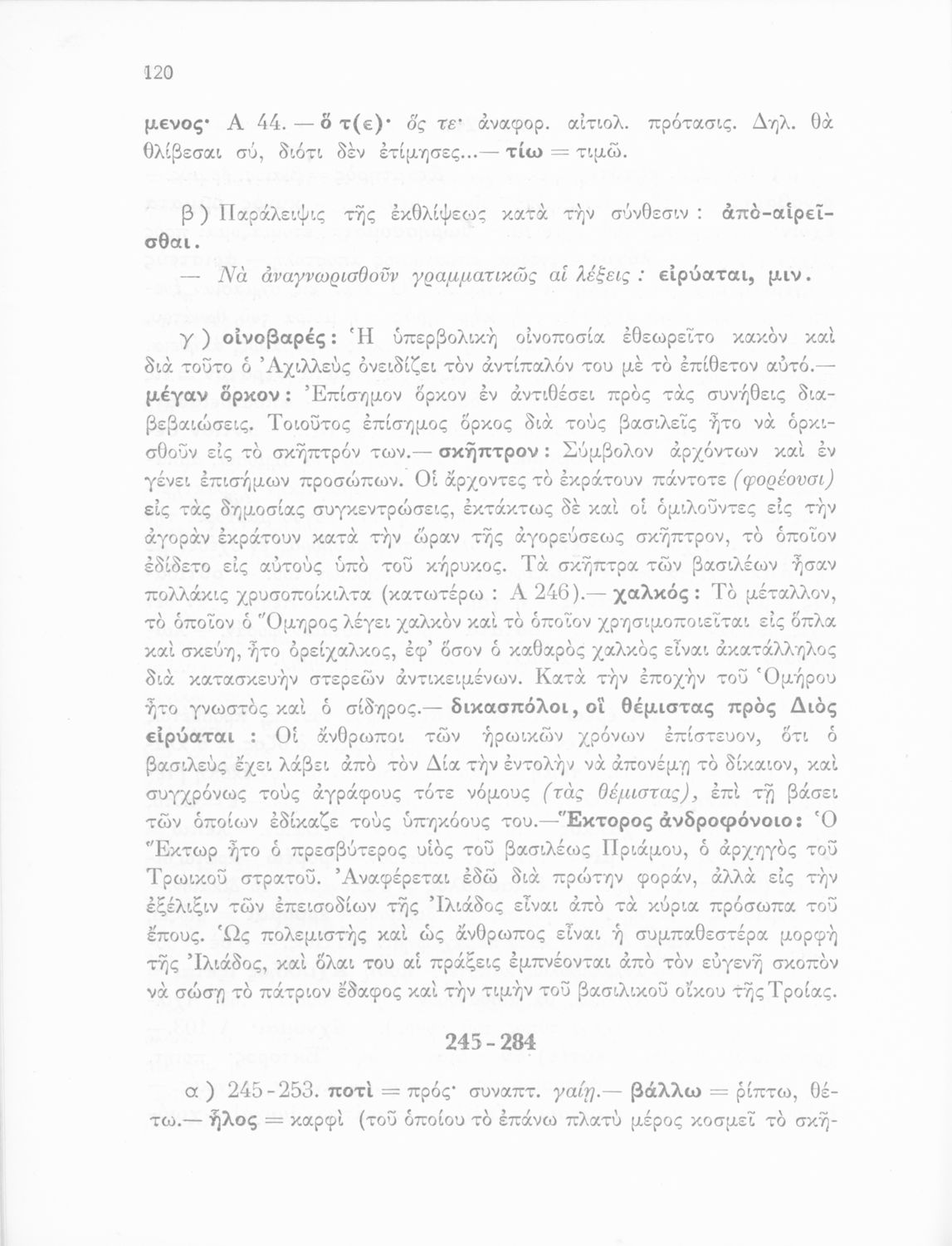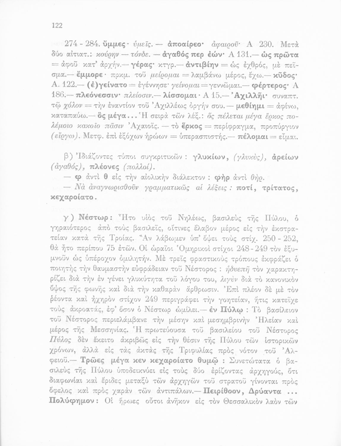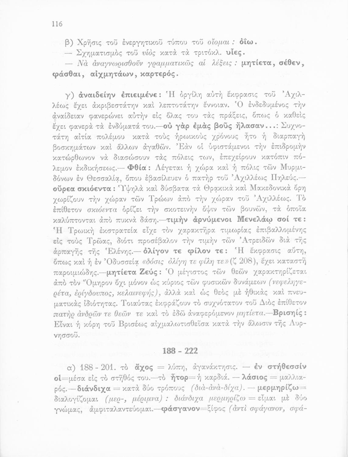 Μαθητικό βοήθημα του Ελληνικού Σχολείου, των Παρθεναγωγείων και του Γυμνασίου για το μάθημα των Αρχαίων Ελληνικών. Περιέχει τις ραψωδίες Ο, Π, Ρ, Σ, Τ, Χ, ψ, Ω από το πρωτότυπο με σχόλια και ερμηνευτικές ...