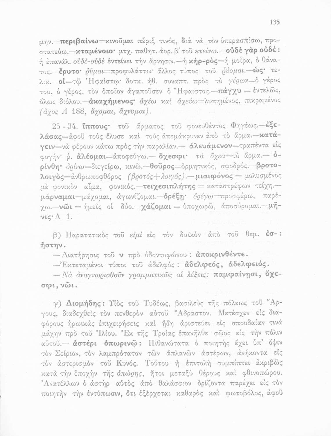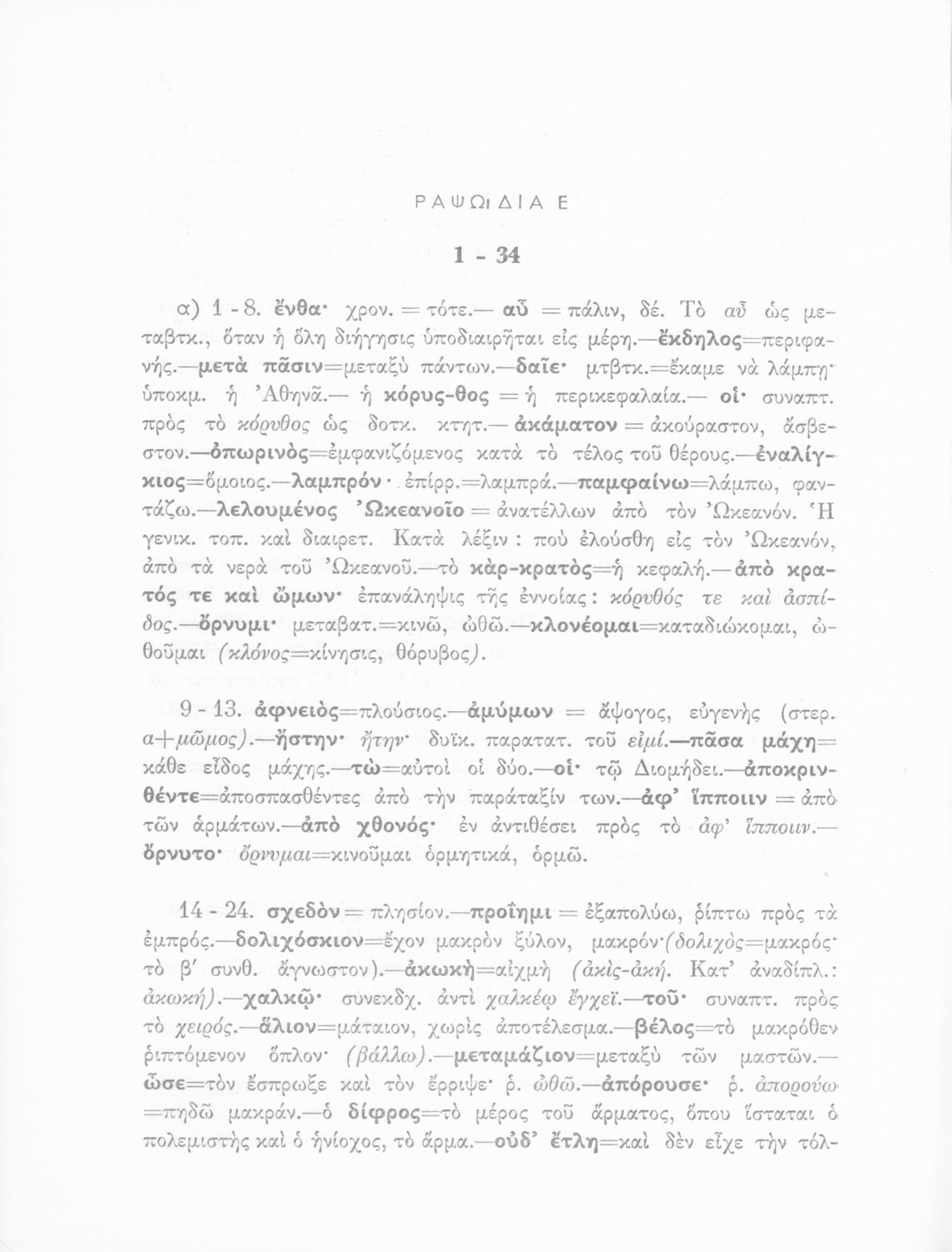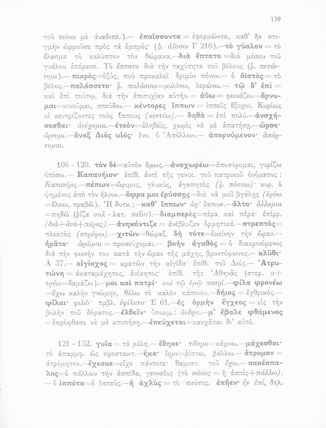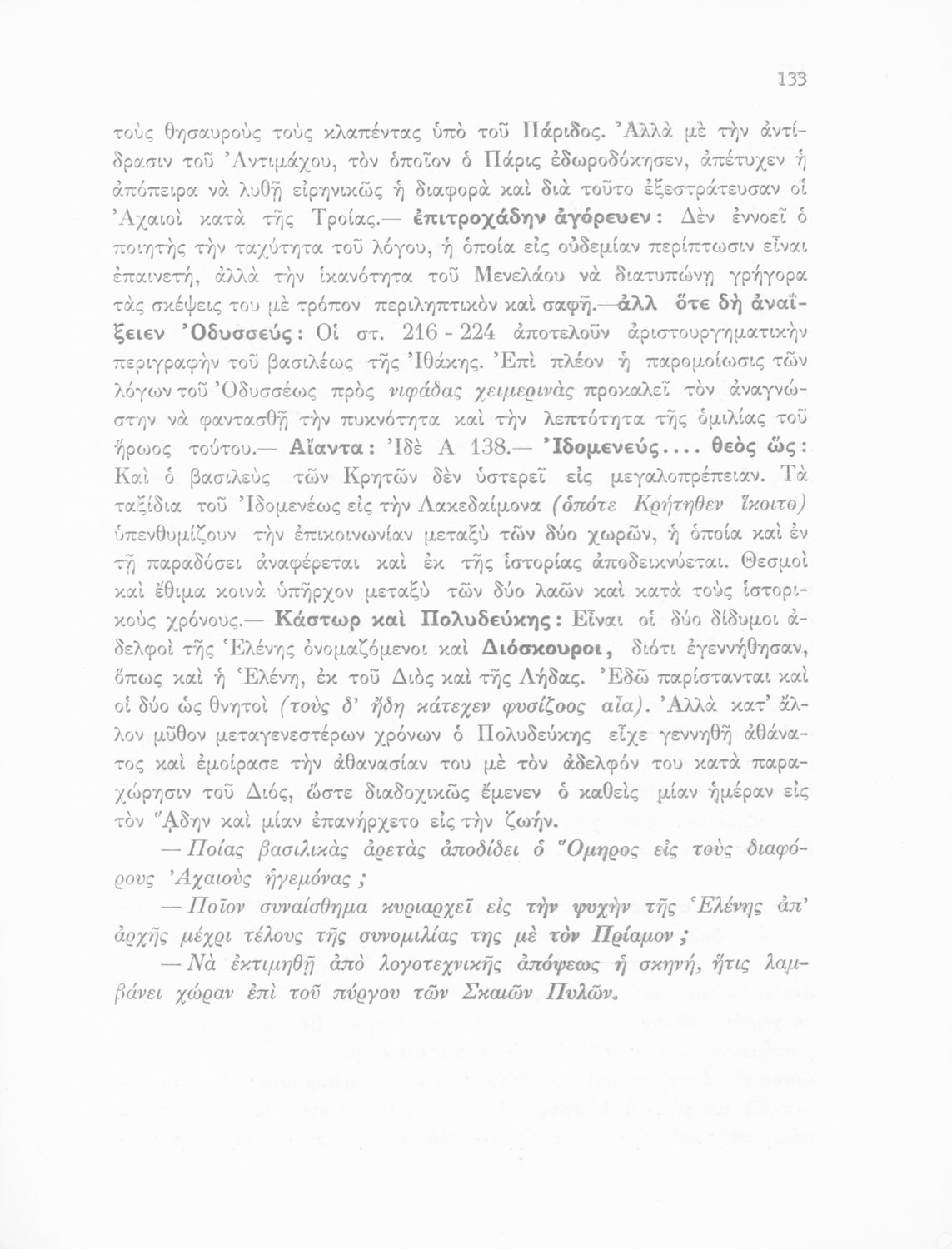 Μαθητικό βοήθημα του Ελληνικού Σχολείου, των Παρθεναγωγείων και του Γυμνασίου για το μάθημα των Αρχαίων Ελληνικών. Περιέχει τις ραψωδίες Ο, Π, Ρ, Σ, Τ, Χ, ψ, Ω από το πρωτότυπο με σχόλια και ερμηνευτικές ...