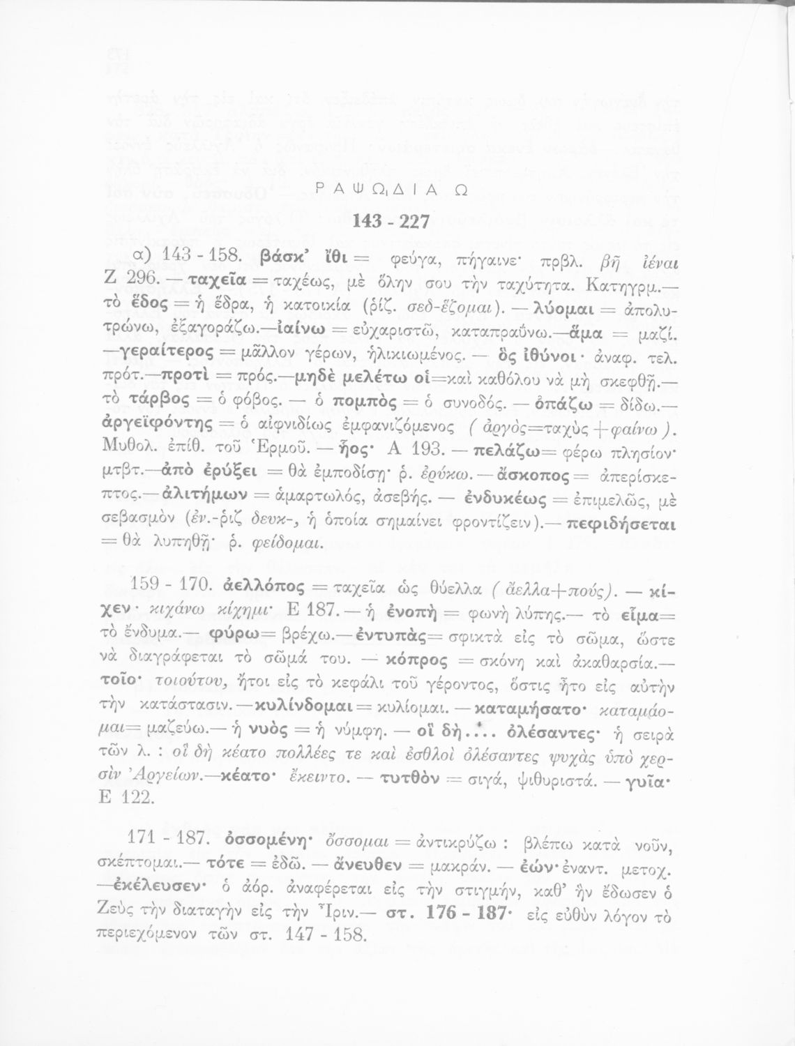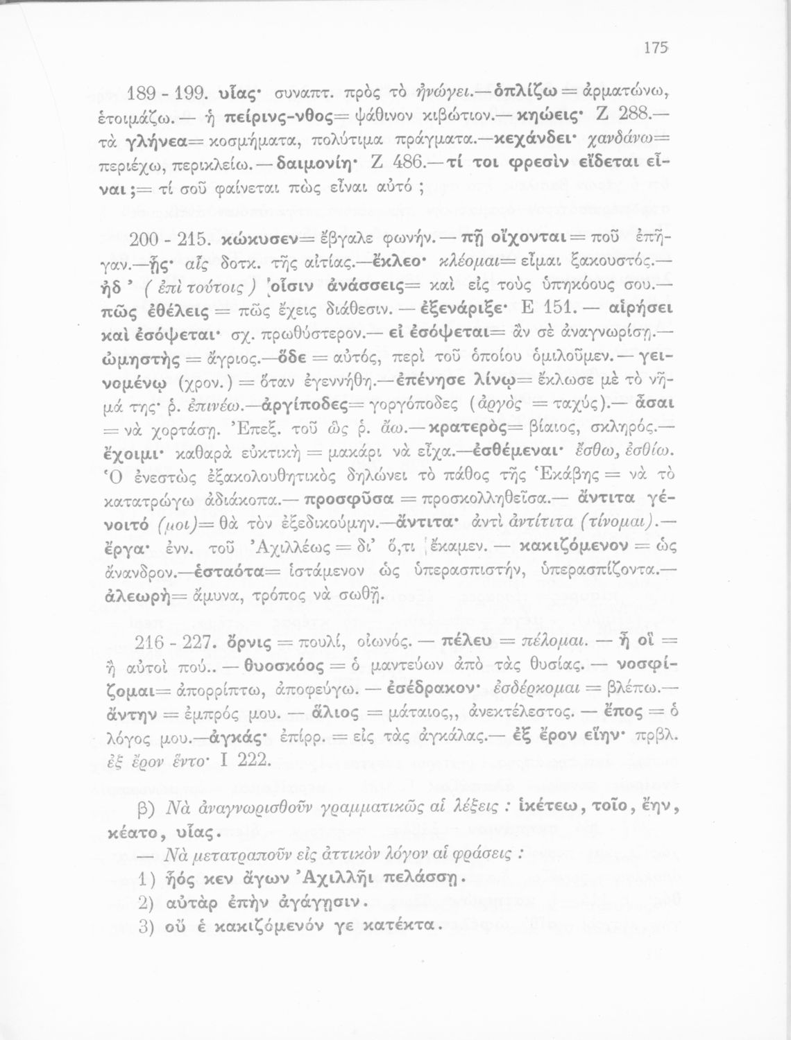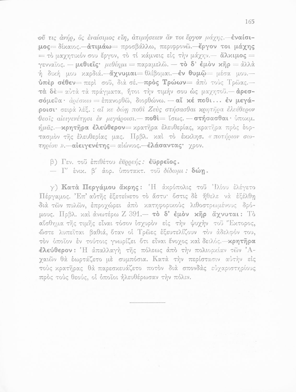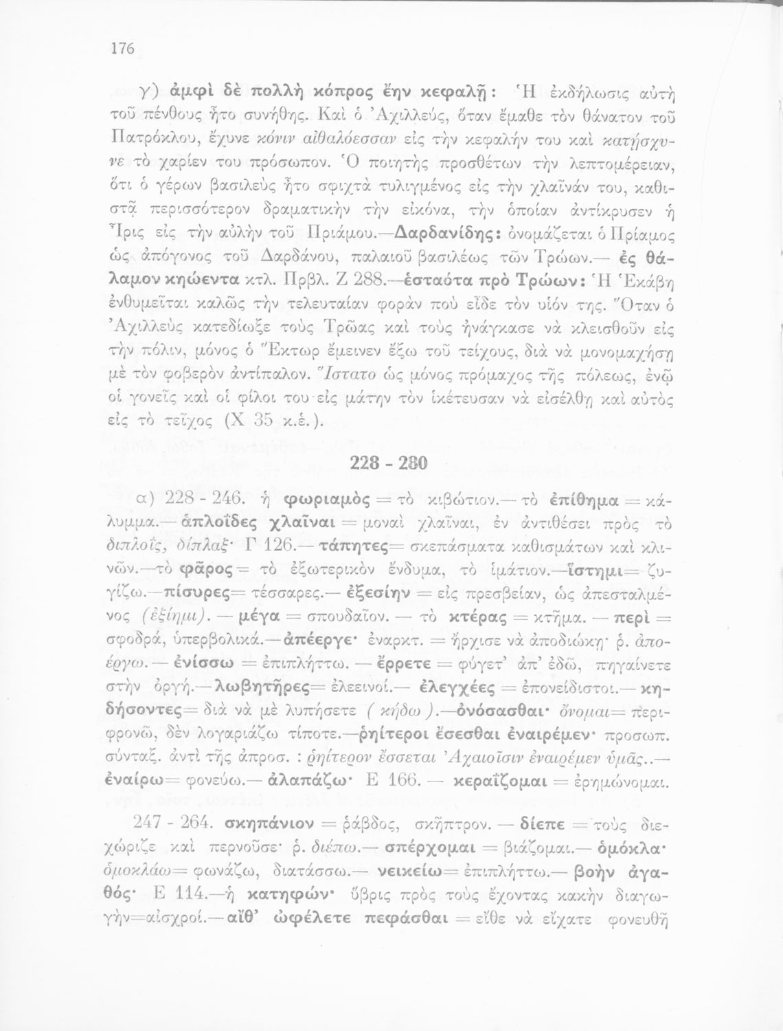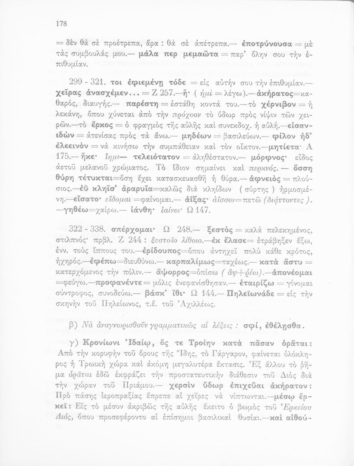 Μαθητικό βοήθημα του Ελληνικού Σχολείου, των Παρθεναγωγείων και του Γυμνασίου για το μάθημα των Αρχαίων Ελληνικών. Περιέχει τις ραψωδίες Ο, Π, Ρ, Σ, Τ, Χ, ψ, Ω από το πρωτότυπο με σχόλια και ερμηνευτικές ...
