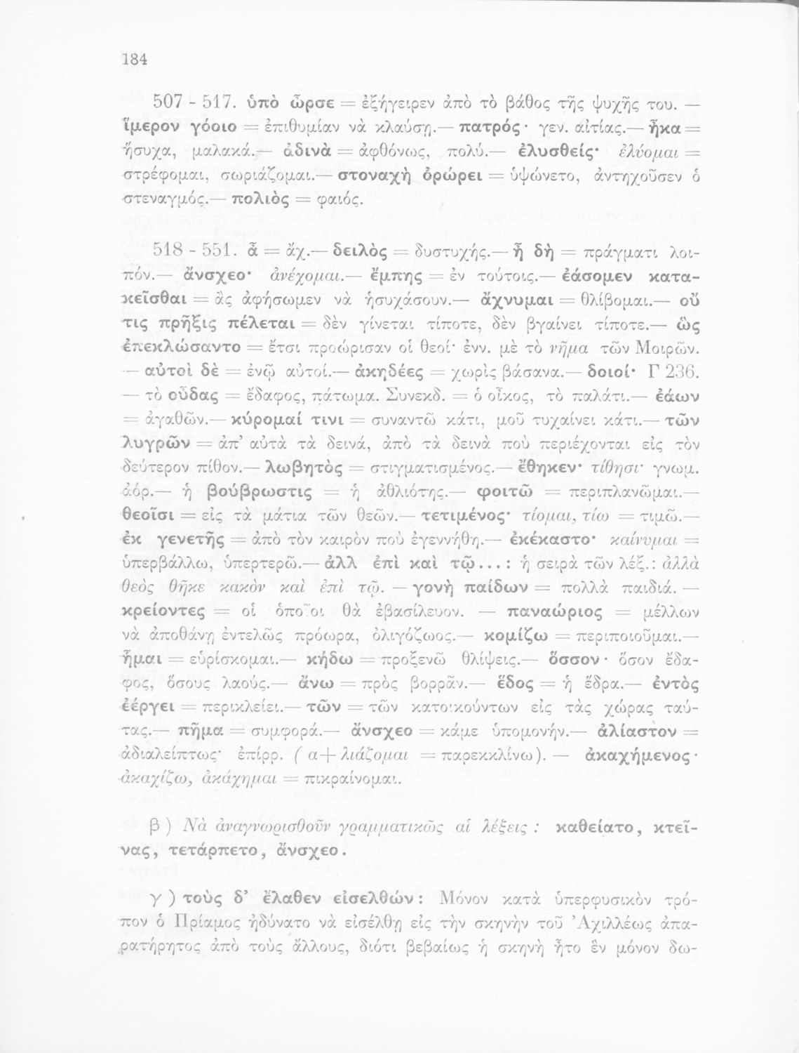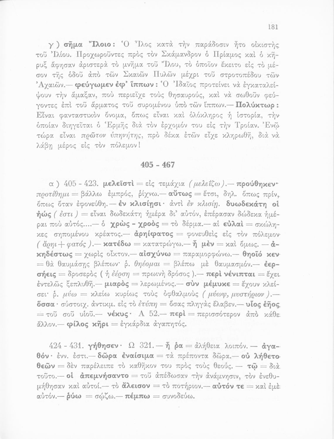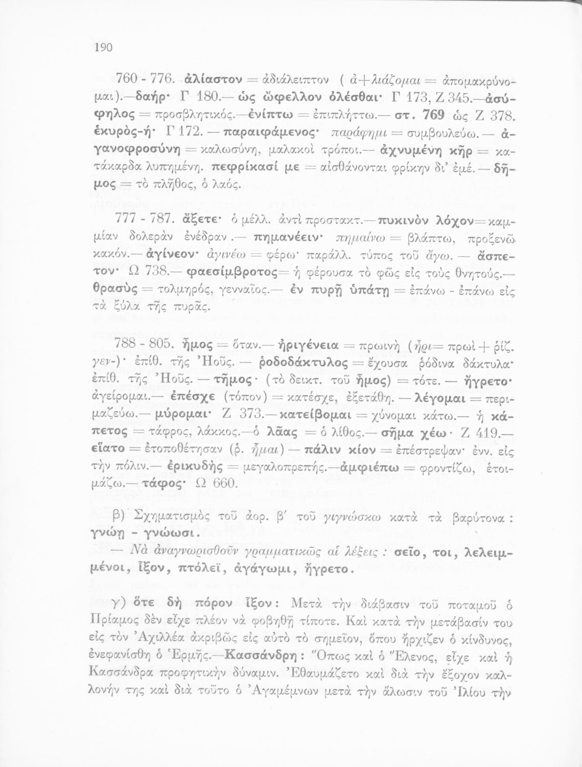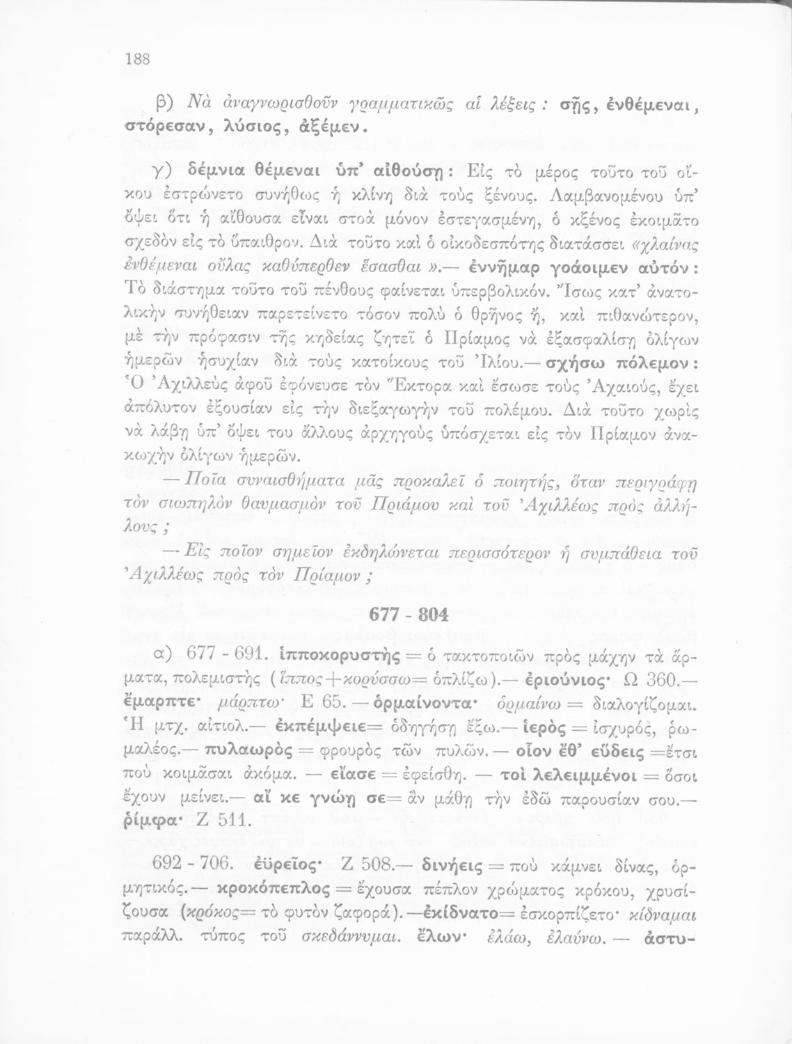 Μαθητικό βοήθημα του Ελληνικού Σχολείου, των Παρθεναγωγείων και του Γυμνασίου για το μάθημα των Αρχαίων Ελληνικών. Περιέχει τις ραψωδίες Ο, Π, Ρ, Σ, Τ, Χ, ψ, Ω από το πρωτότυπο με σχόλια και ερμηνευτικές ...
