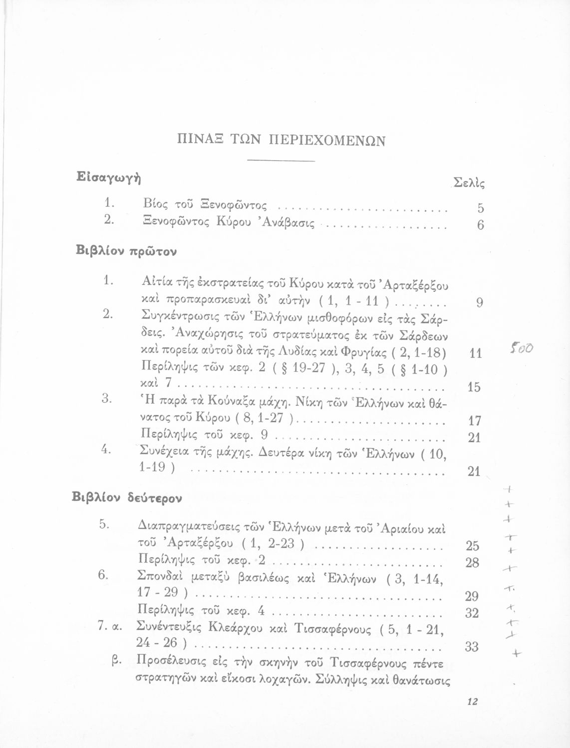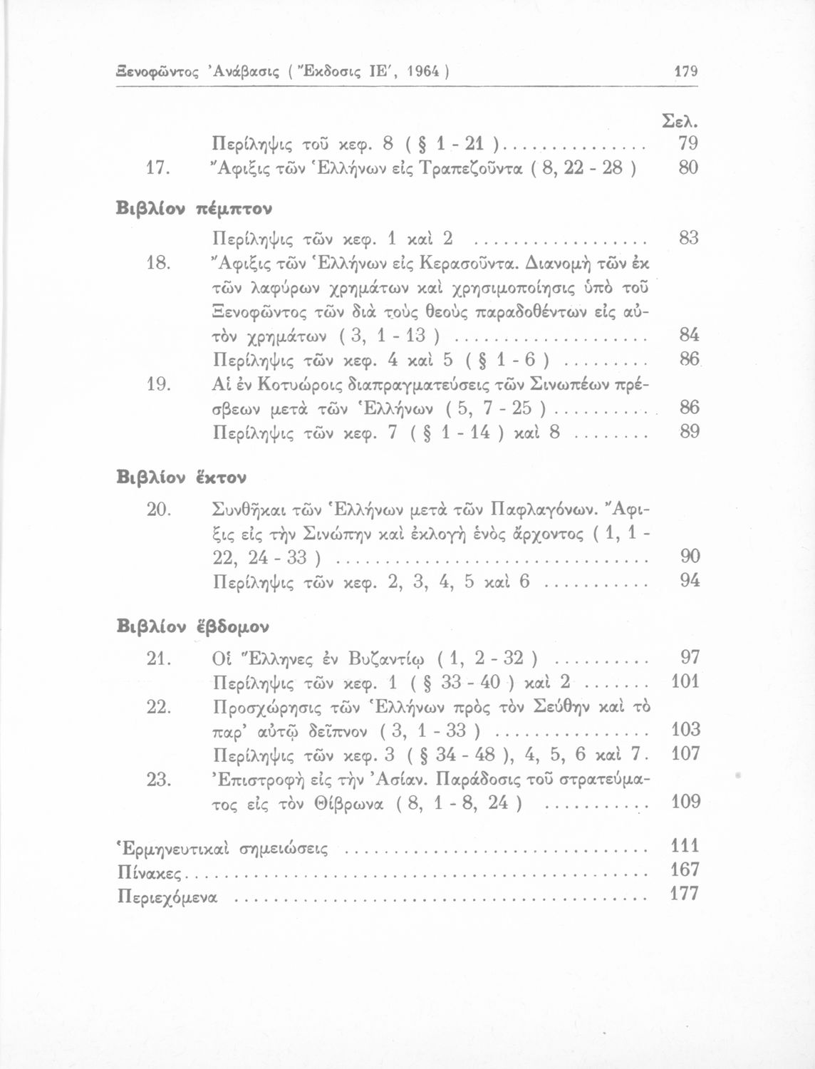 Το σύγγραμμα ήταν σχολικό εγχειρίδιο για το μάθημα των Αρχαίων Ελληνικών στο Γυμνάσιο. Περιλαμβάνει το πρωτότυπο κείμενο από το έργο του Ξενοφώντα, καθώς και ερμηνευτικές και λεξιλογικές παρατηρήσεις του ...