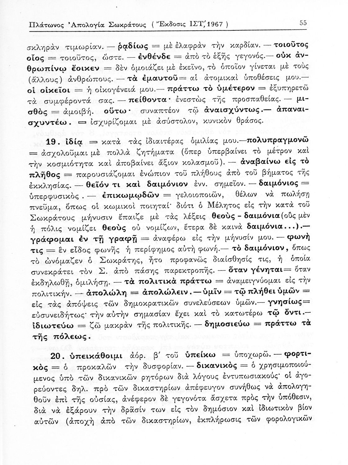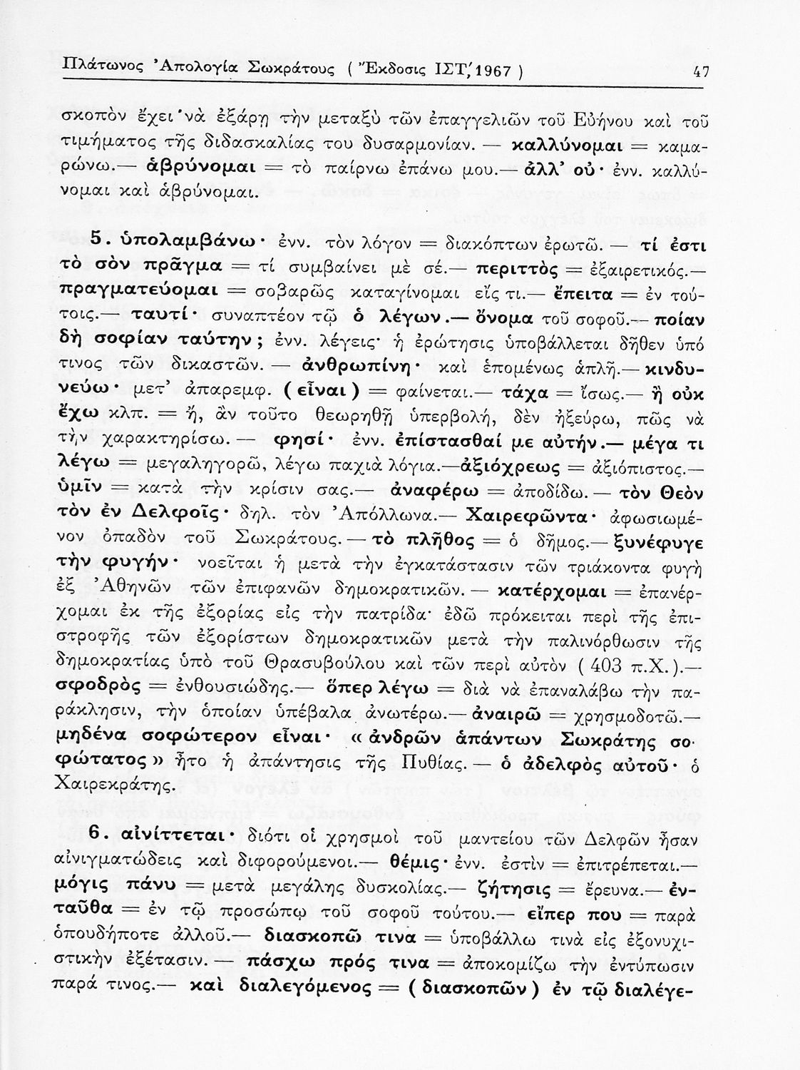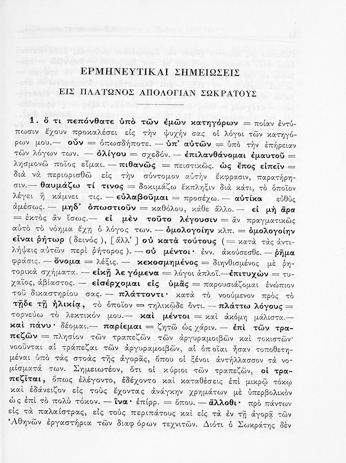 Σχολικό εγχειρίδιο Αρχαίων Ελληνικών από το κείμενο του Πλάτωνα. Περιέχονται ερμηνευτικά σχόλια του συγγραφέα στη καθαρεύουσα. Απεικονίζεται το σύμβολο της Επταετίας.
