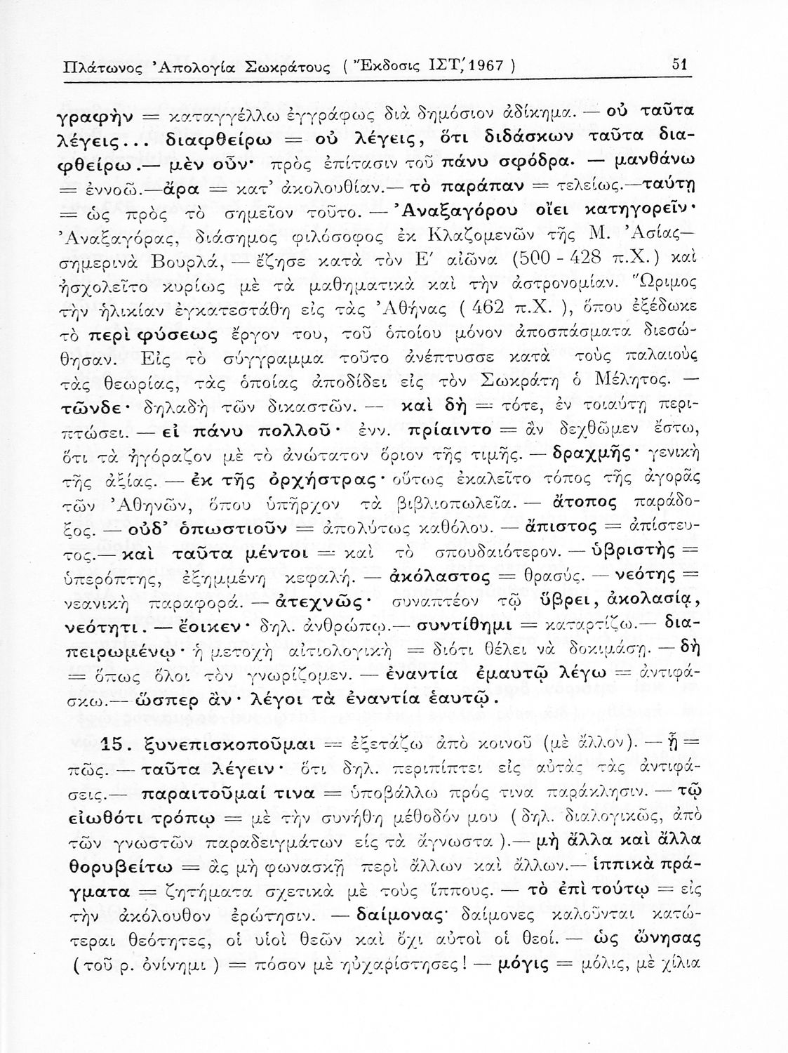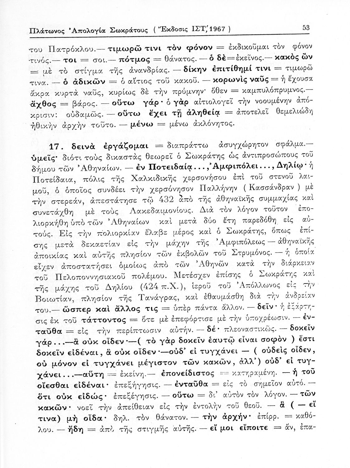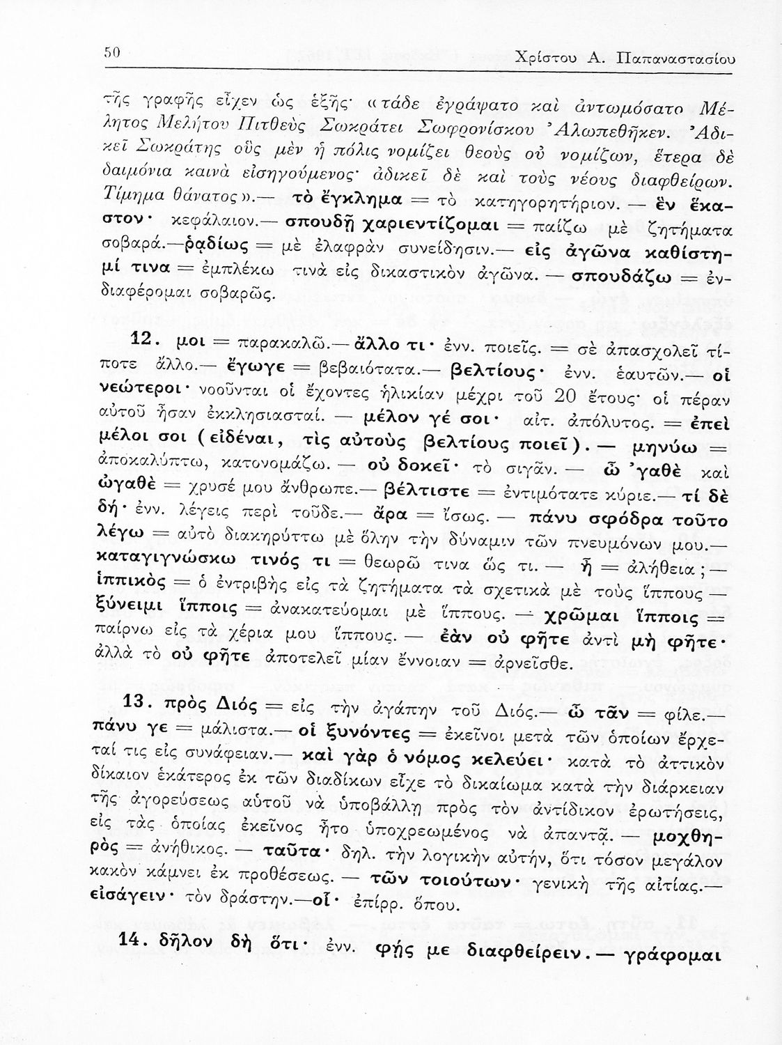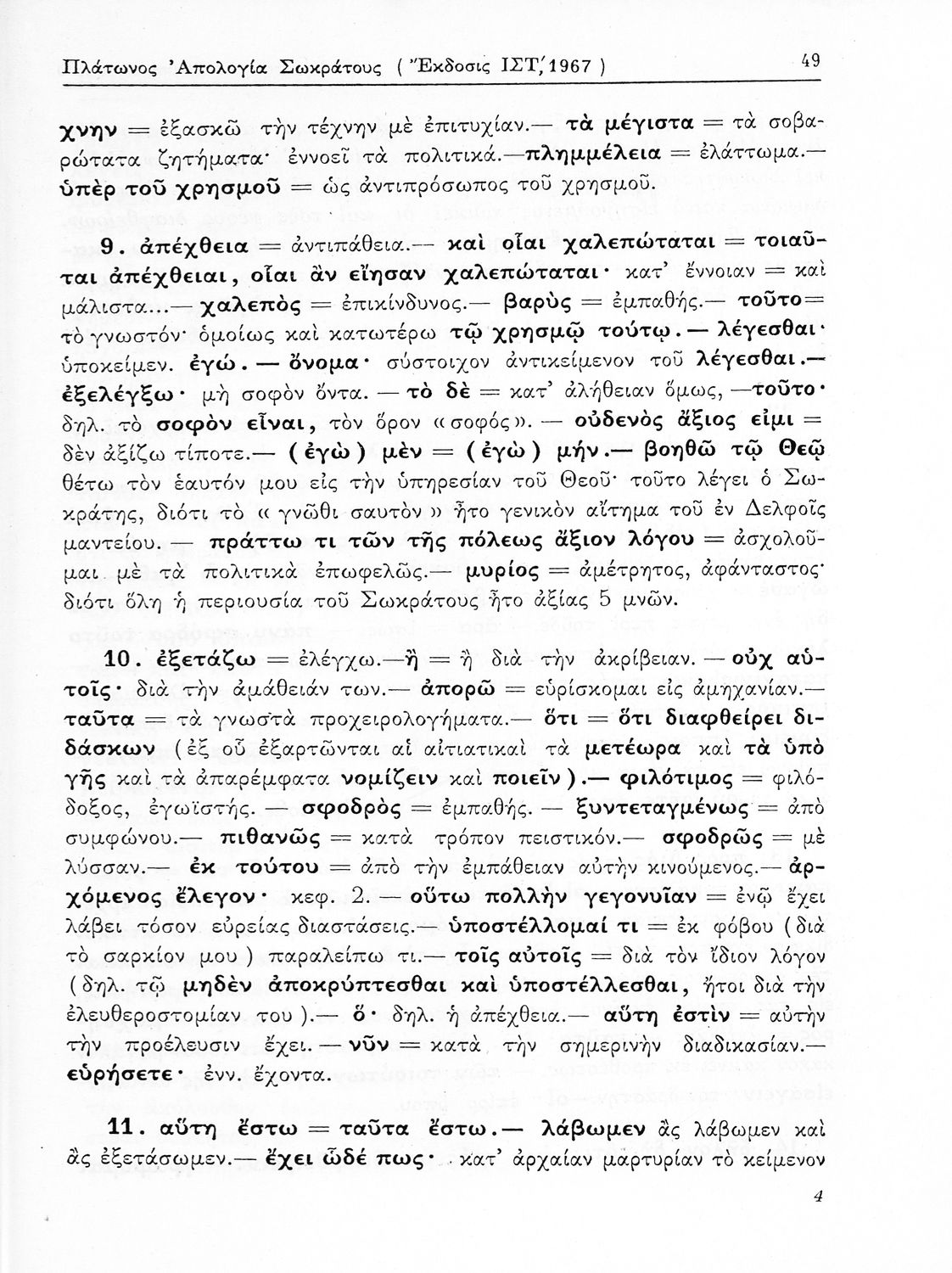 Σχολικό εγχειρίδιο Αρχαίων Ελληνικών από το κείμενο του Πλάτωνα. Περιέχονται ερμηνευτικά σχόλια του συγγραφέα στη καθαρεύουσα. Απεικονίζεται το σύμβολο της Επταετίας.
