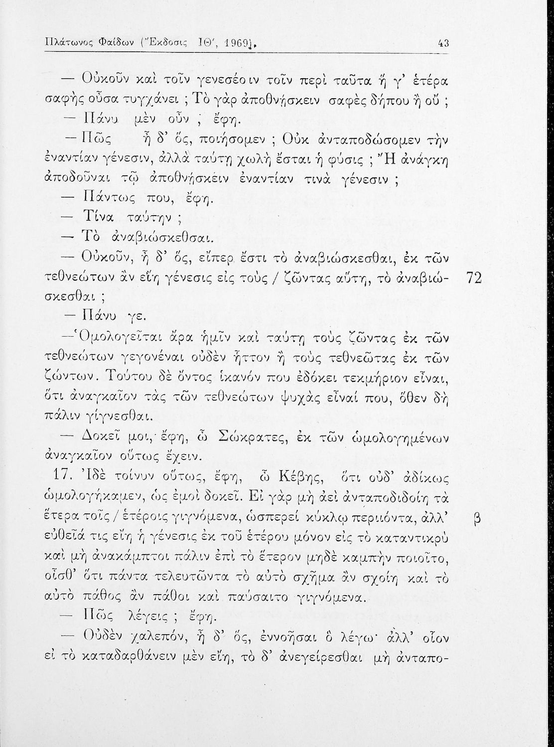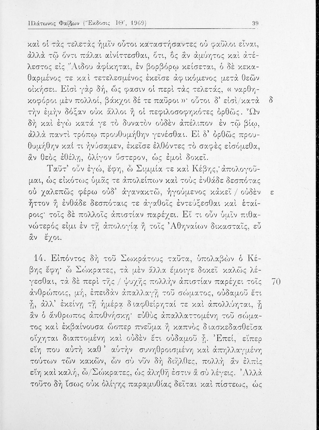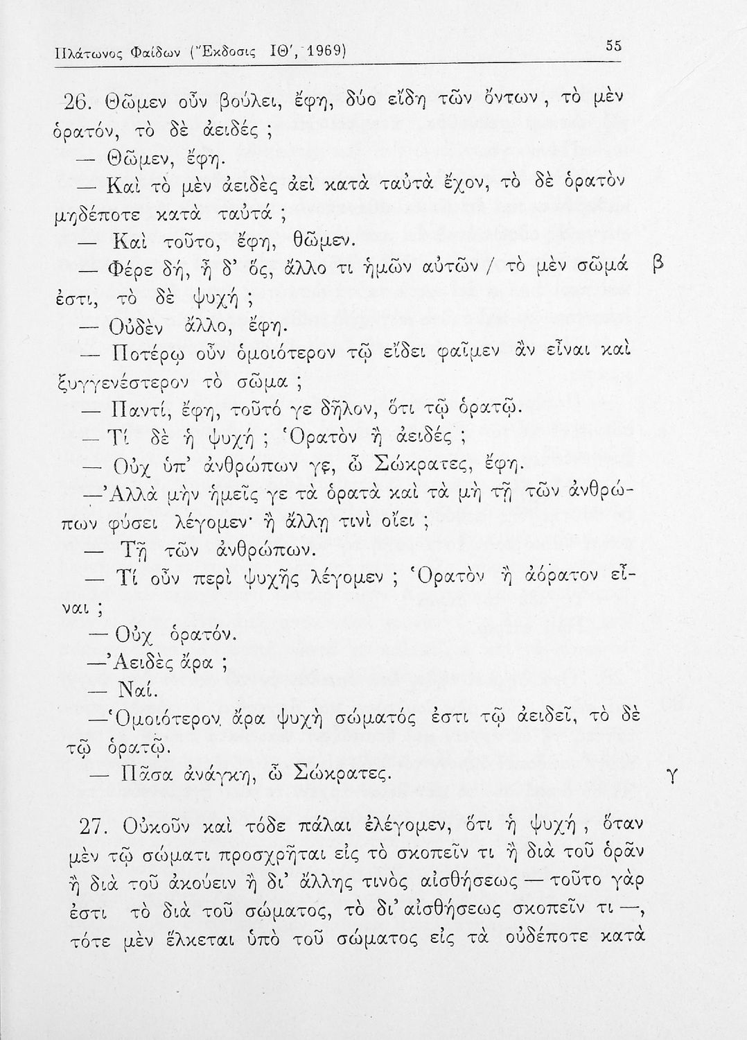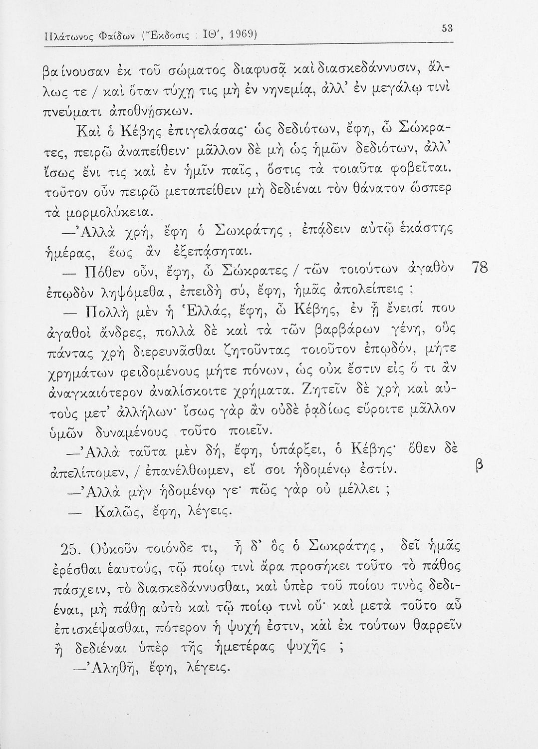 Σχολικό εγχειρίδιο της ΣΤ΄ Γυμνασίου για το μάθημα των Αρχαίων Ελληνικών. Περιλαμβάνει το έργο του Πλάτωνα, Φαίδων. Διαθέτει εισαγωγή, και ερμηνευτικές παρατηρήσεις του συγγραφέα. Φέρει το σύμβολο της δικτατορίας.