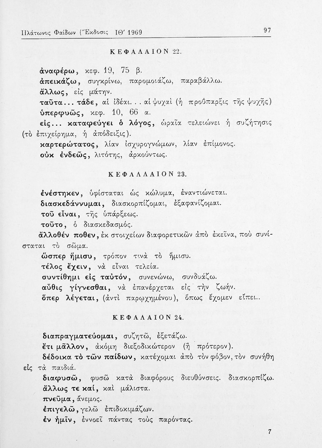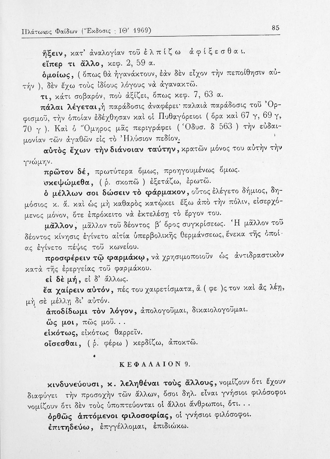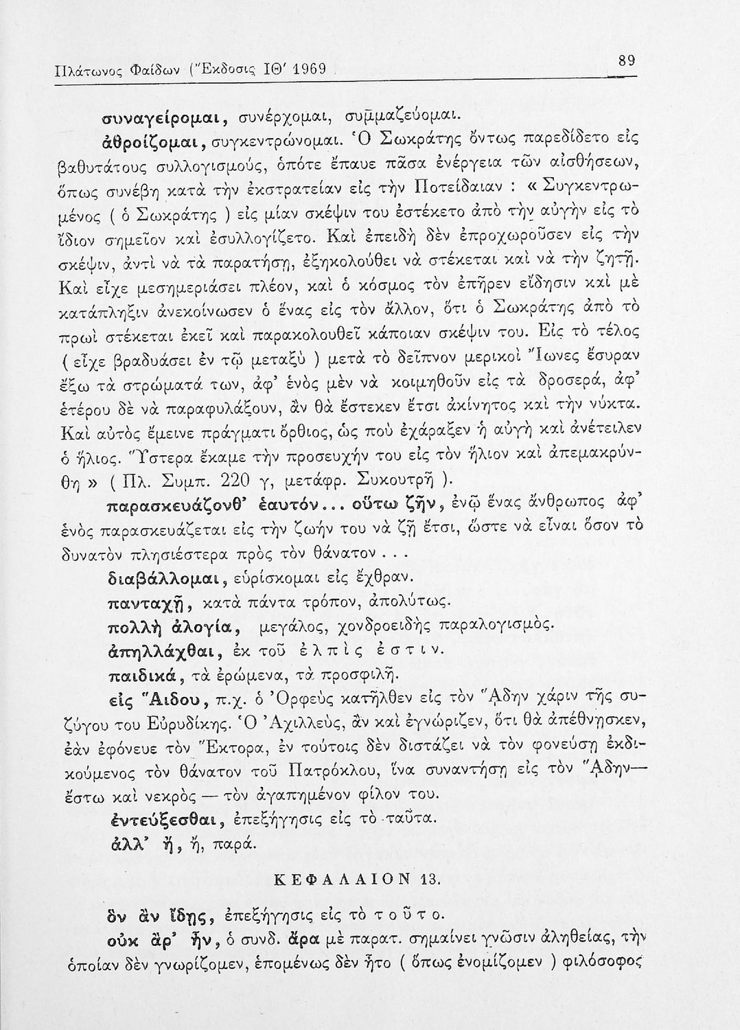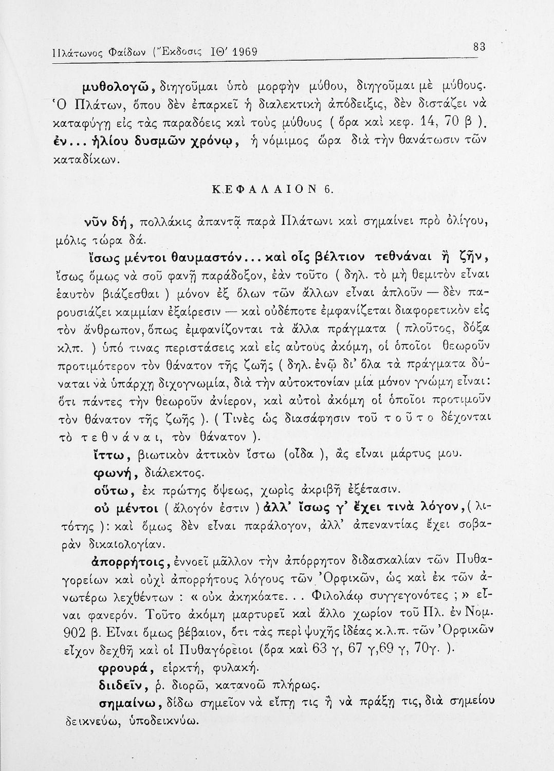 Σχολικό εγχειρίδιο της ΣΤ΄ Γυμνασίου για το μάθημα των Αρχαίων Ελληνικών. Περιλαμβάνει το έργο του Πλάτωνα, Φαίδων. Διαθέτει εισαγωγή, και ερμηνευτικές παρατηρήσεις του συγγραφέα. Φέρει το σύμβολο της δικτατορίας.