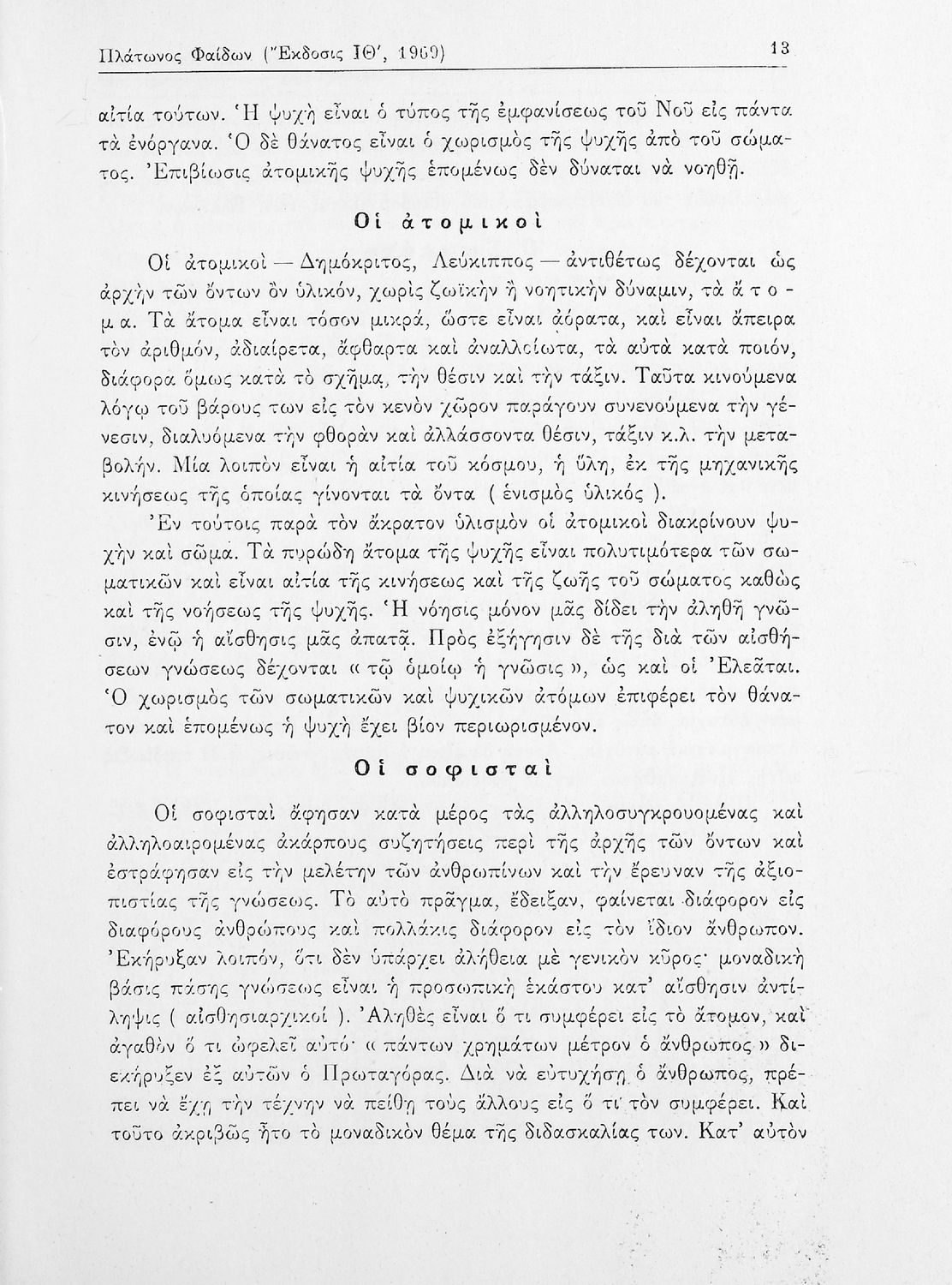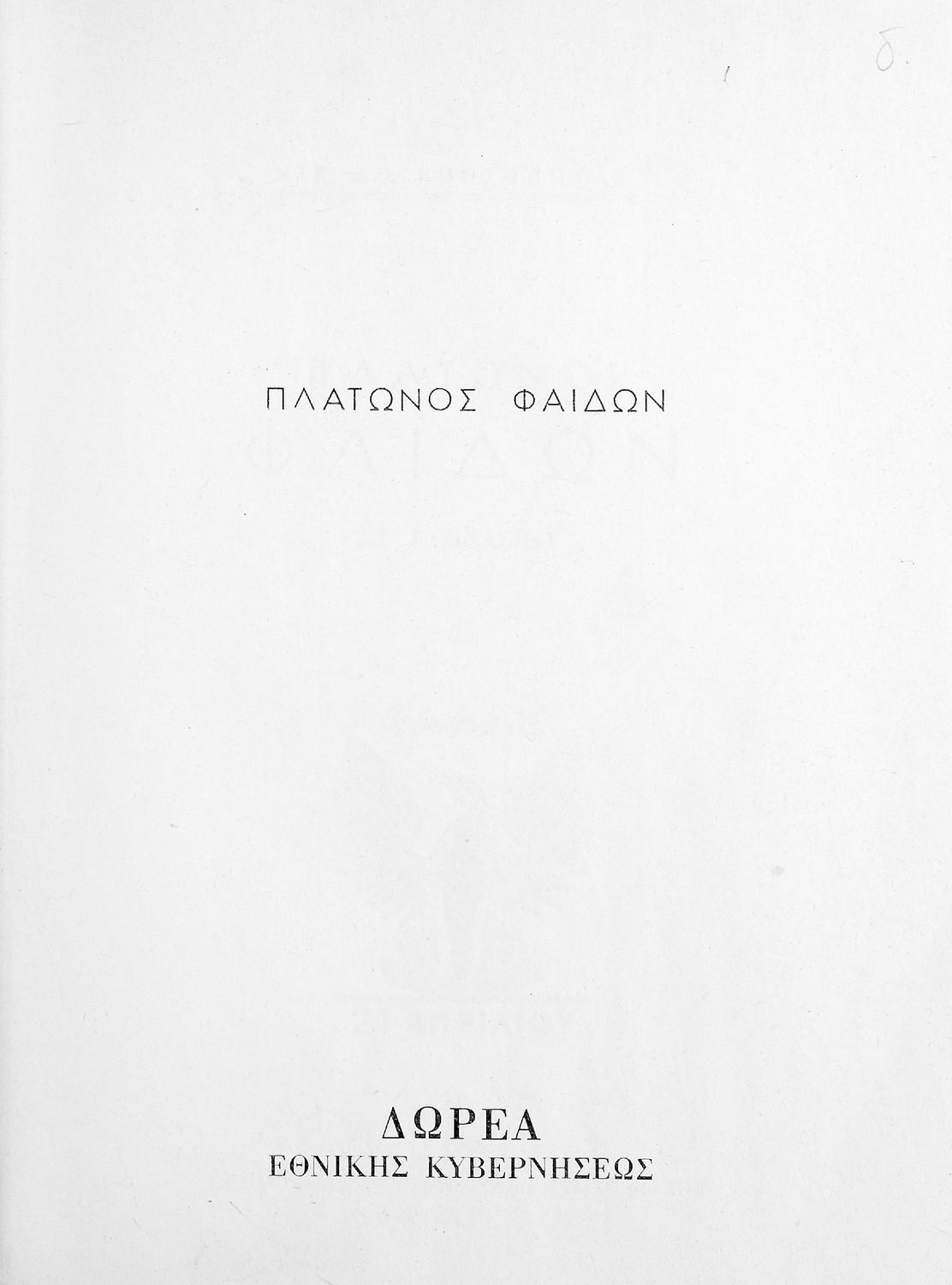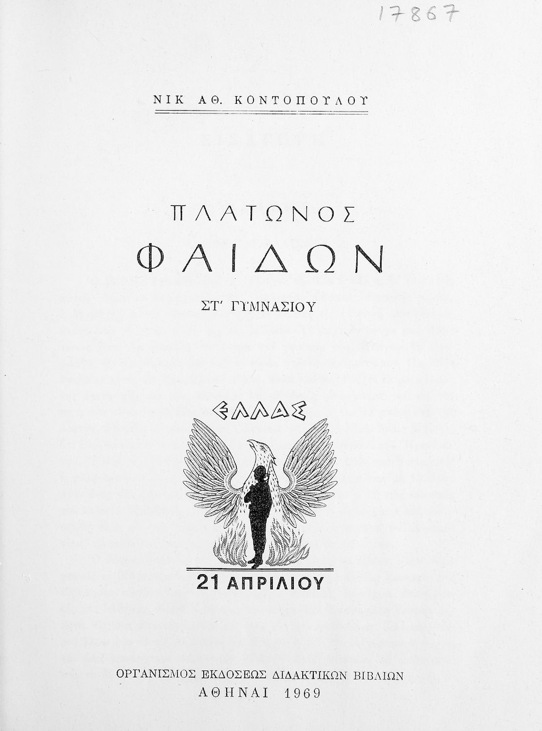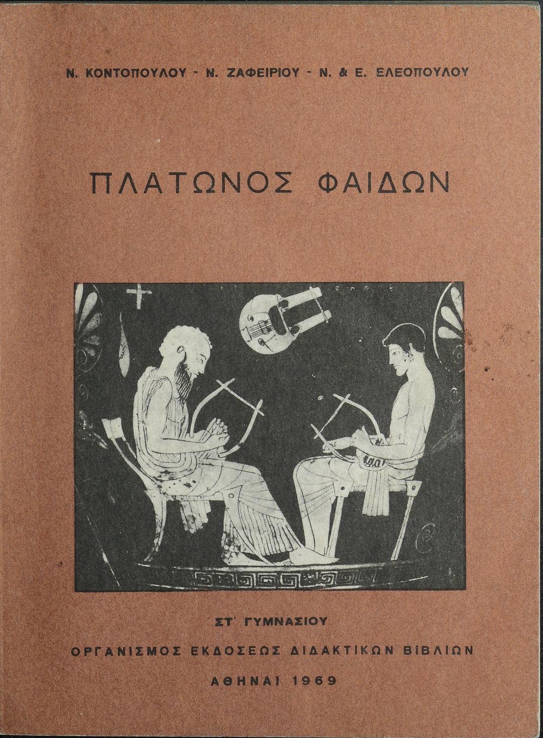 Σχολικό εγχειρίδιο της ΣΤ΄ Γυμνασίου για το μάθημα των Αρχαίων Ελληνικών. Περιλαμβάνει το έργο του Πλάτωνα, Φαίδων. Διαθέτει εισαγωγή, και ερμηνευτικές παρατηρήσεις του συγγραφέα. Φέρει το σύμβολο της δικτατορίας.