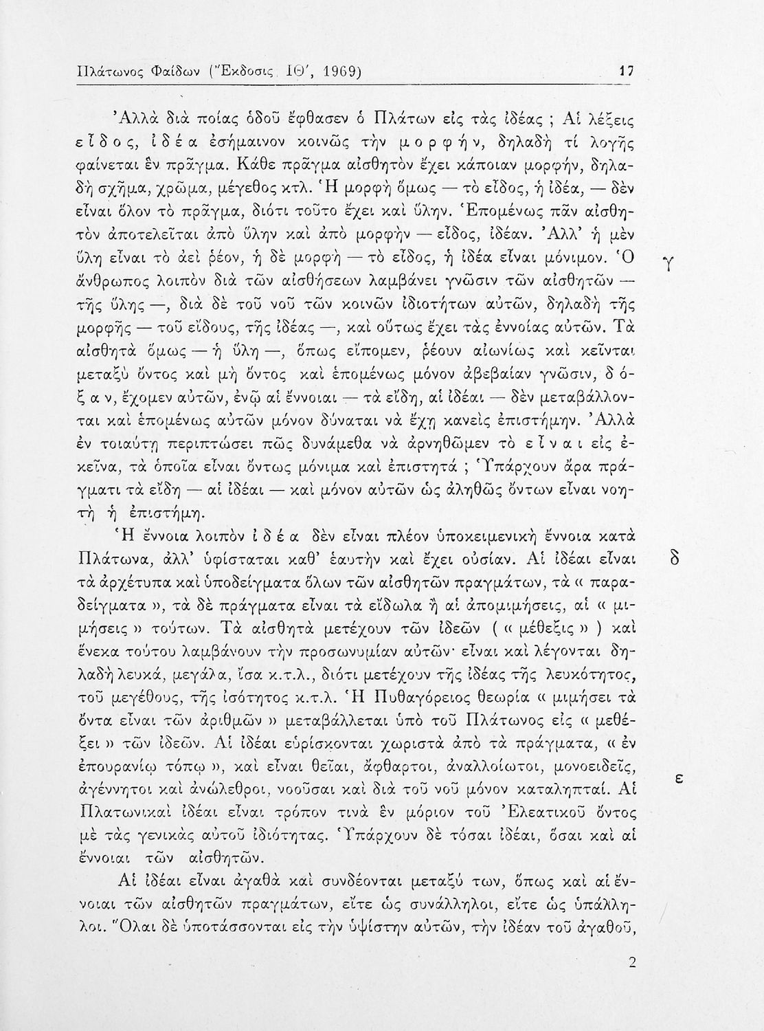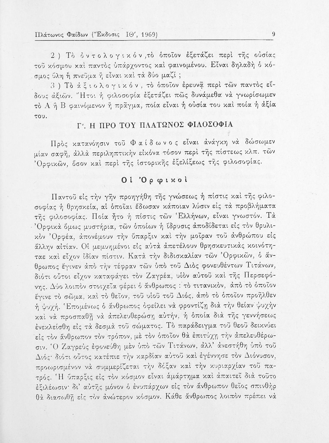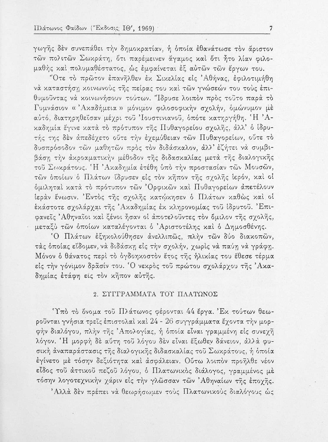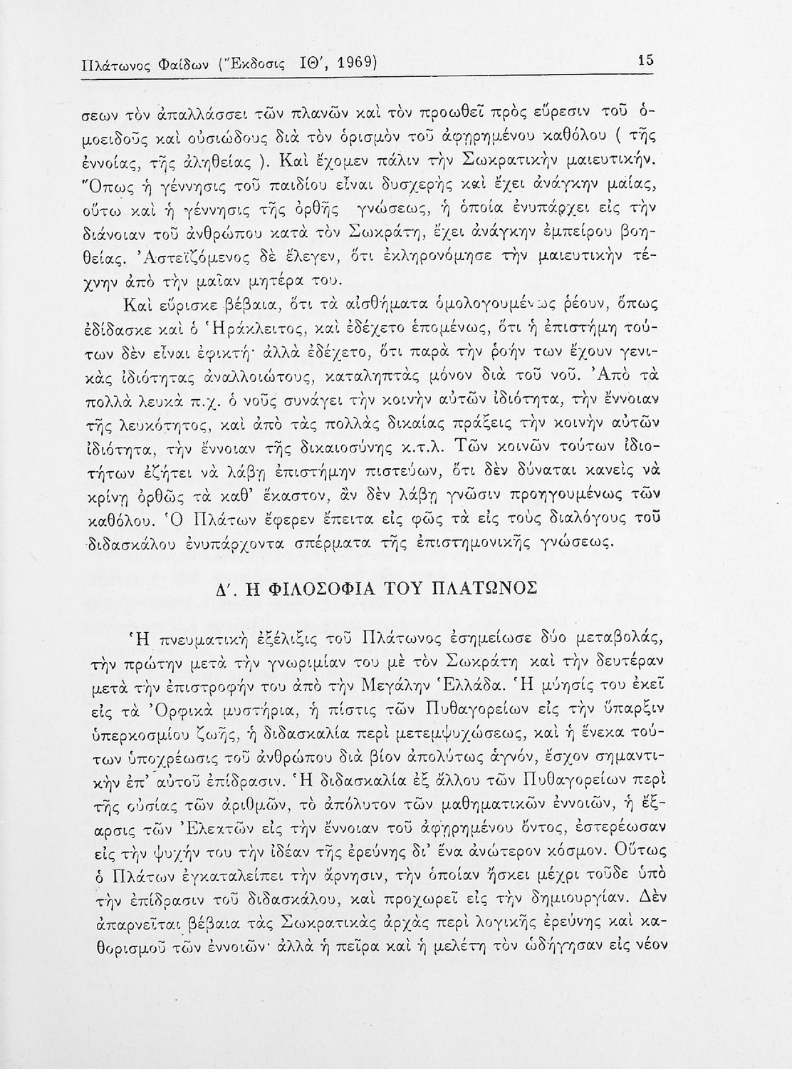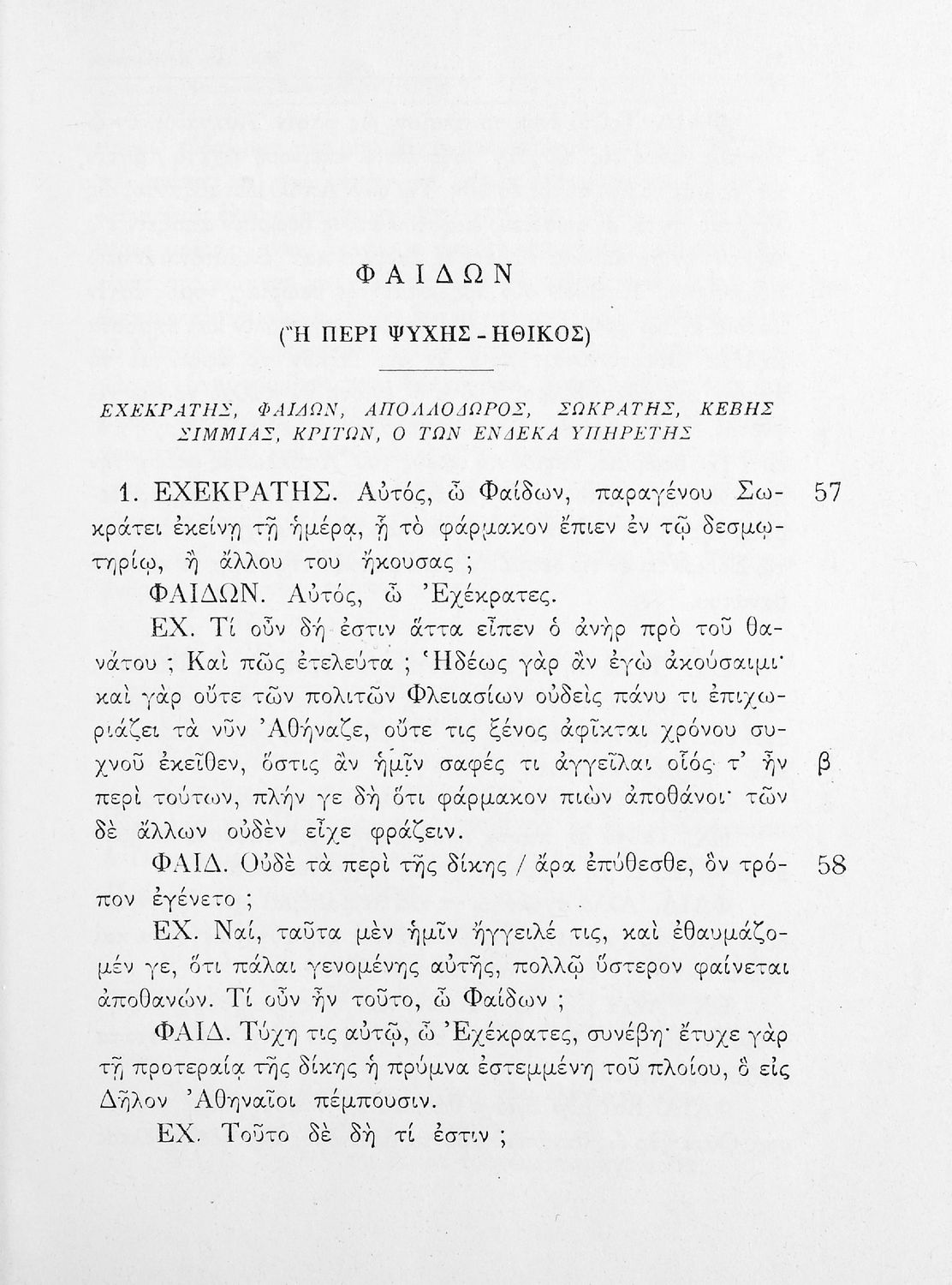 Σχολικό εγχειρίδιο της ΣΤ΄ Γυμνασίου για το μάθημα των Αρχαίων Ελληνικών. Περιλαμβάνει το έργο του Πλάτωνα, Φαίδων. Διαθέτει εισαγωγή, και ερμηνευτικές παρατηρήσεις του συγγραφέα. Φέρει το σύμβολο της δικτατορίας.