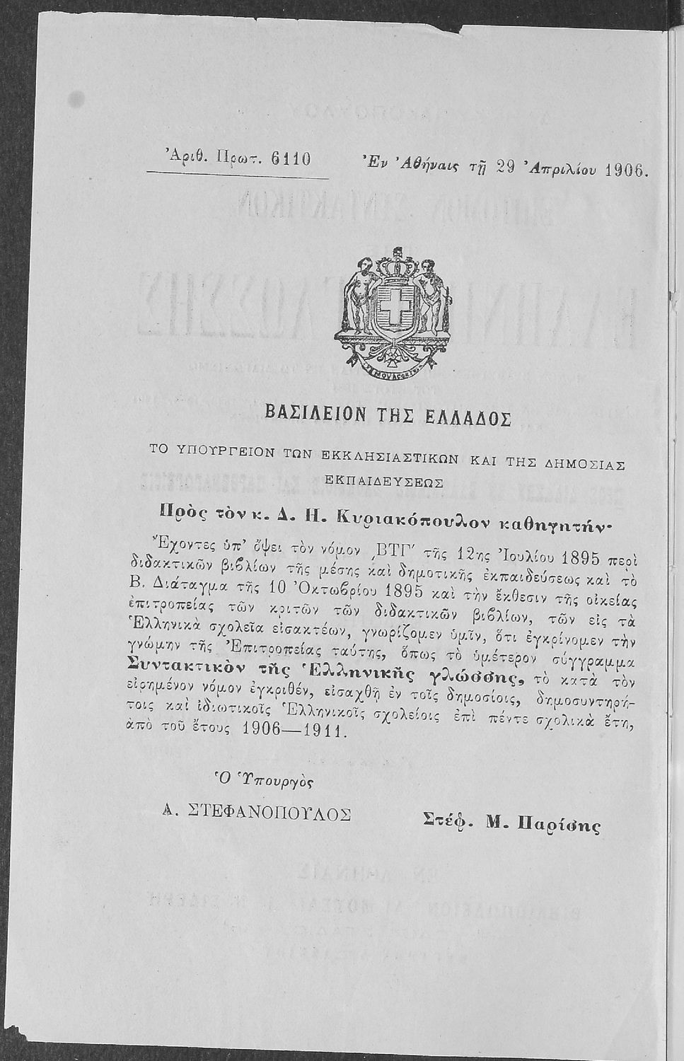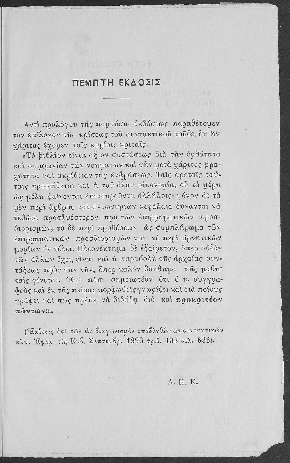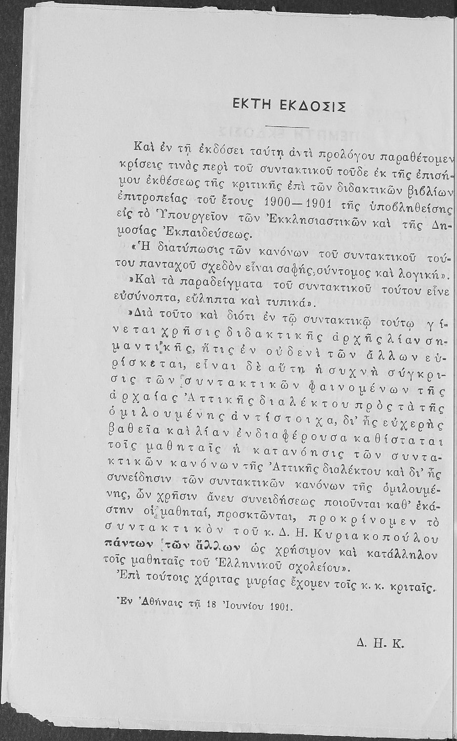 Σχολικό εγχειρίδιο Αρχαίων Ελληνικών για τους μαθητές των Ελληνικών Σχολείων και Παρθεναγωγείων που περιέχει τους συντακτικούς κανόνες.