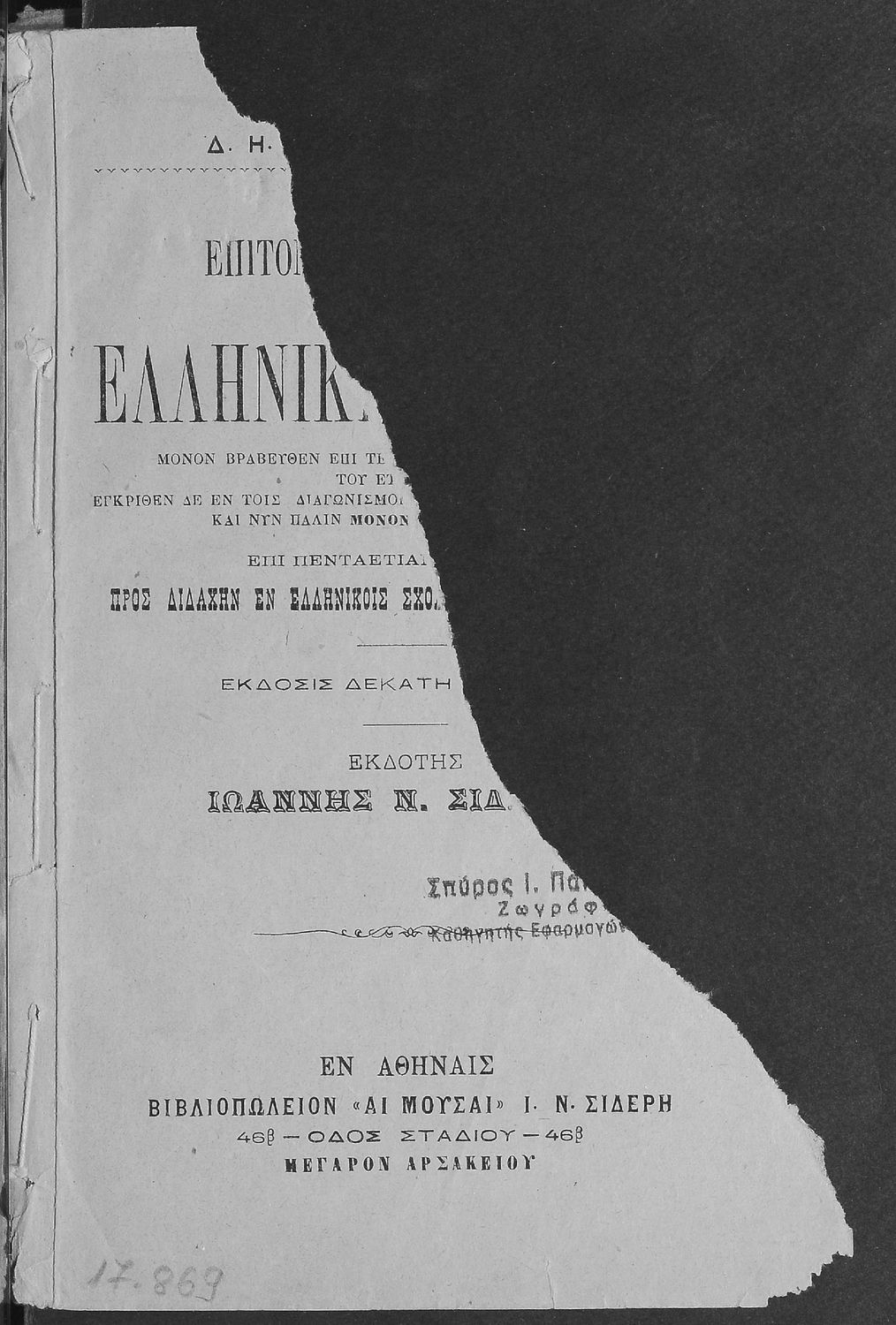 Εκδότης: Βιβλιοπωλείο ΑΙ "Μούσαι" Ιωάννη Ν.Σιδέρη Τόπος έκδοσης: Αθήνα Έκδοση: 14η Υπουργική απόφαση / Σύμβαση: 6110/29-4-1906 Έτος έγκρισης: 1906 |