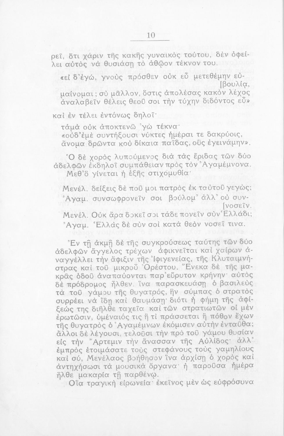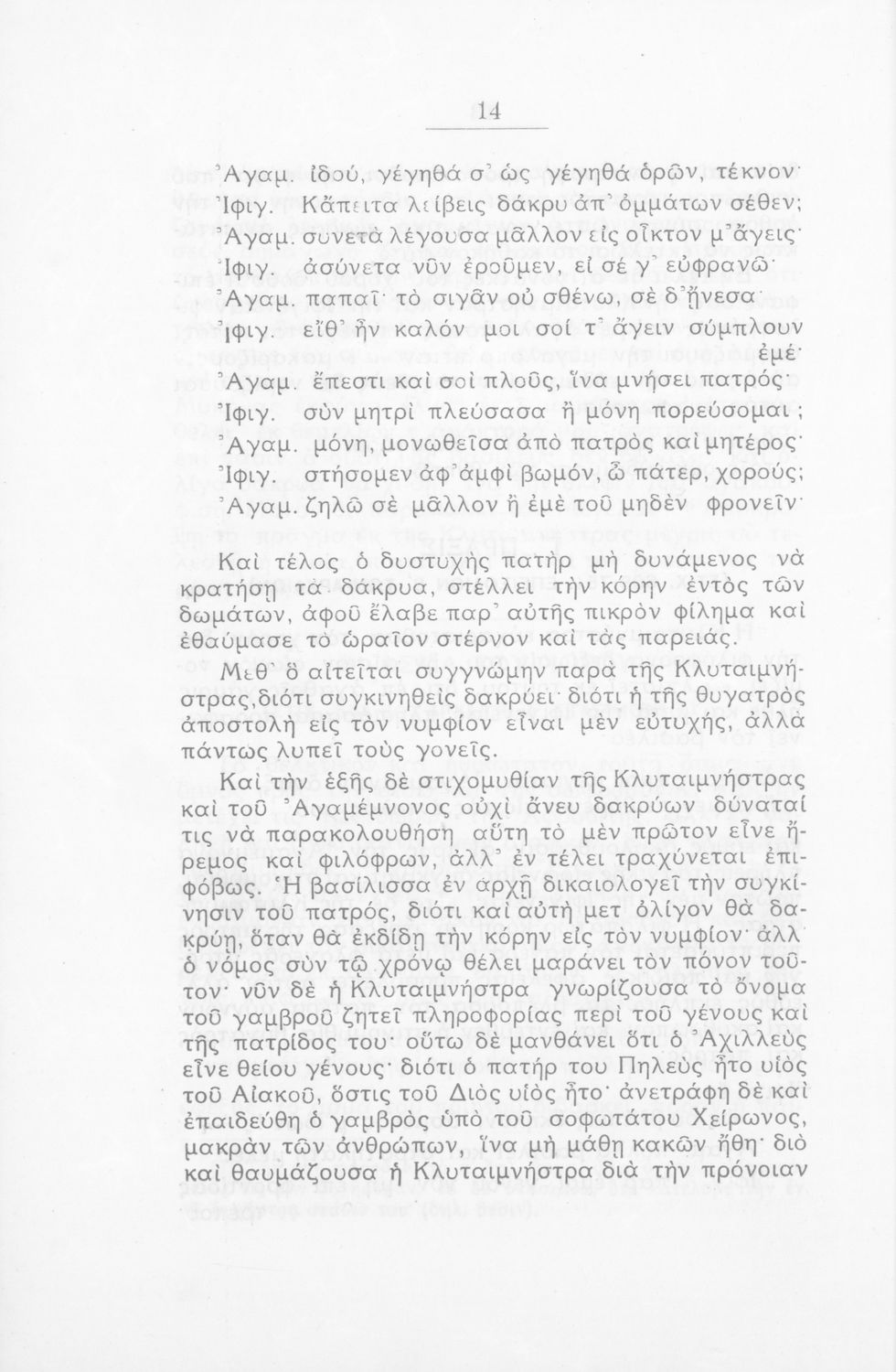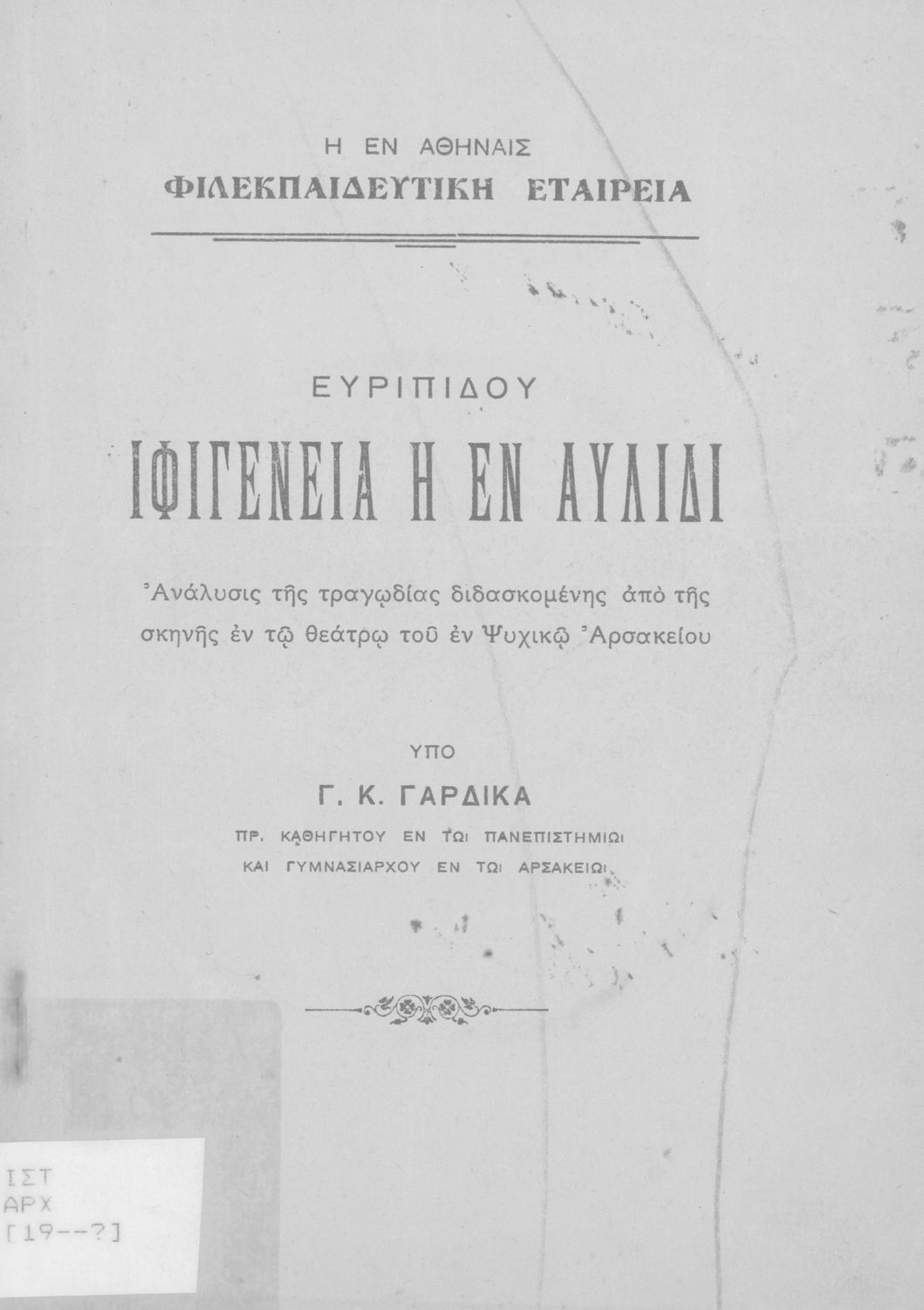 Έκδοση της Φιλεκπαιδευτικής Εταιρείας που περιλαμβάνει ανάλυση της τραγωδία του Ευριπίδη Ιφιγένεια η εν Αυλίδι που παρουσιάστηκε στη θεατρική σκηνή του Αρσάκειου στο Ψυχικό. Ο συγγραφέας ήταν καθηγητής στο Παν/μιο και Γυμνασιάρχης στο Αρσάκειο.