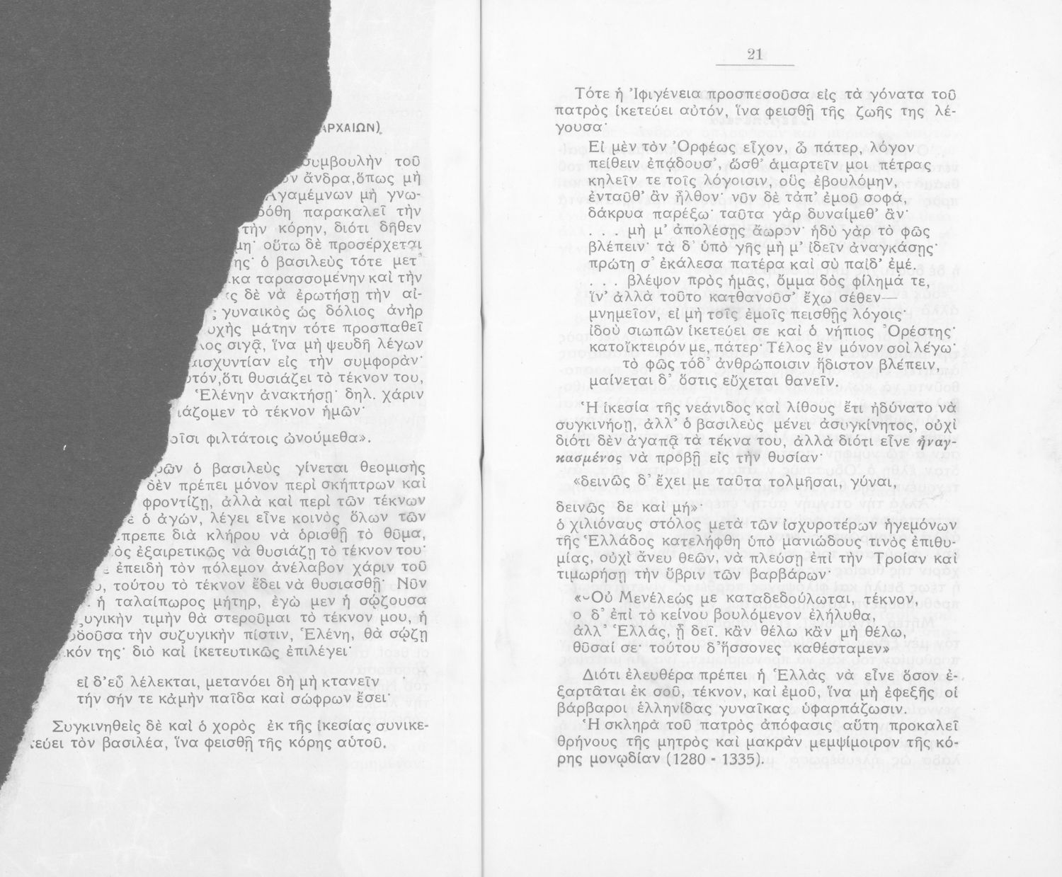 Σχολικό εγχειρίδιο Αρχαίων Ελληνικών για τη Γ' Γυμνασίου που περιλαμβάνει την τραγωδία του Ευριπίδη Ιφιγένεια η εν Αυλίδι σε μετάφραση και ερμηνευτικές σημειώσεις. Φέρει το σύμβολο της δικτατορίας.