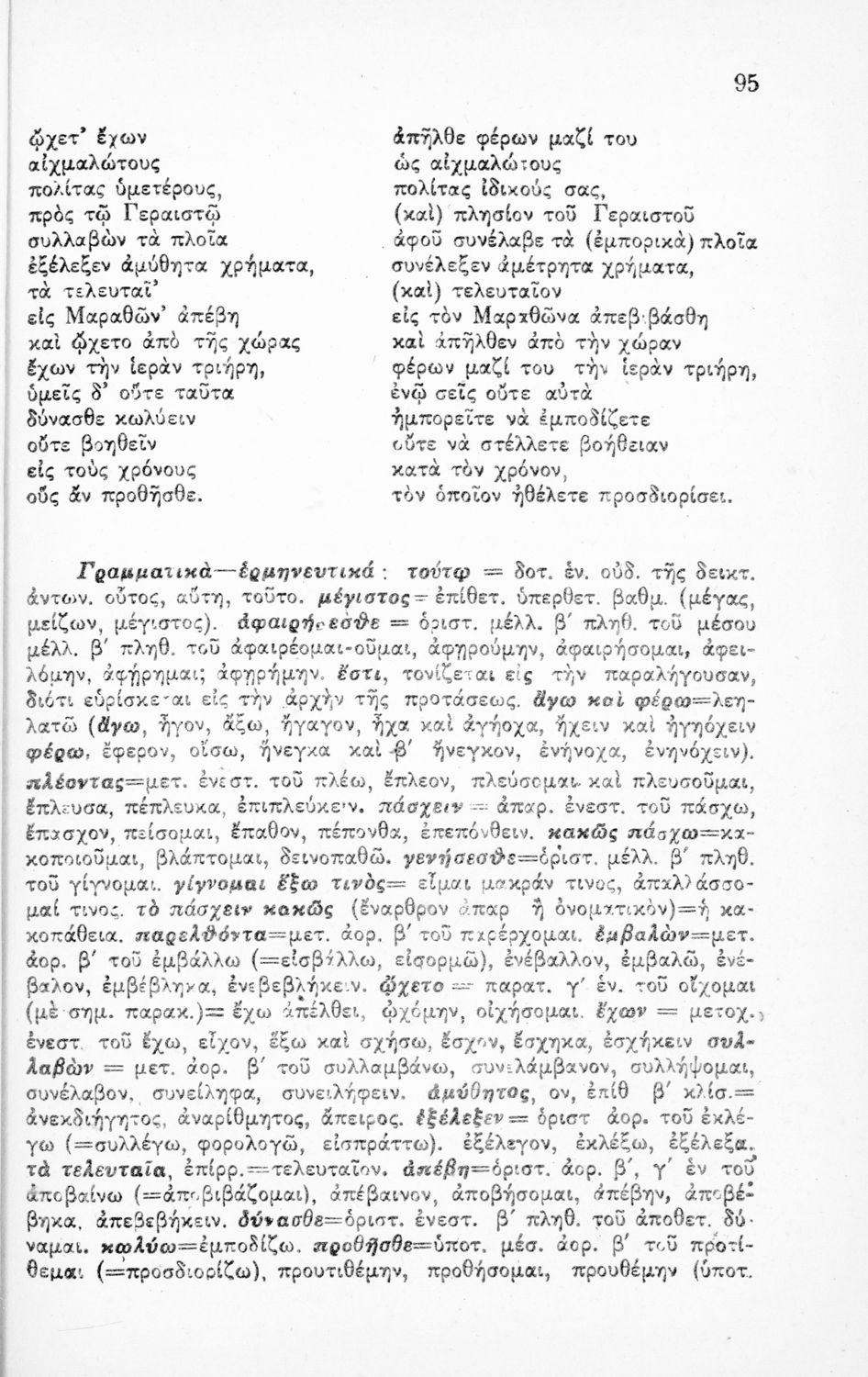 Μαθητικό βοήθημα Αρχαίων Ελληνικών για την Δ', Ε' Γυμνασίου. Περιλαμβάνει μετάφραση, ερμηνευτικά, γραμματικά και συντακτικά σχόλια.