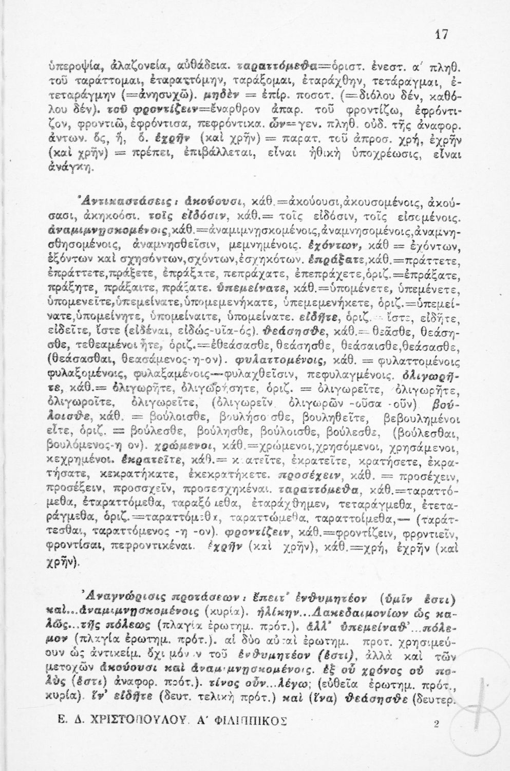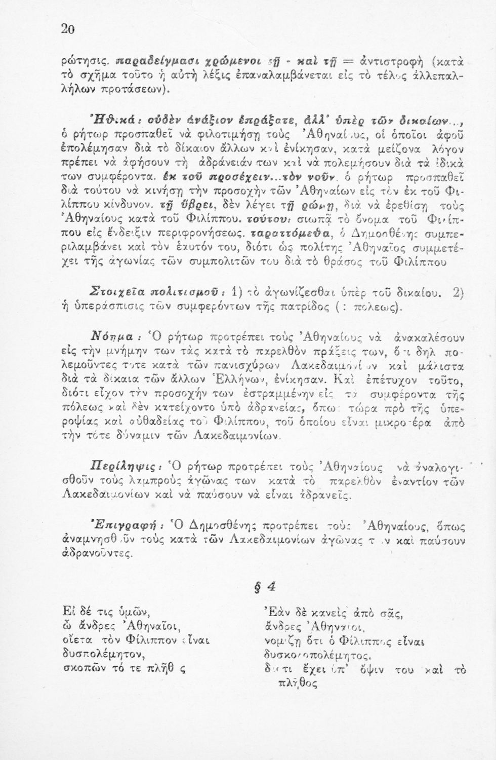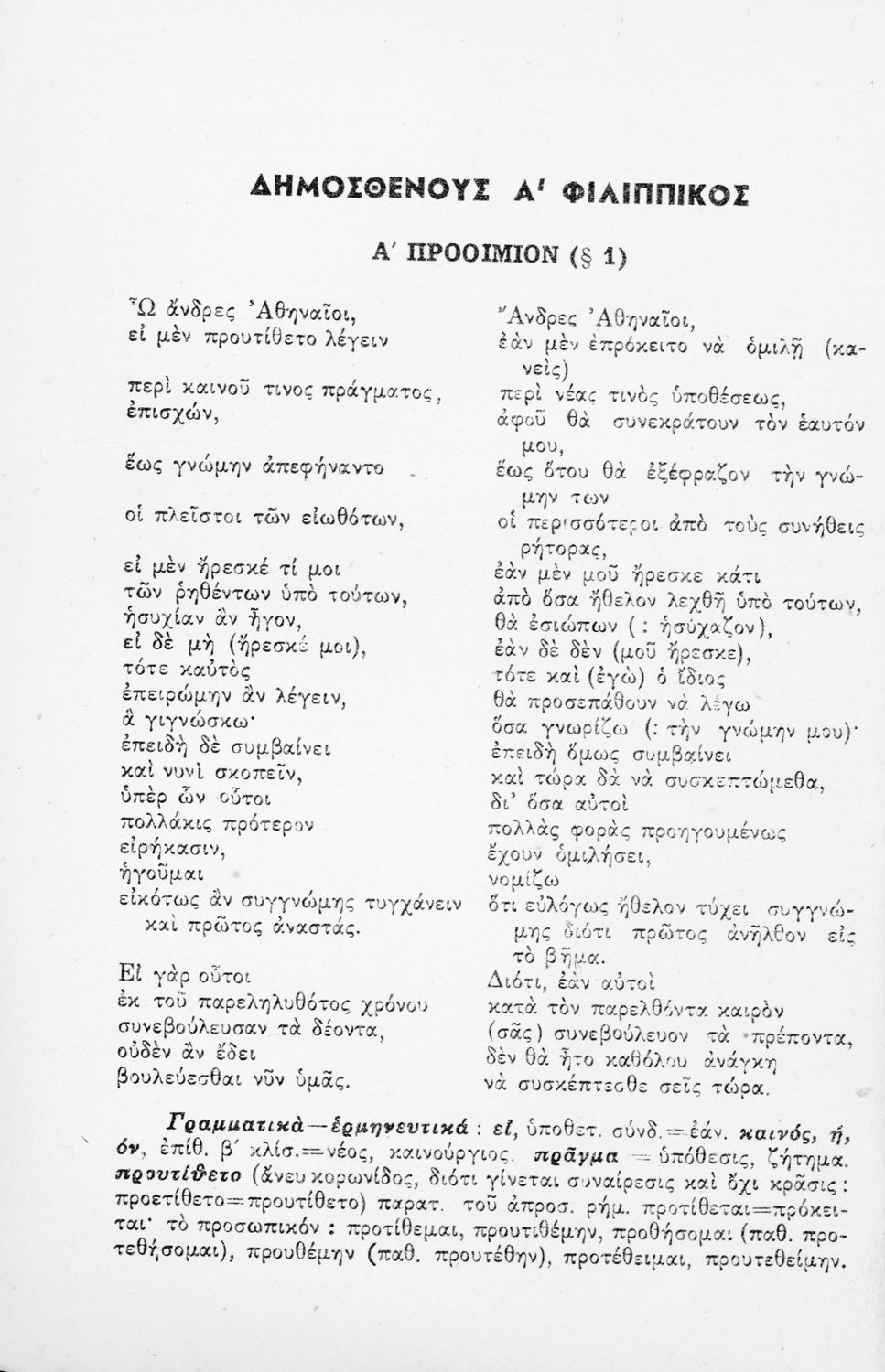 Μαθητικό βοήθημα Αρχαίων Ελληνικών Δ' Γυμνασίου που περιλαμβάνει τον Α΄ Φιλιππικό του Δημοσθένη, μετάφραση, γραμματικά, αισθητικά και σημασιολογικά σχόλια και αντικαταστάσεις ρημάτων.