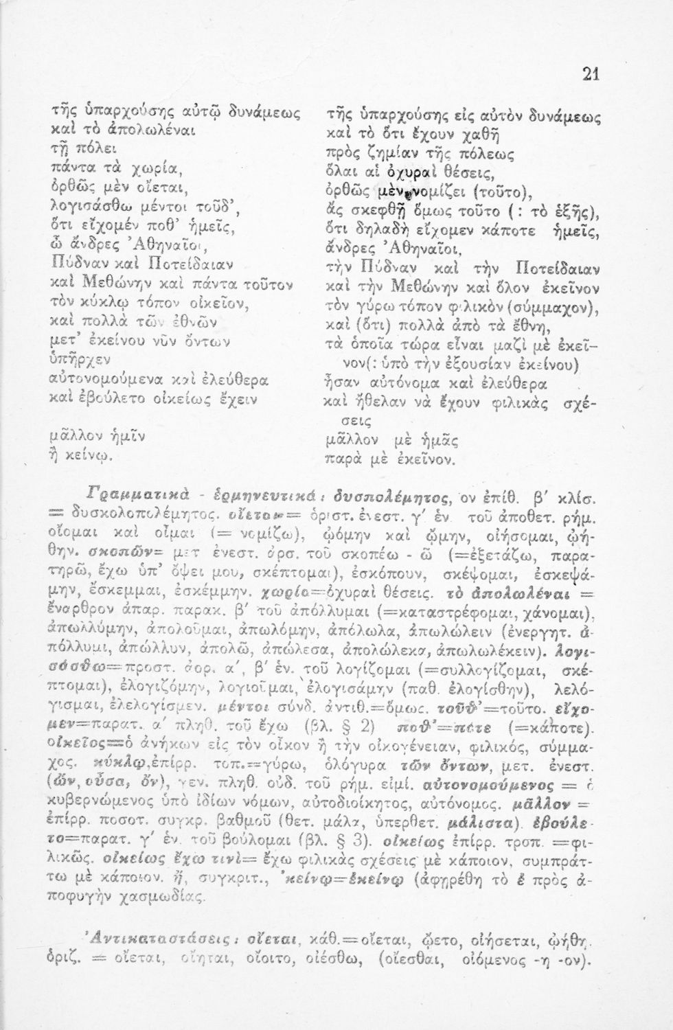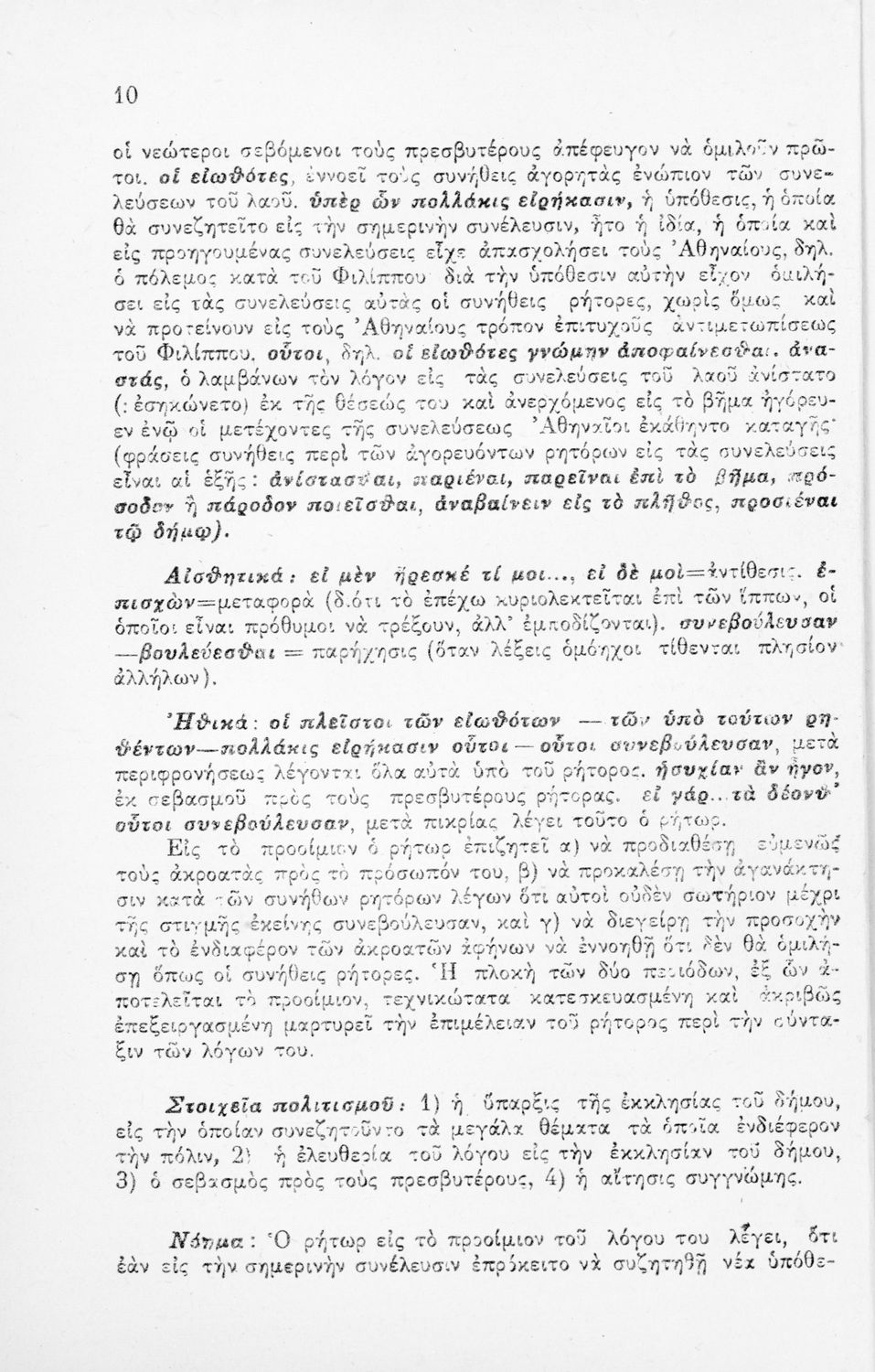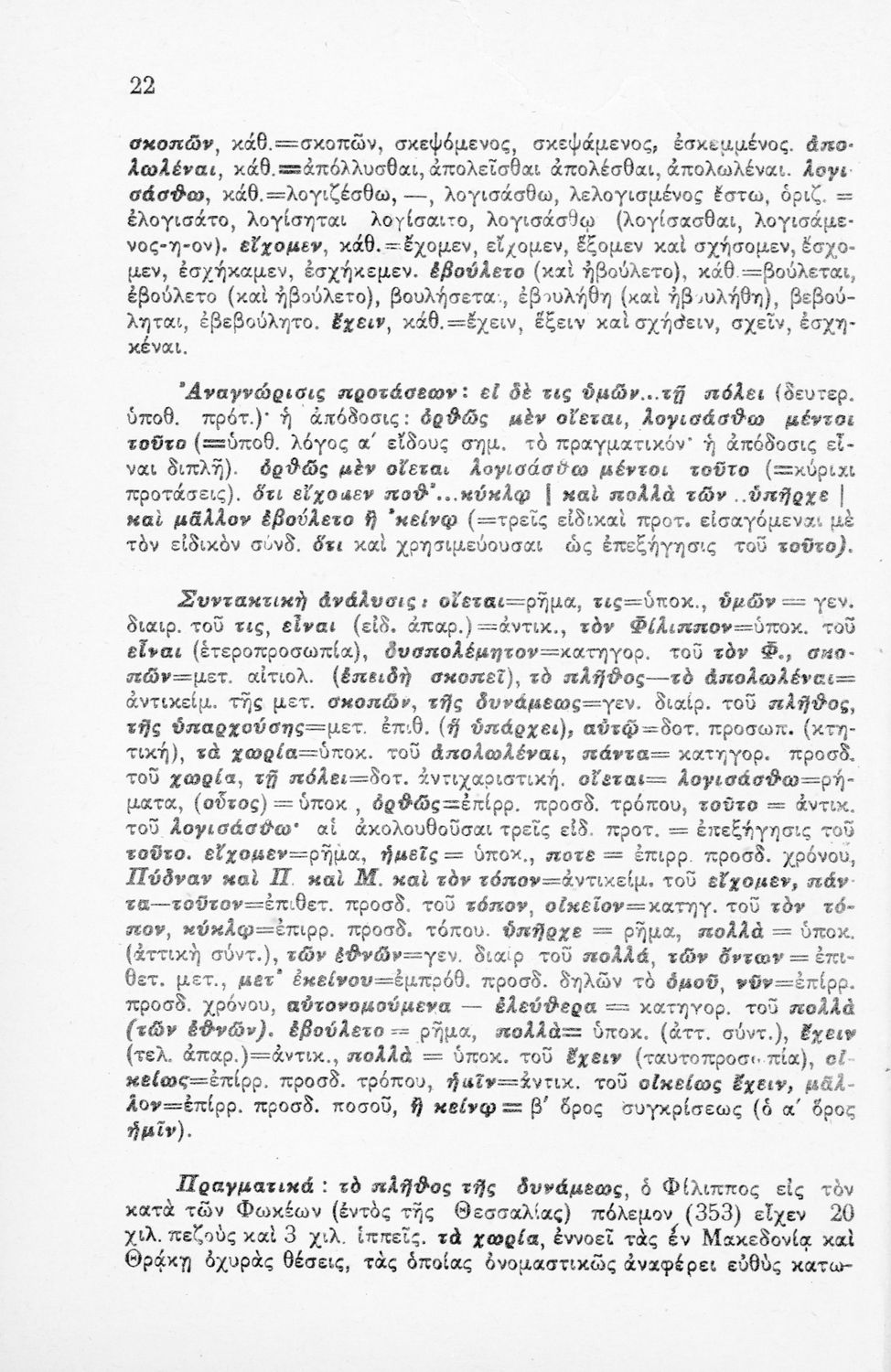 Μαθητικό βοήθημα Αρχαίων Ελληνικών Δ' Γυμνασίου που περιλαμβάνει τον Α΄ Φιλιππικό του Δημοσθένη, μετάφραση, γραμματικά, αισθητικά και σημασιολογικά σχόλια και αντικαταστάσεις ρημάτων.