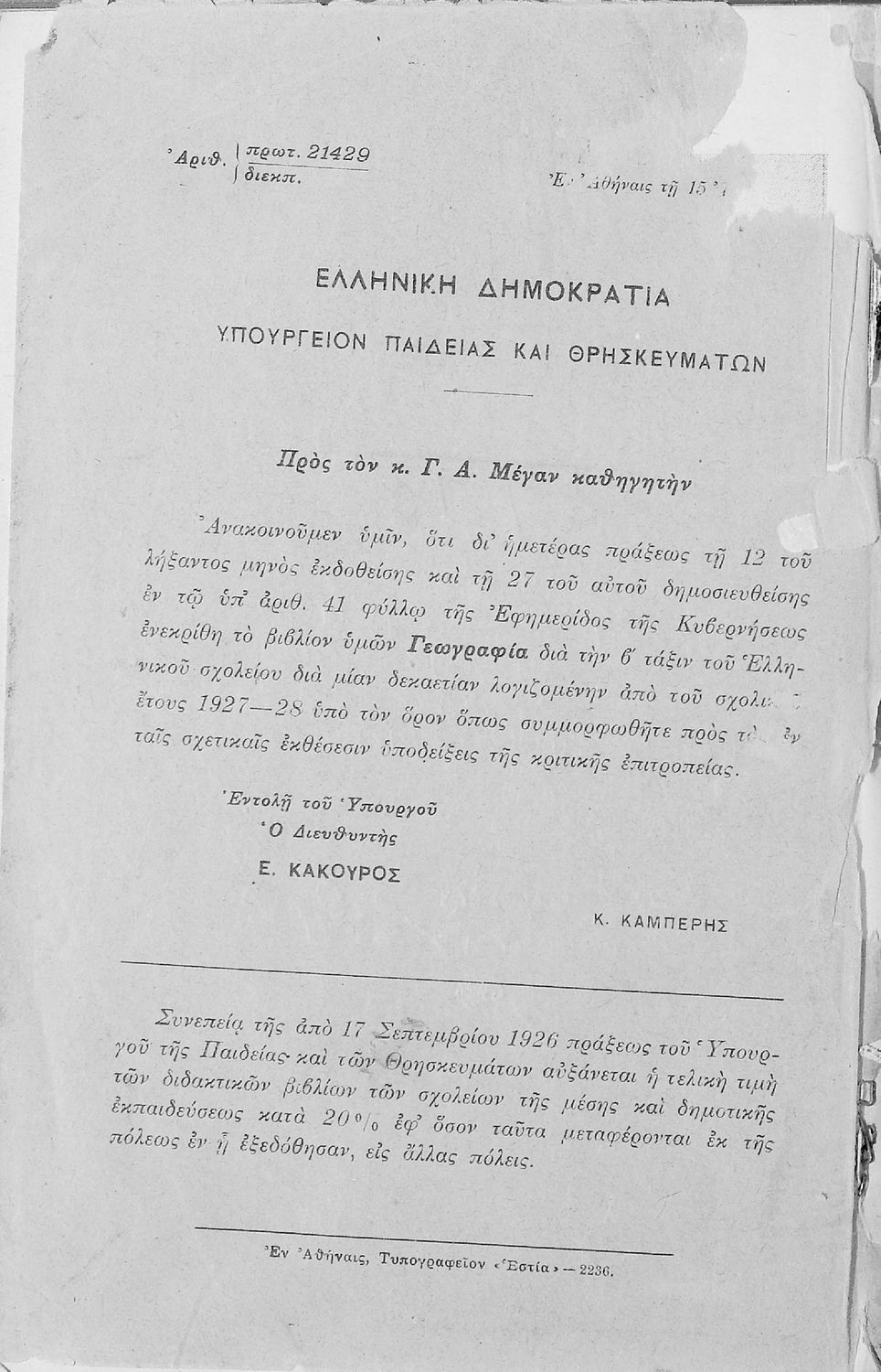 Εκδότης: Ιωάννης Δ. Κολλάρος Έτος έκδοσης: 1927 Τόπος έκδοσης: Αθήνα Υπουργική απόφαση / Σύμβαση: 21429 Έτος έγκρισης: 1926 |