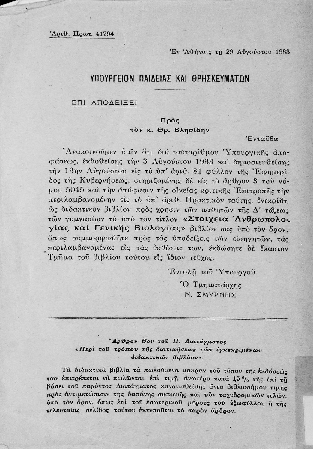 Υπουργική απόφαση / Σύμβαση: 41794/29-8-1933