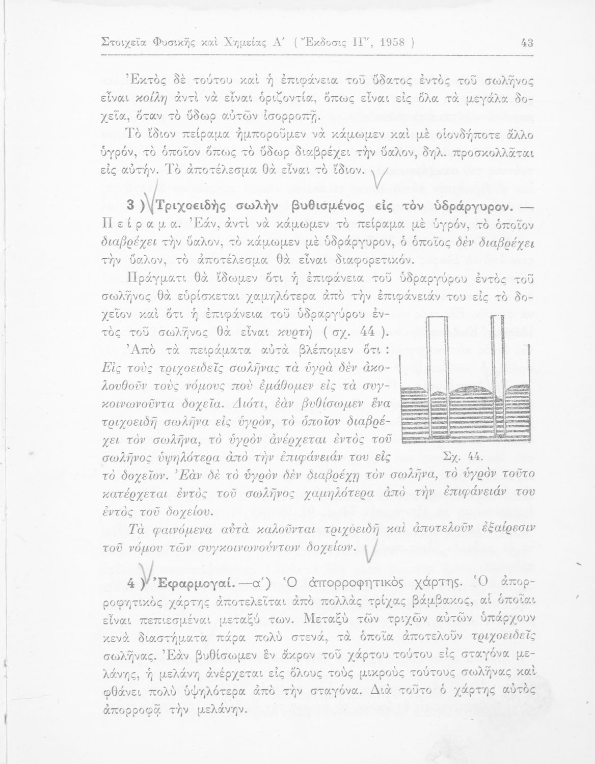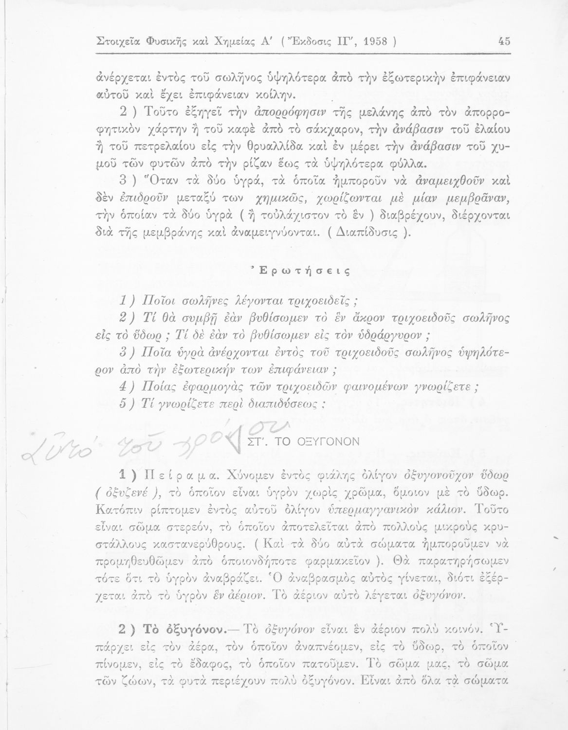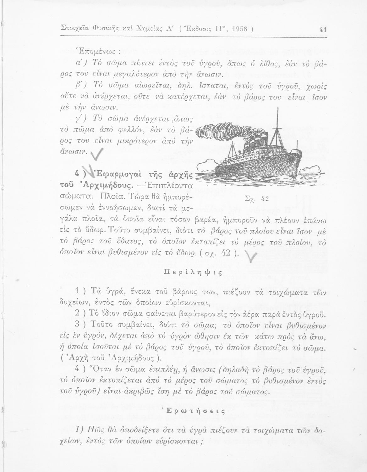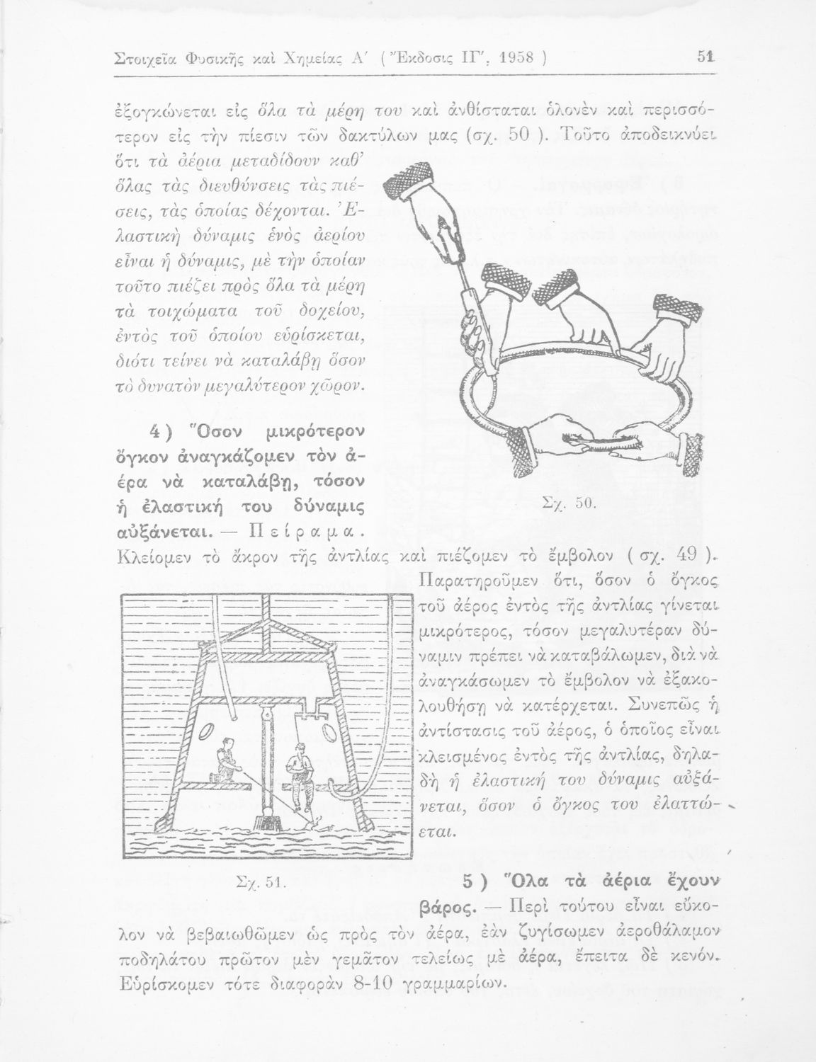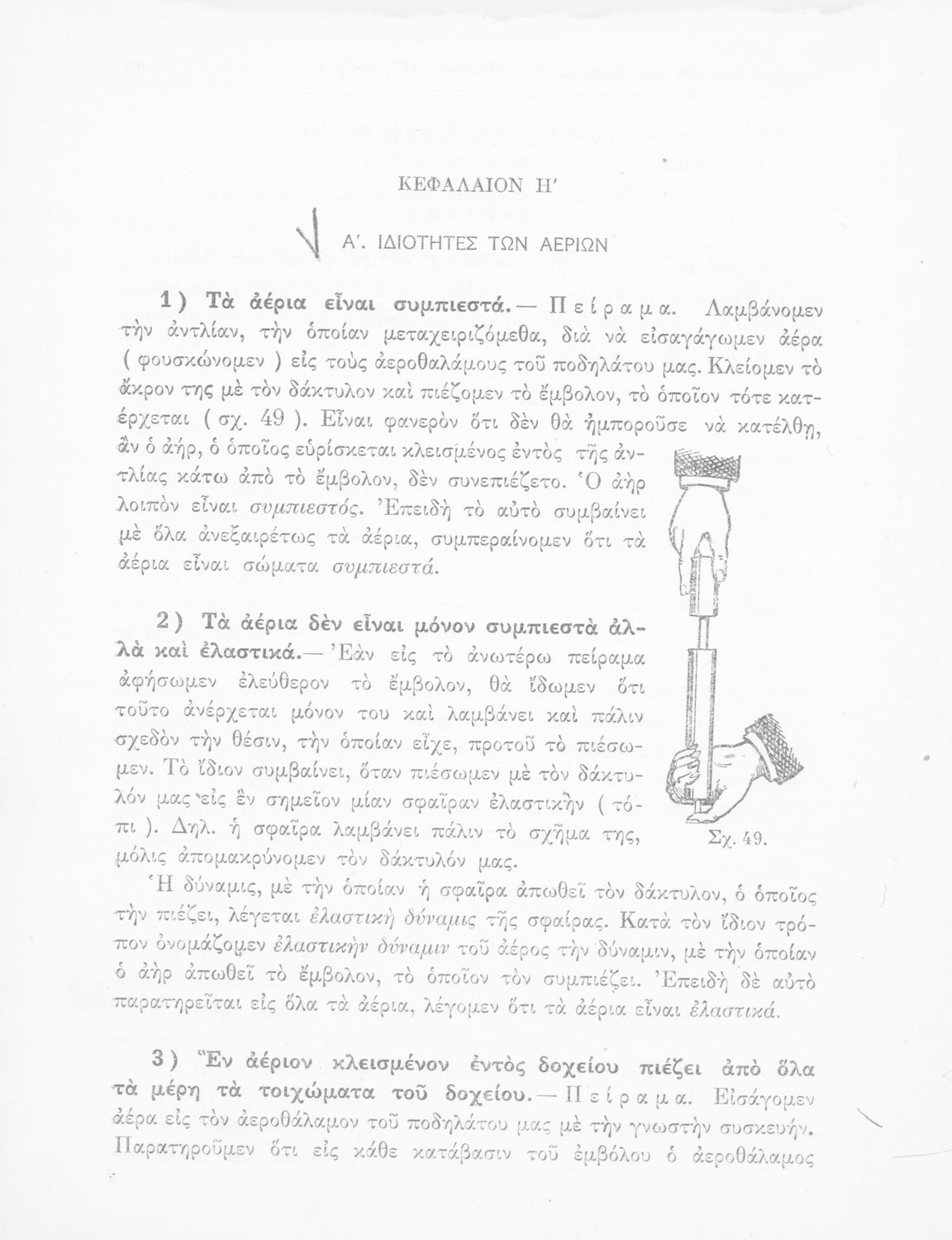 Σχολικό εγχειρίδιο για το μάθημα της Φυσικής στο Γυμνάσιο. Παρέχει βασικές γνώσεις της φυσικής επιστήμης. Αναλύει τα φαινόμενα της αδράνειας, της βαρύτητας, της υδροστατικής πίεσης κ.α. Όσον αφορά τη χημεία αναφέρεται στις ιδιότητες των μετάλλων, τα οξέα, τις βάσεις και τα άλατα. Αναφέρεται στην πρακτική εφαρμογή της φυσικής και της χημείας στην καθημερινότητά. Επίσης, περιλαμβάνει πολλά από τα όργανα, που χρησιμοποιούνται στη φυσική. Περιέχει εικόνες και σχεδιαγράμματα τα οποία βοηθούν τη διδασκαλία.