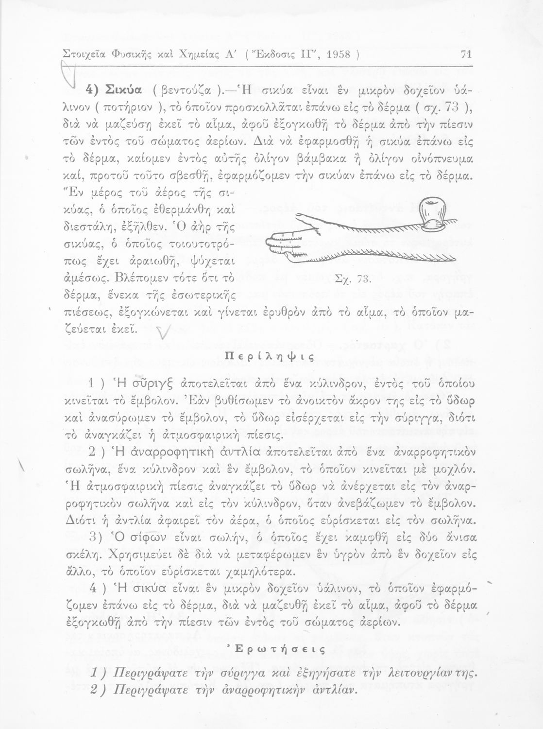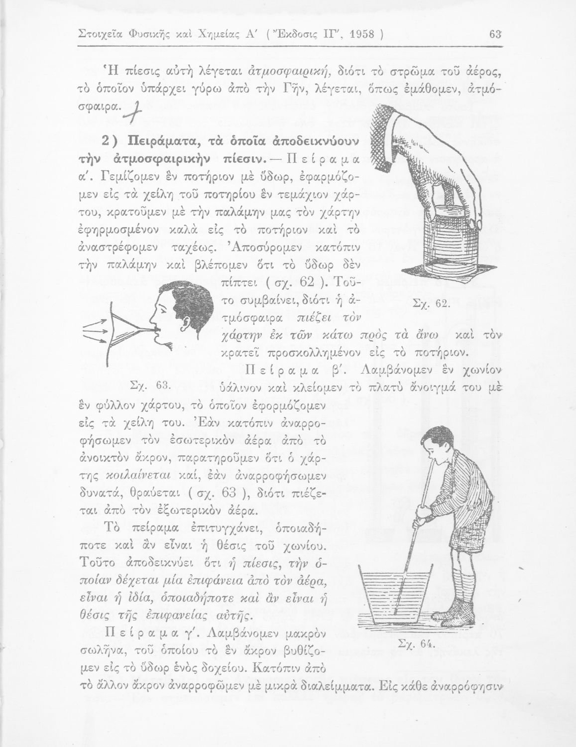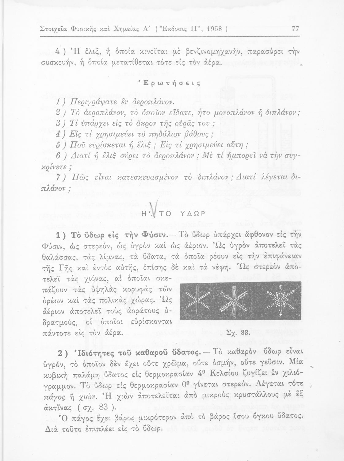 Σχολικό εγχειρίδιο για το μάθημα της Φυσικής στο Γυμνάσιο. Παρέχει βασικές γνώσεις της φυσικής επιστήμης. Αναλύει τα φαινόμενα της αδράνειας, της βαρύτητας, της υδροστατικής πίεσης κ.α. Όσον αφορά τη χημεία αναφέρεται στις ιδιότητες των μετάλλων, τα οξέα, τις βάσεις και τα άλατα. Αναφέρεται στην πρακτική εφαρμογή της φυσικής και της χημείας στην καθημερινότητά. Επίσης, περιλαμβάνει πολλά από τα όργανα, που χρησιμοποιούνται στη φυσική. Περιέχει εικόνες και σχεδιαγράμματα τα οποία βοηθούν τη διδασκαλία.