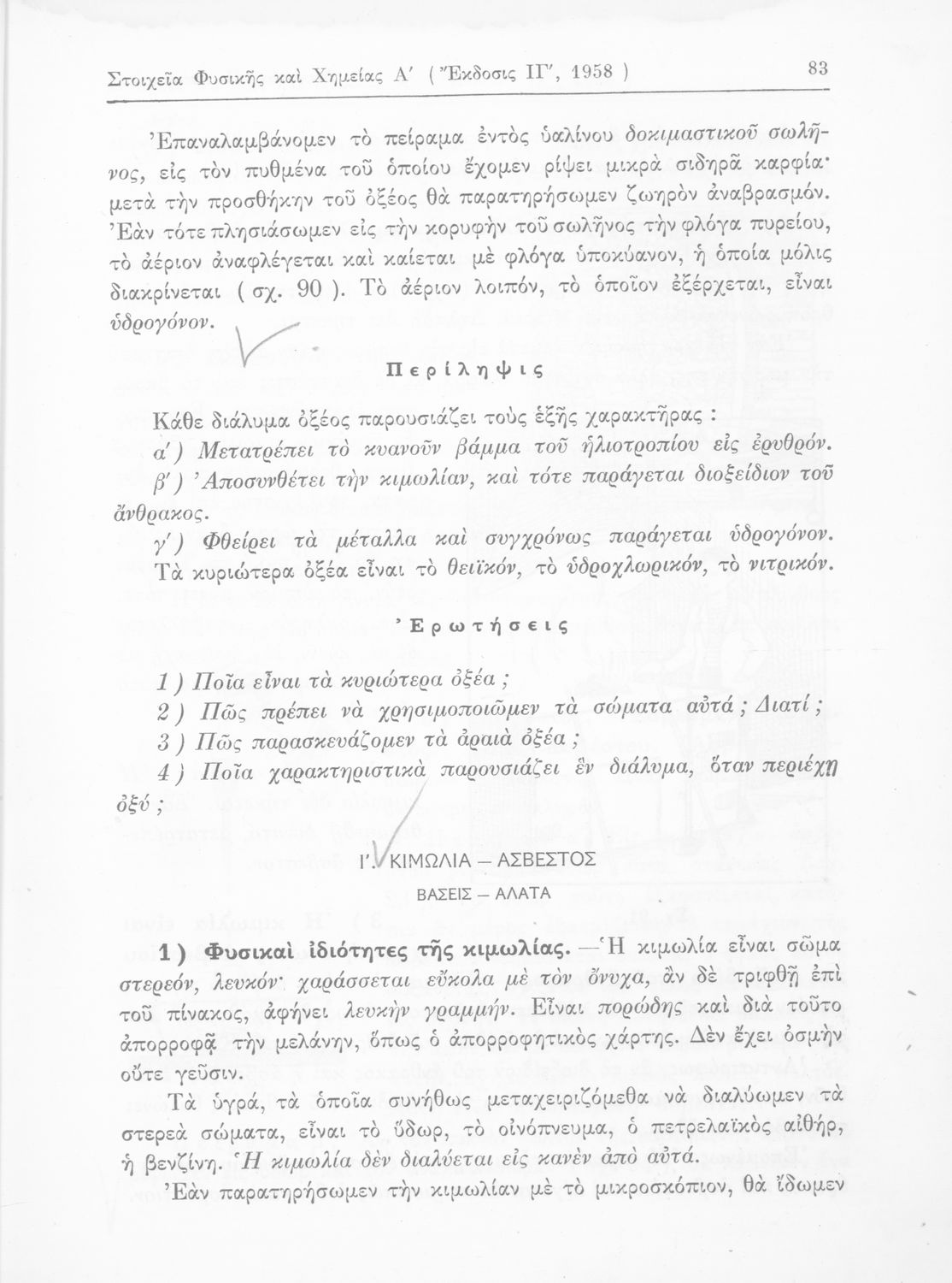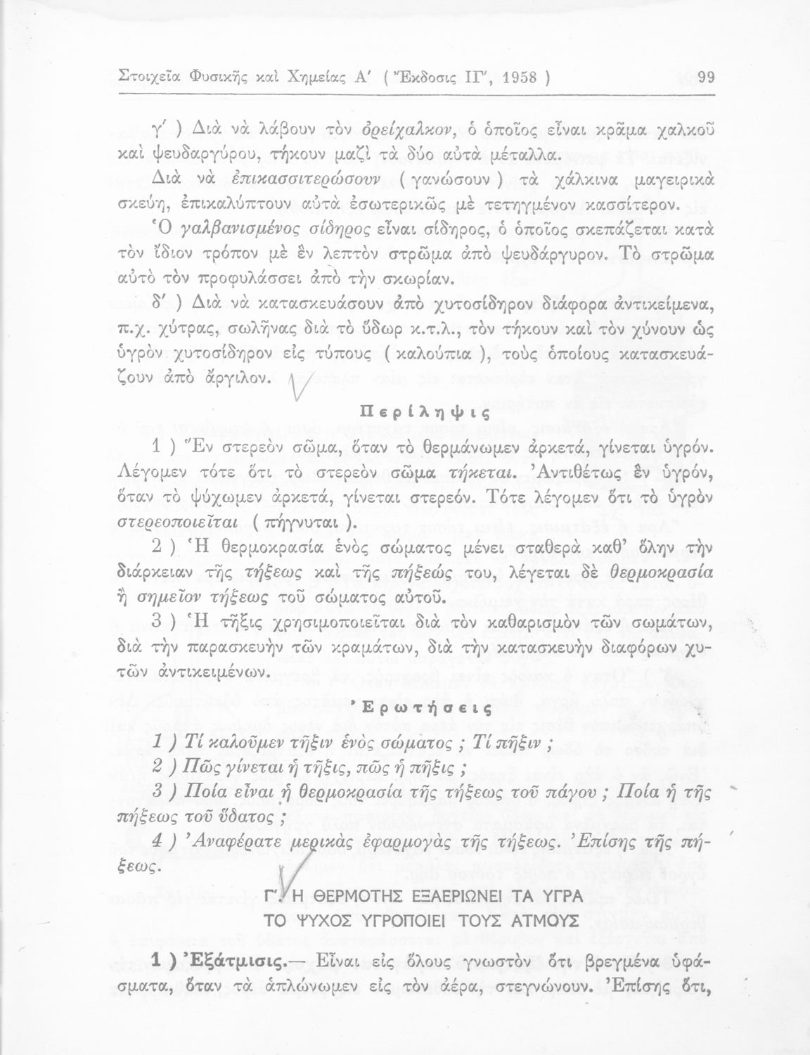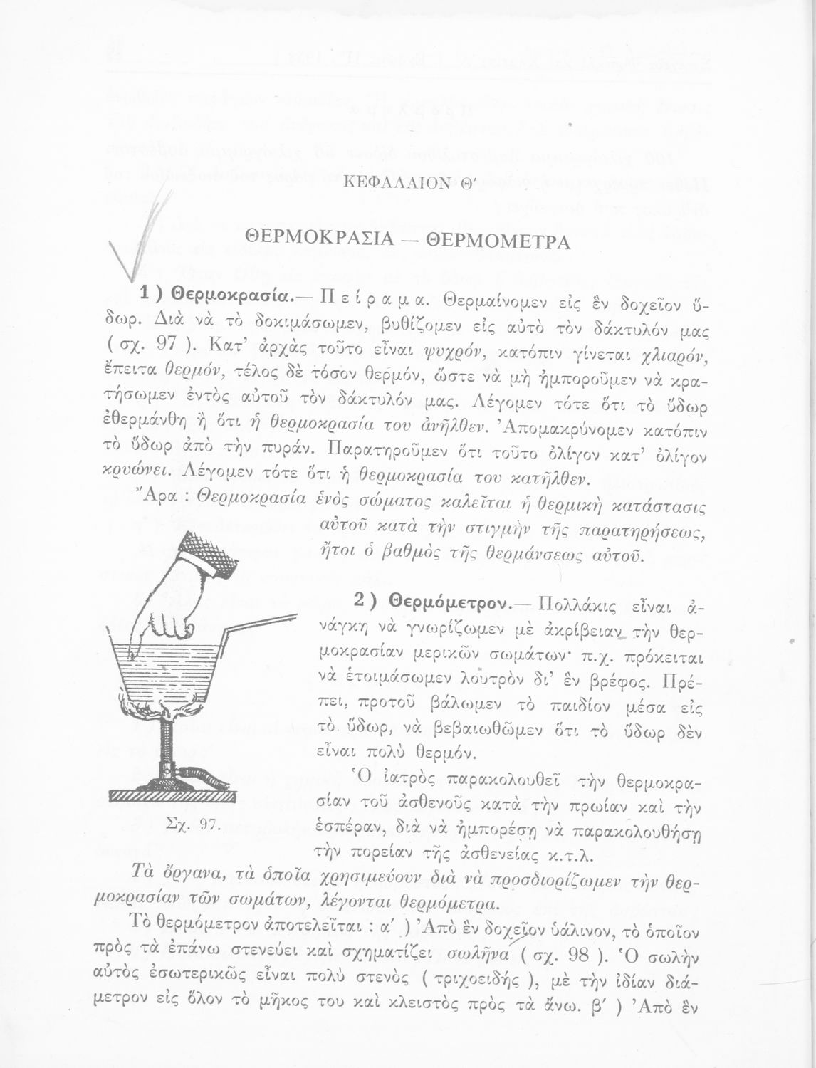 Σχολικό εγχειρίδιο για το μάθημα της Φυσικής στο Γυμνάσιο. Παρέχει βασικές γνώσεις της φυσικής επιστήμης. Αναλύει τα φαινόμενα της αδράνειας, της βαρύτητας, της υδροστατικής πίεσης κ.α. Όσον αφορά τη χημεία αναφέρεται στις ιδιότητες των μετάλλων, τα οξέα, τις βάσεις και τα άλατα. Αναφέρεται στην πρακτική εφαρμογή της φυσικής και της χημείας στην καθημερινότητά. Επίσης, περιλαμβάνει πολλά από τα όργανα, που χρησιμοποιούνται στη φυσική. Περιέχει εικόνες και σχεδιαγράμματα τα οποία βοηθούν τη διδασκαλία.