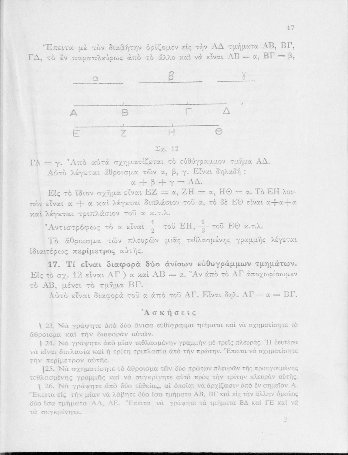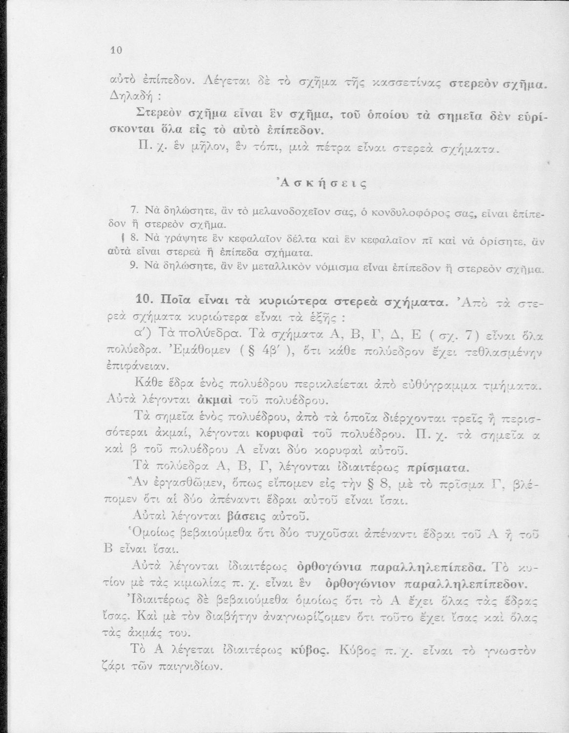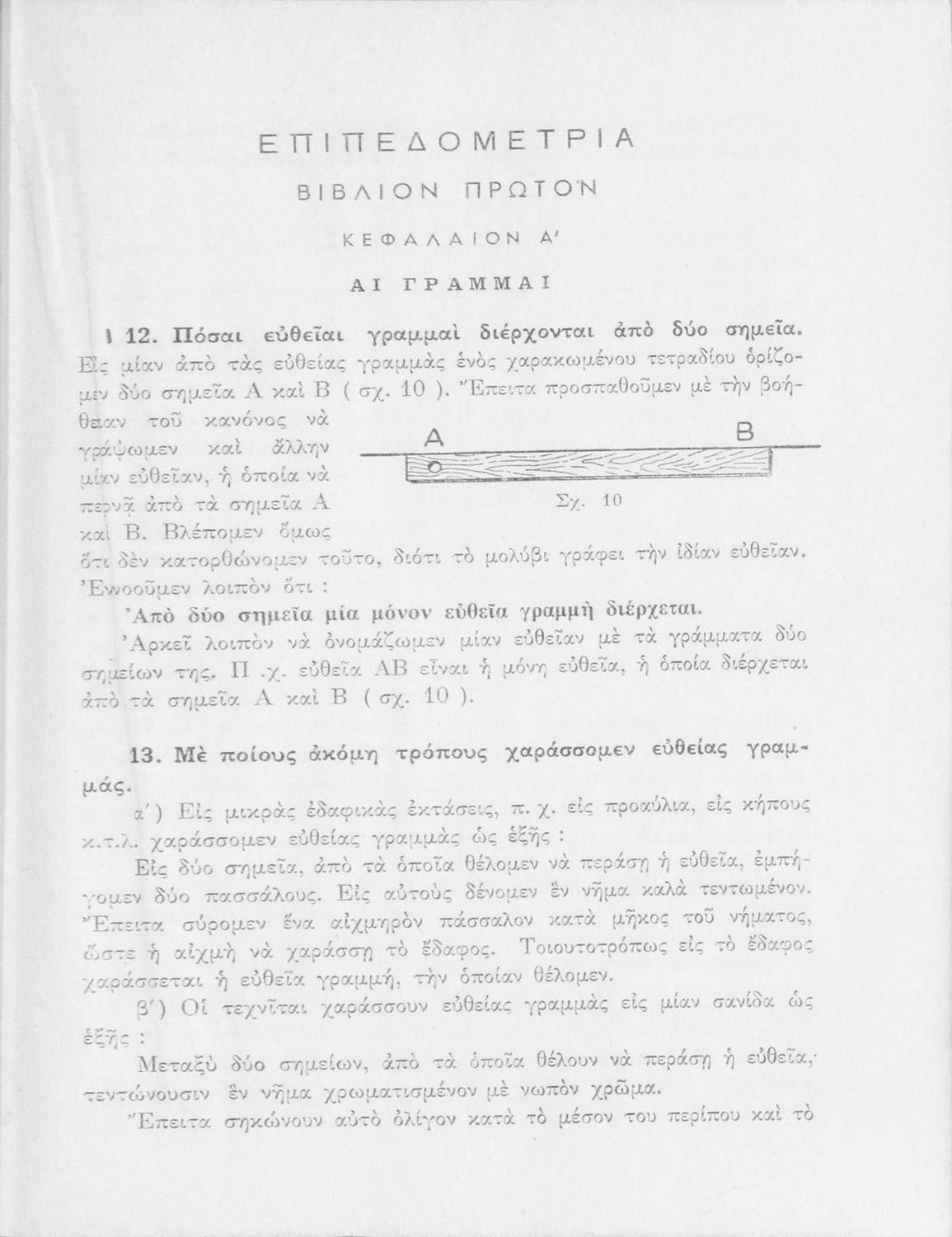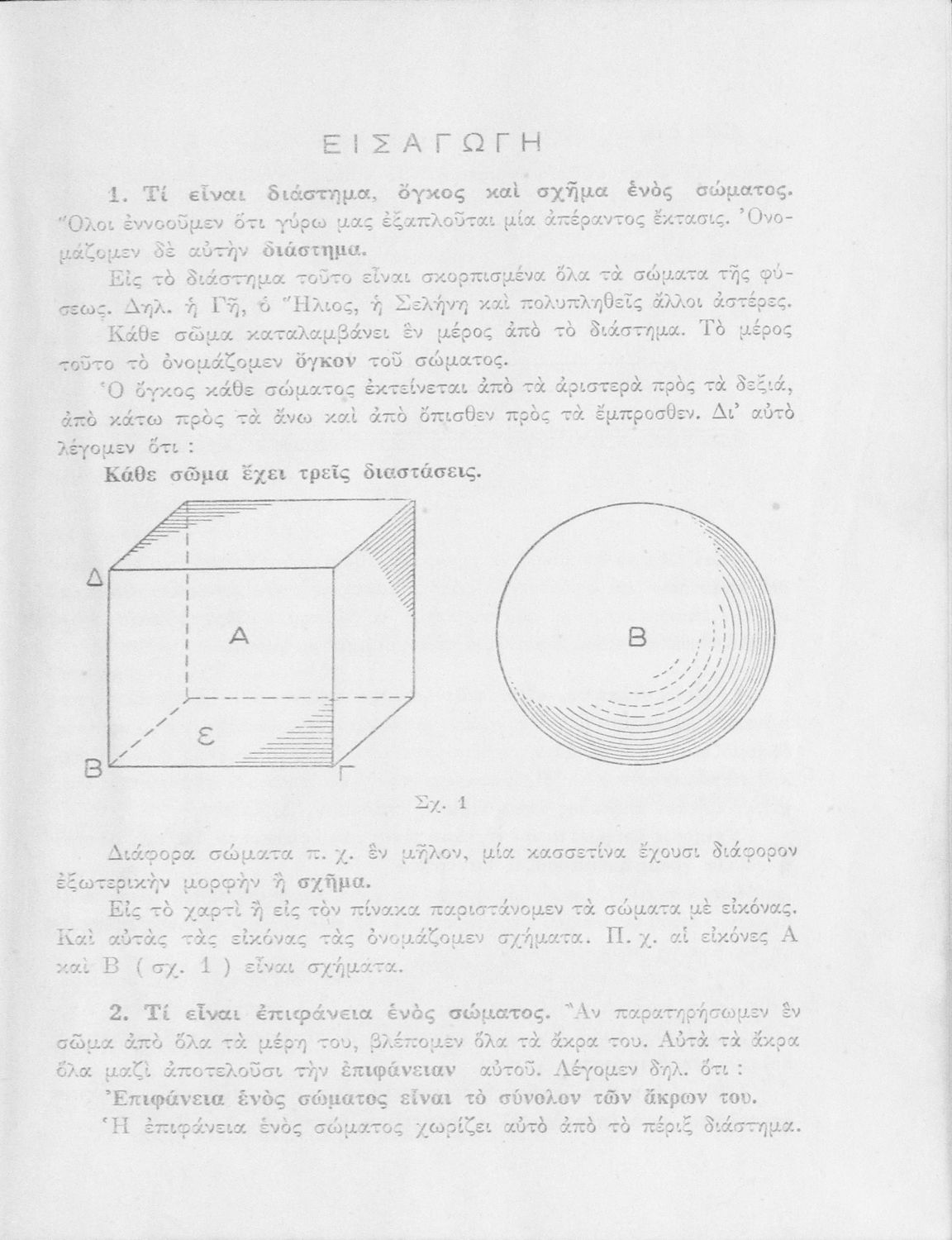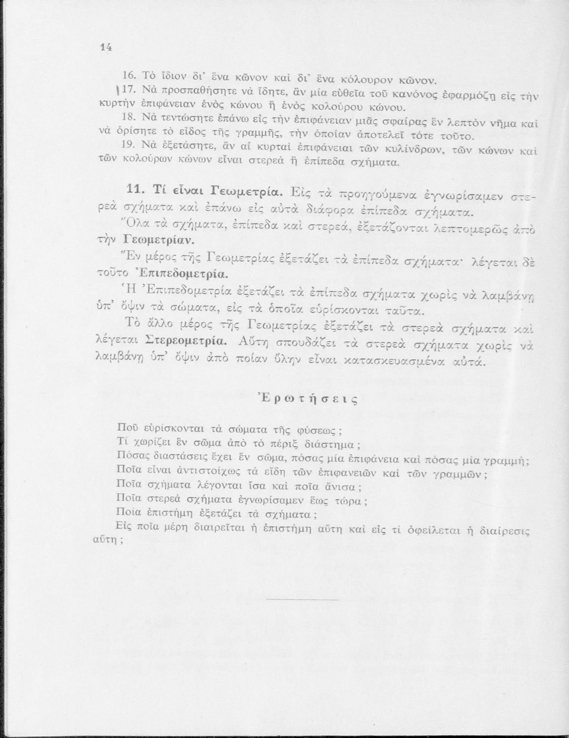 Βαθμίδα εκπαίδευσης: Δευτεροβάθμια Τάξη: Γυμνάσιο Μάθημα: Μαθηματικά Γλώσσα: Απλή καθαρεύουσα Παρουσίαση περιεχομένου: Σχολικό εγχειρίδιο Γεωμετρίας Γυμνασίου που περιλαμβάνει θεωρία και ασκήσεις και είναι χωρισμένο σε Επιπεδομετρία και Στερεομετρία. |