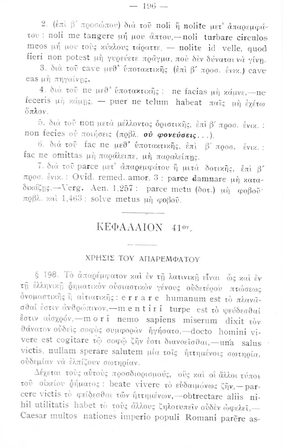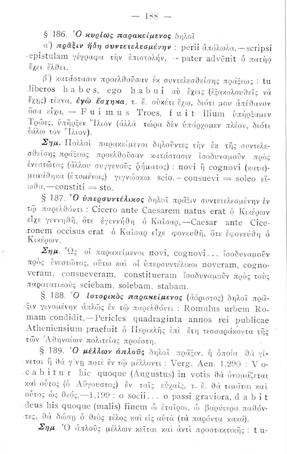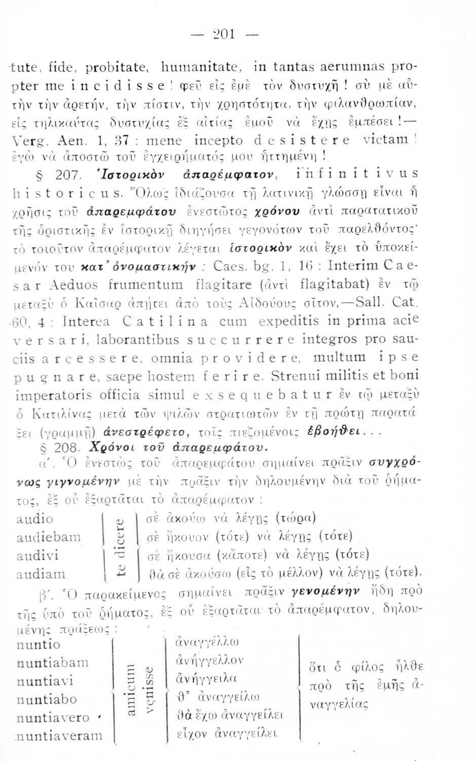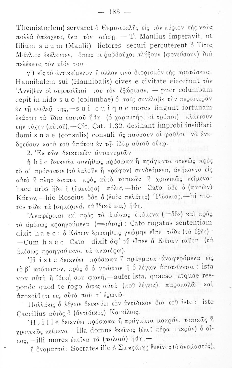 Σχολικό εγχειρίδιο Λατινικών Α΄, Β΄, Γ' Γυμνασίου που περιλαμβάνει γραμματική και συντακτικό και είναι χωρισμένο σε φθογγολογικό, τυπολογικό και ετυμολογικό μέρος.
