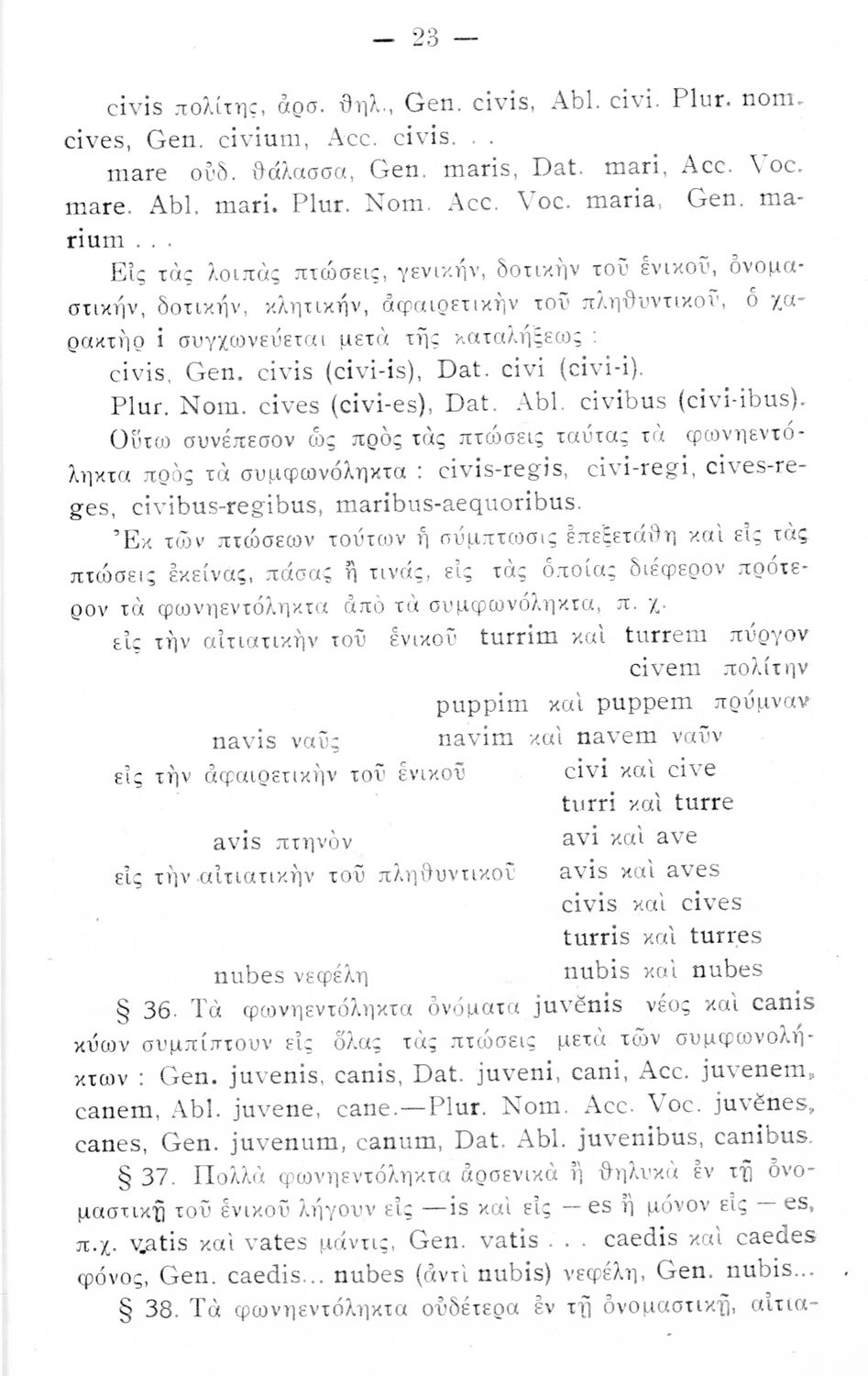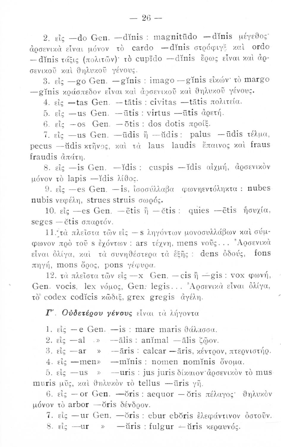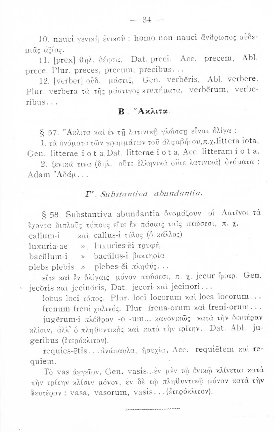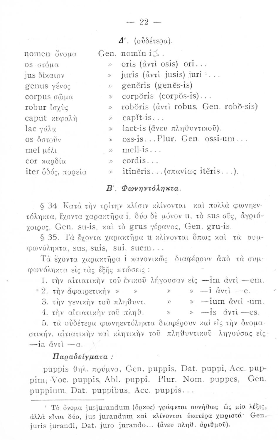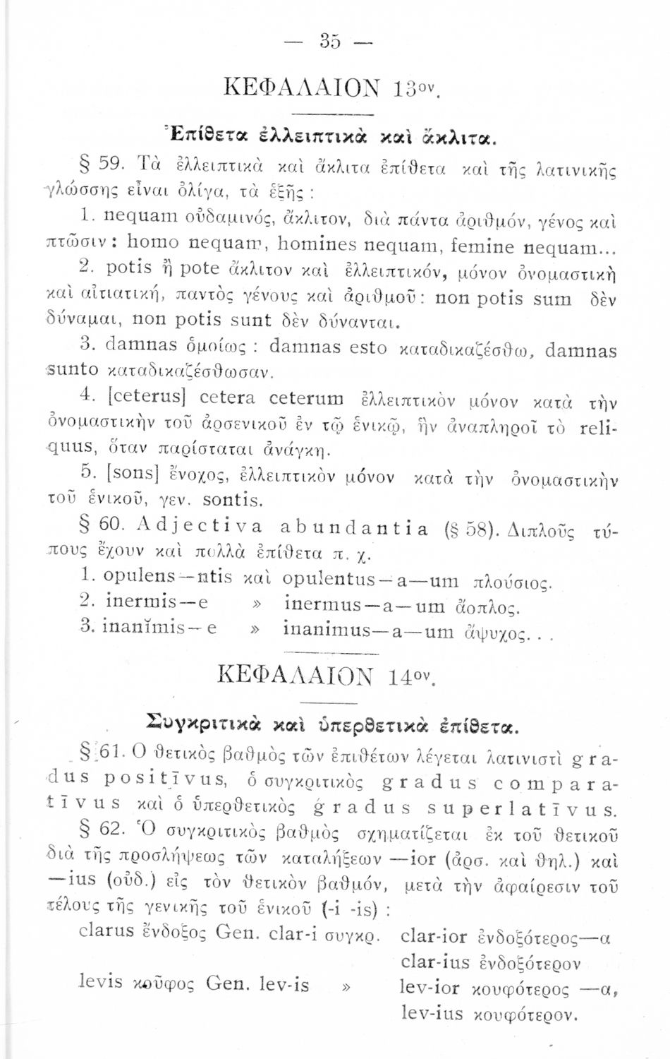 Σχολικό εγχειρίδιο Λατινικών Γυμνασίου που περιλαμβάνει γραμματική και συντακτικό και είναι χωρισμένο σε φθογγολογικό, τυπολογικό και ετυμολογικό μέρος. Περιέχει και μετρικό παράρτημα. Ο συγγραφέας ήταν καθηγητής της Λατινικής Φιλολογίας στο πανεπιστήμιο.