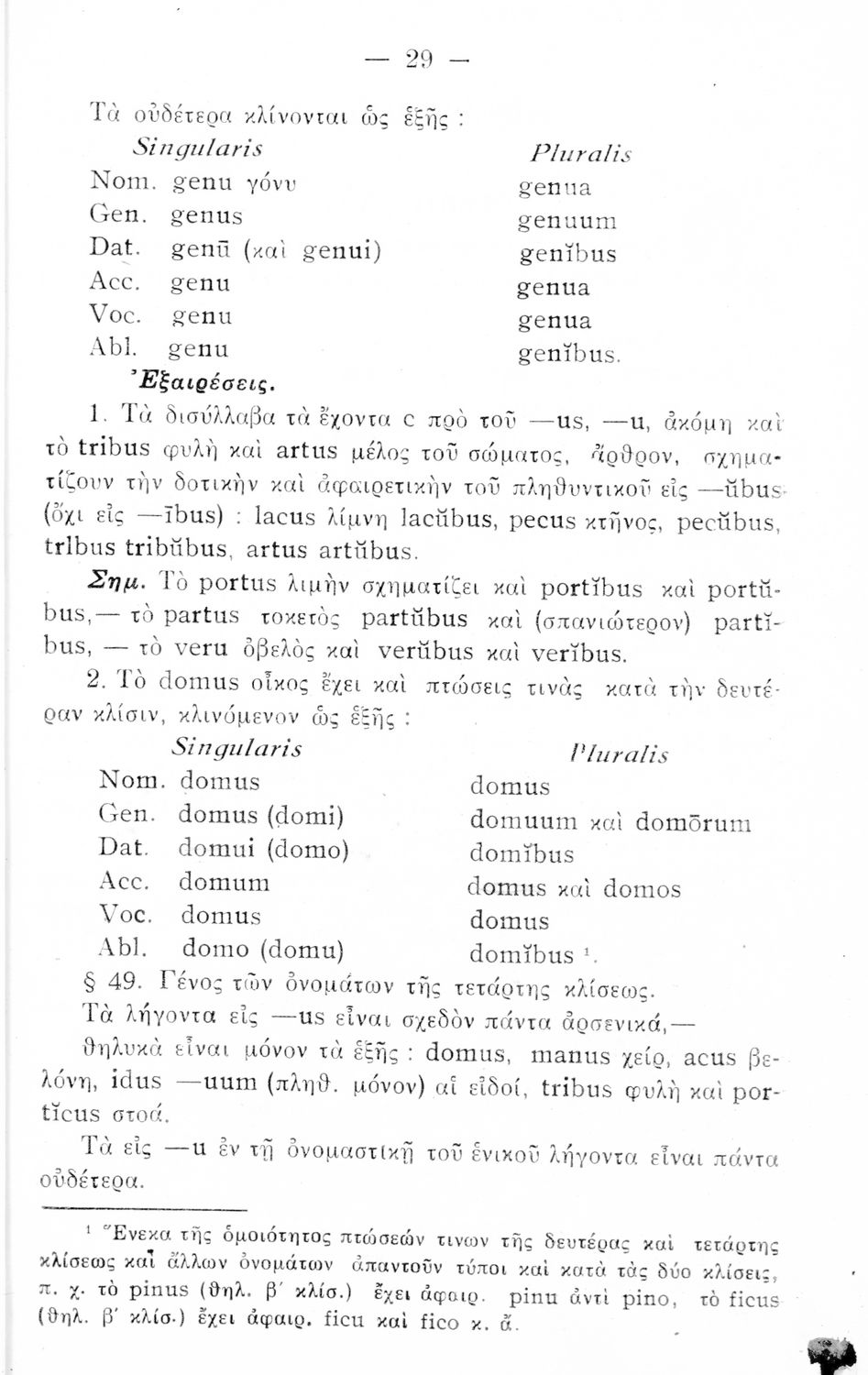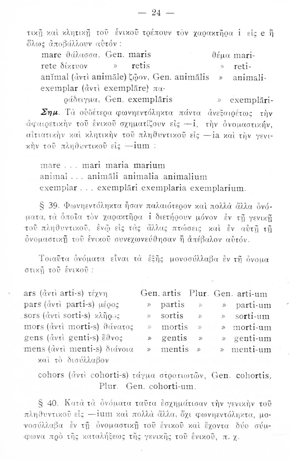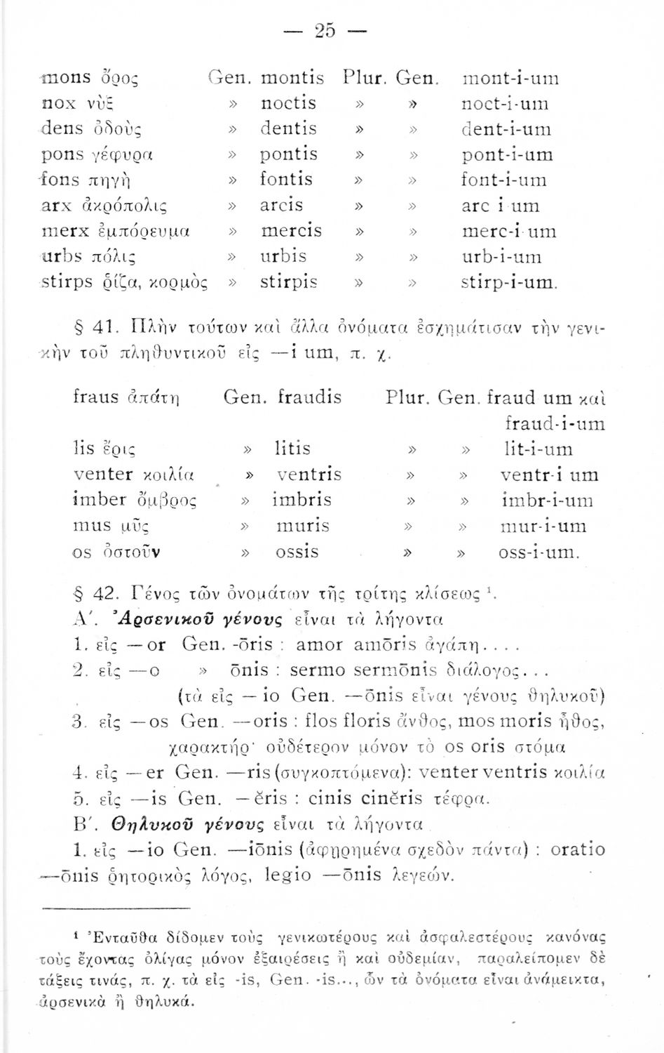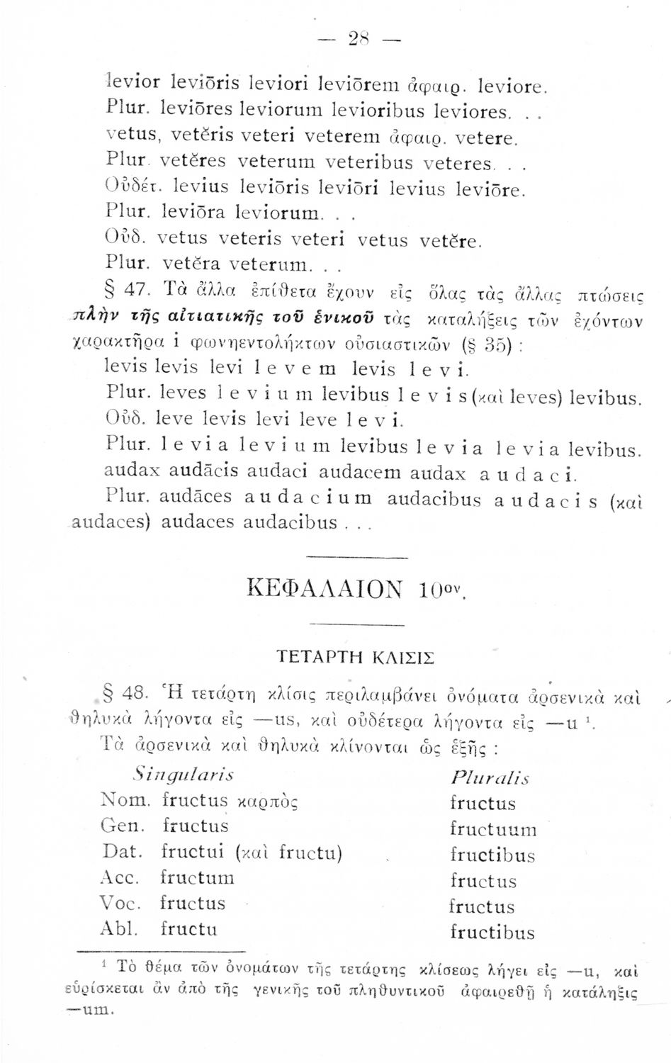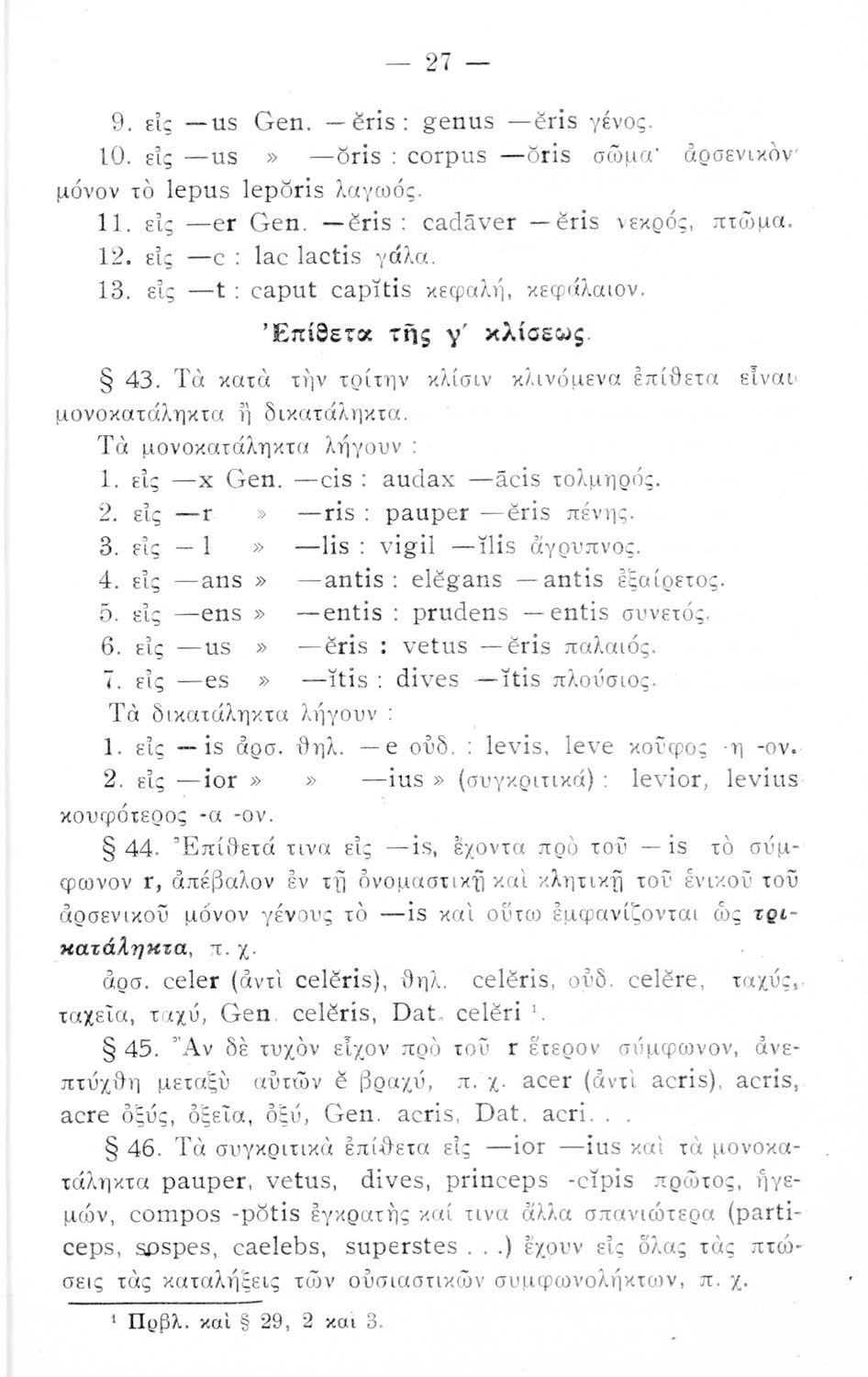Σχολικό εγχειρίδιο Λατινικών Γυμνασίου που περιλαμβάνει γραμματική και συντακτικό και είναι χωρισμένο σε φθογγολογικό, τυπολογικό και ετυμολογικό μέρος. Περιέχει και μετρικό παράρτημα. Ο συγγραφέας ήταν καθηγητής της Λατινικής Φιλολογίας στο πανεπιστήμιο.