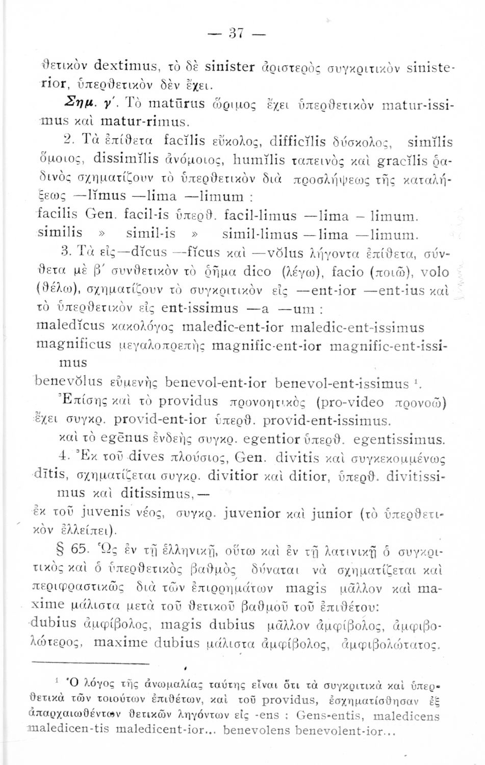 Βαθμίδα εκπαίδευσης: Δευτεροβάθμια Τάξη: Γυμνάσιο Μάθημα: Λατινικά Γλώσσα: Καθαρεύουσα Παρουσίαση περιεχομένου: Σχολικό εγχειρίδιο Λατινικών Γυμνασίου που περιλαμβάνει γραμματική και συντακτικό και είναι χωρισμένο σε φθογγολογικό, τυπολογικό και ετυμολογικό μέρος. Περιέχει και μετρικό παράρτημα. Ο συγγραφέας ήταν καθηγητής της Λατινικής Φιλολογίας στο πανεπιστήμιο. |