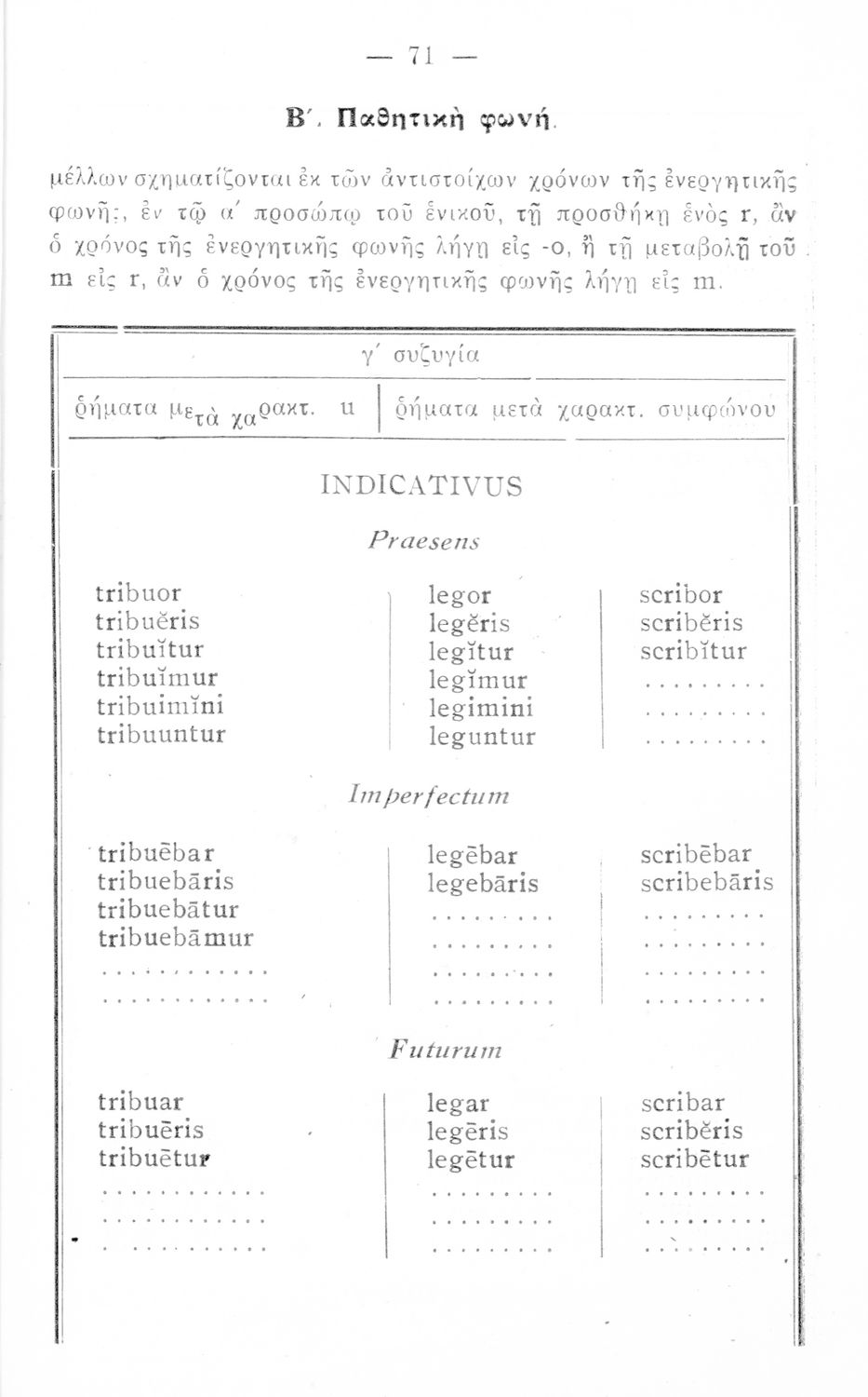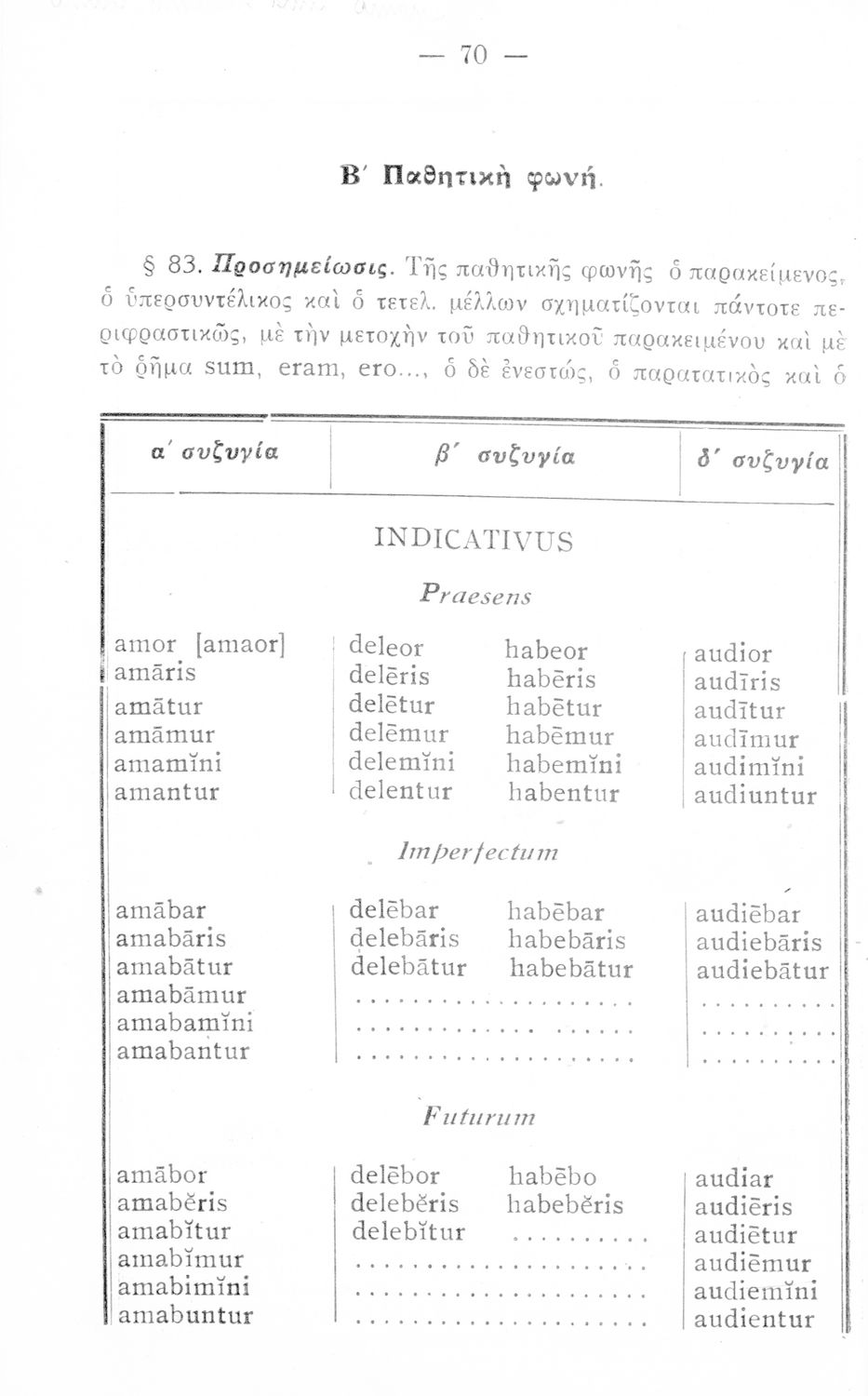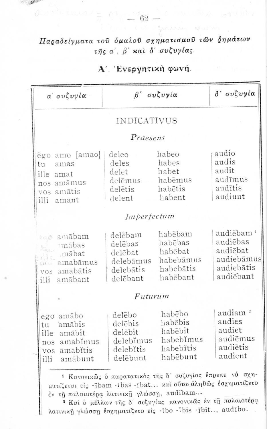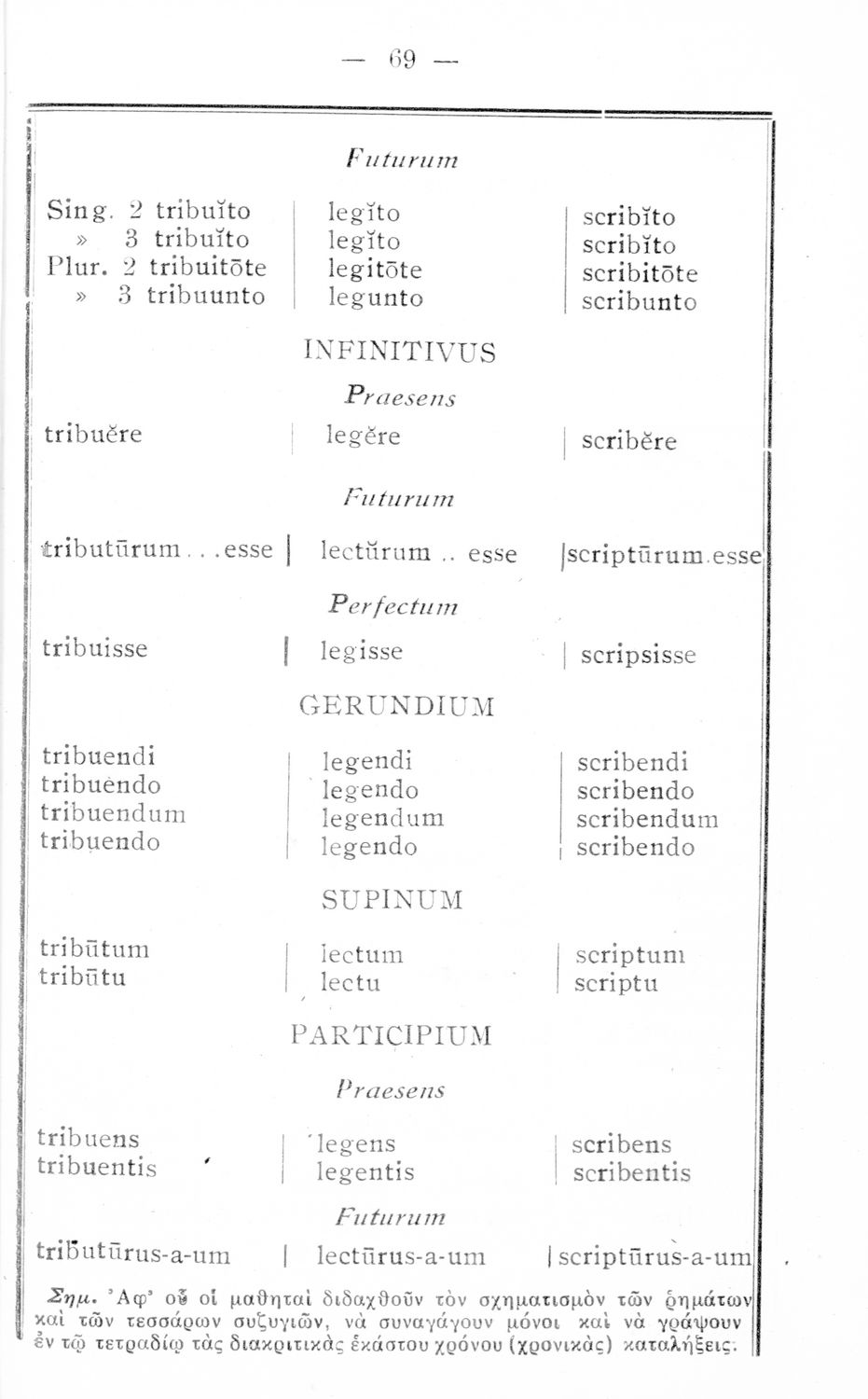 Σχολικό εγχειρίδιο Λατινικών Α΄, Β΄, Γ' Γυμνασίου που περιλαμβάνει γραμματική και συντακτικό και είναι χωρισμένο σε φθογγολογικό, τυπολογικό και ετυμολογικό μέρος.