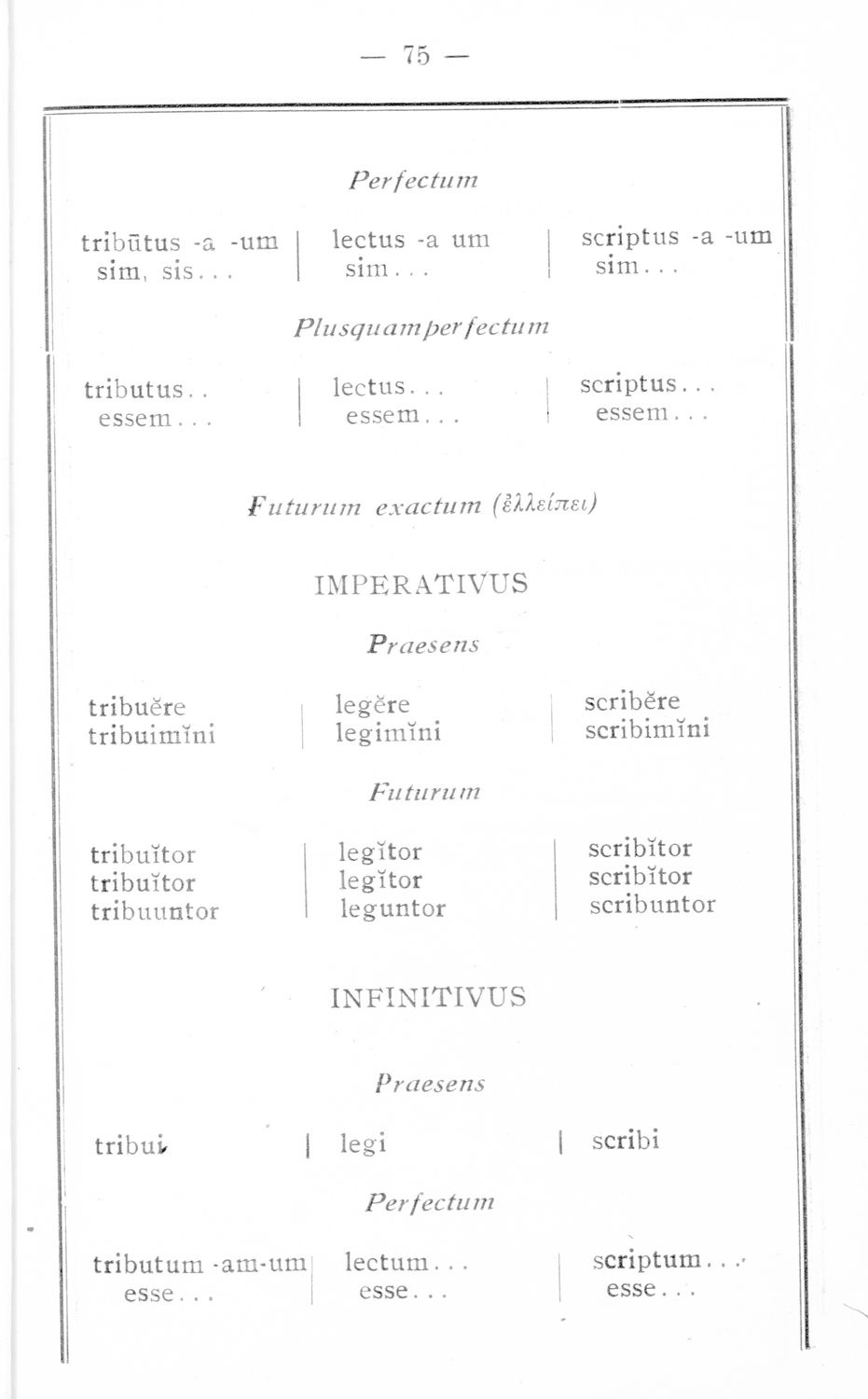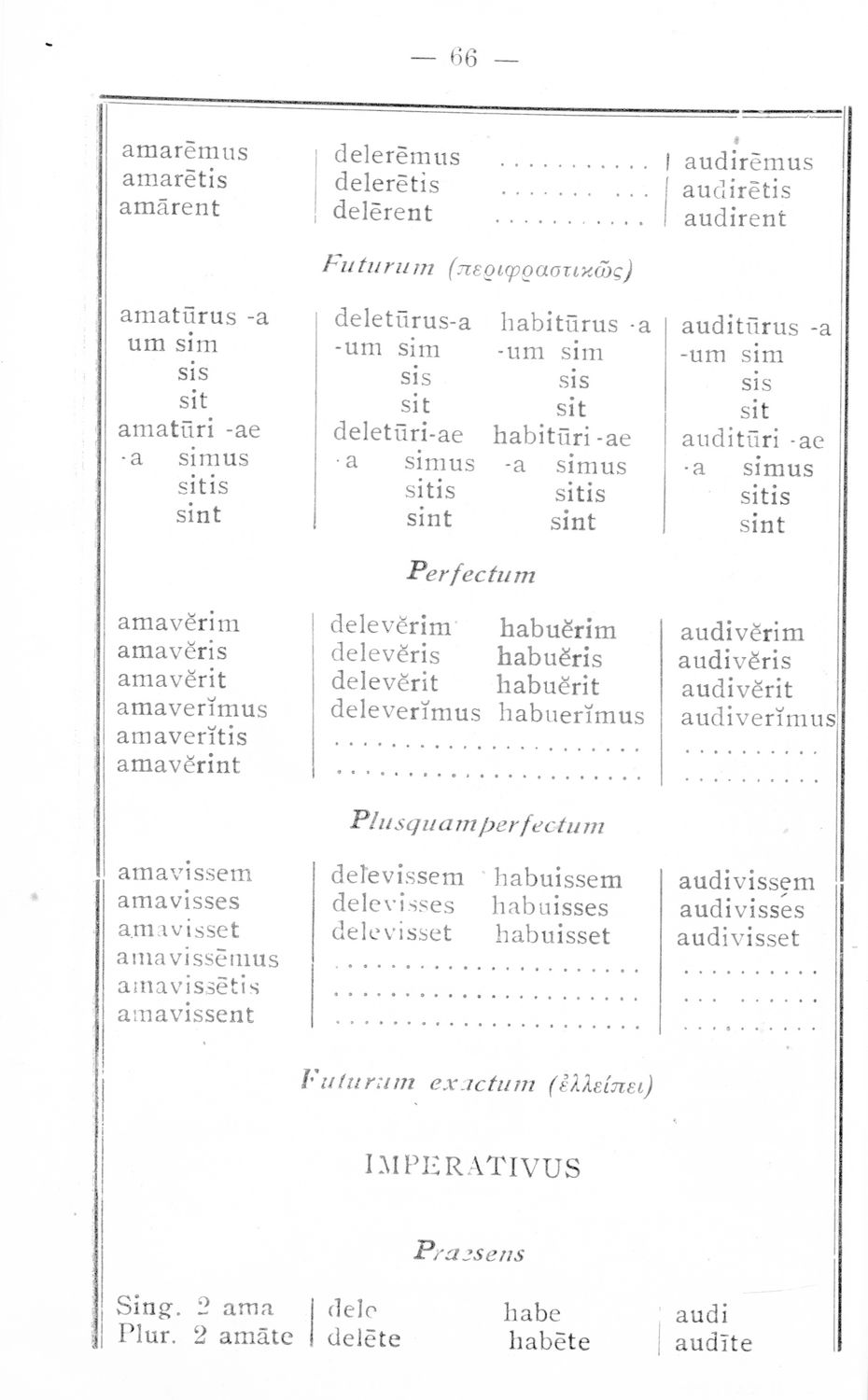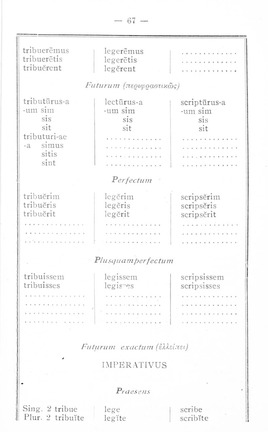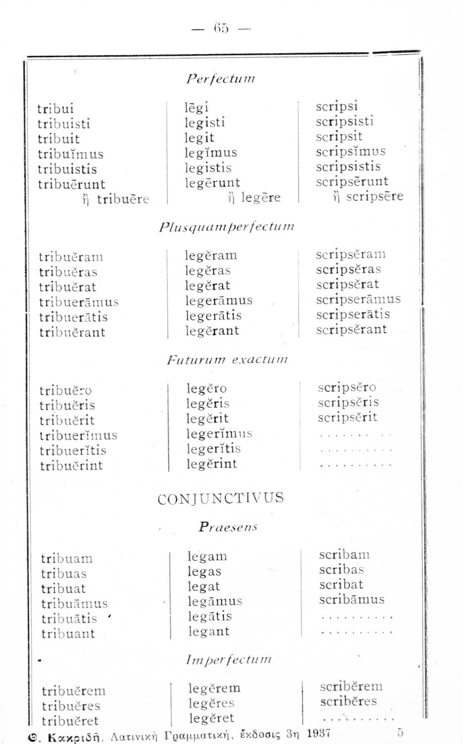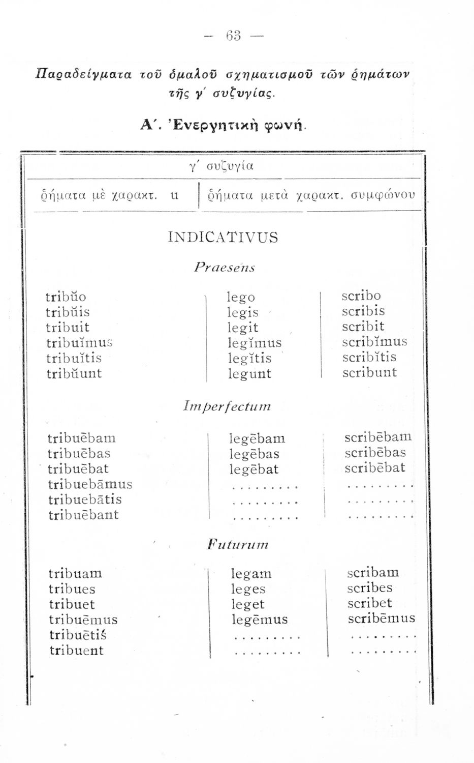 Σχολικό εγχειρίδιο Λατινικών Α΄, Β΄, Γ' Γυμνασίου που περιλαμβάνει γραμματική και συντακτικό και είναι χωρισμένο σε φθογγολογικό, τυπολογικό και ετυμολογικό μέρος.