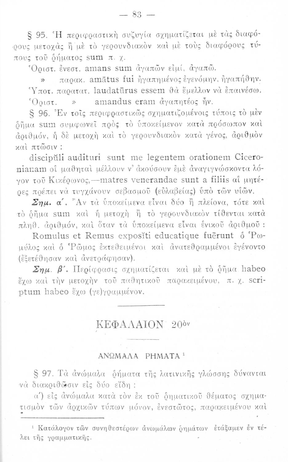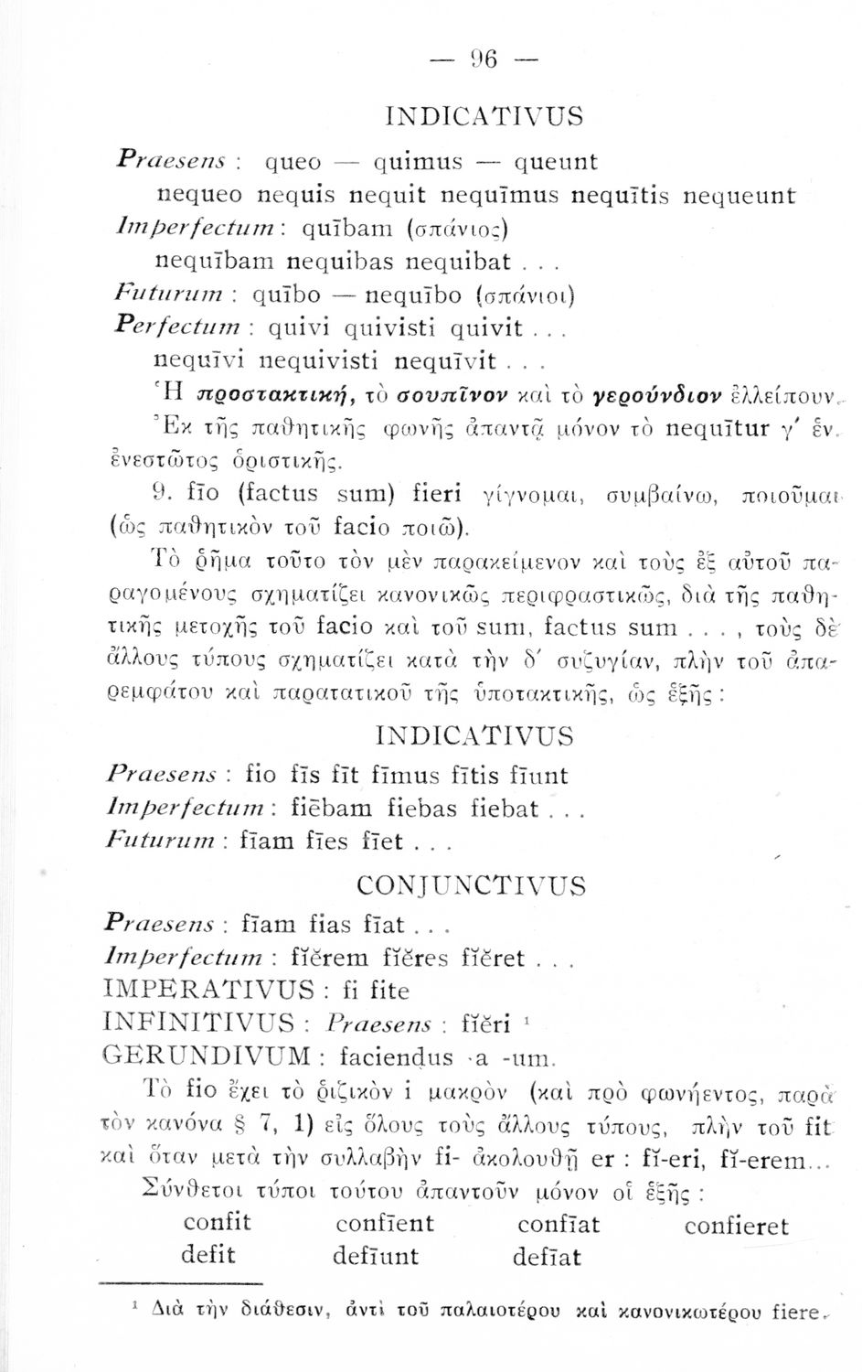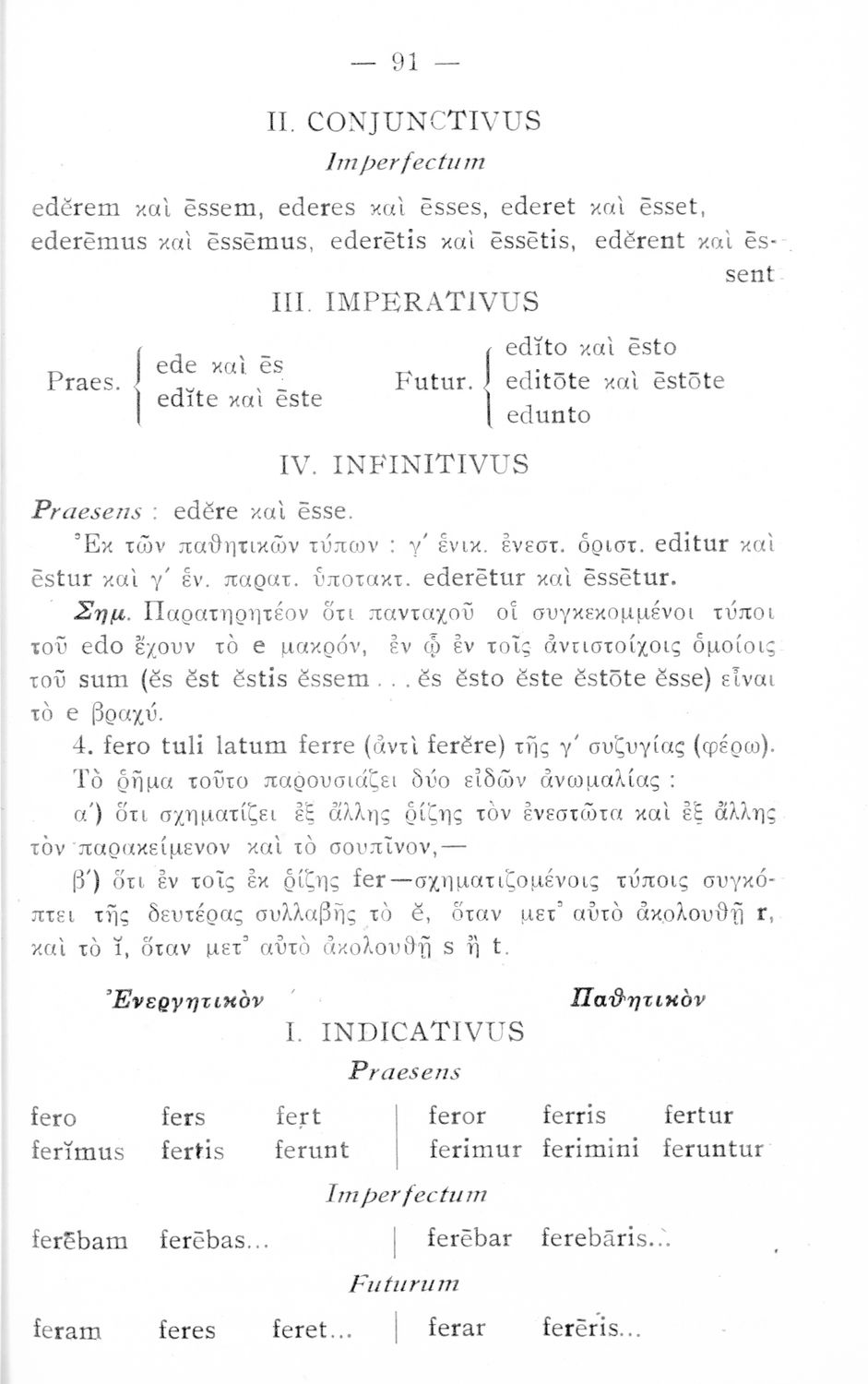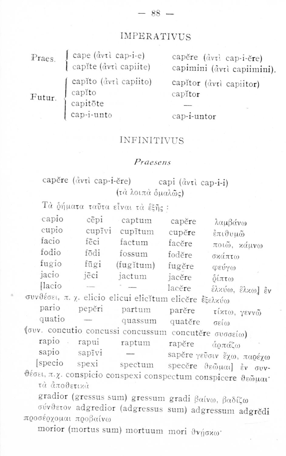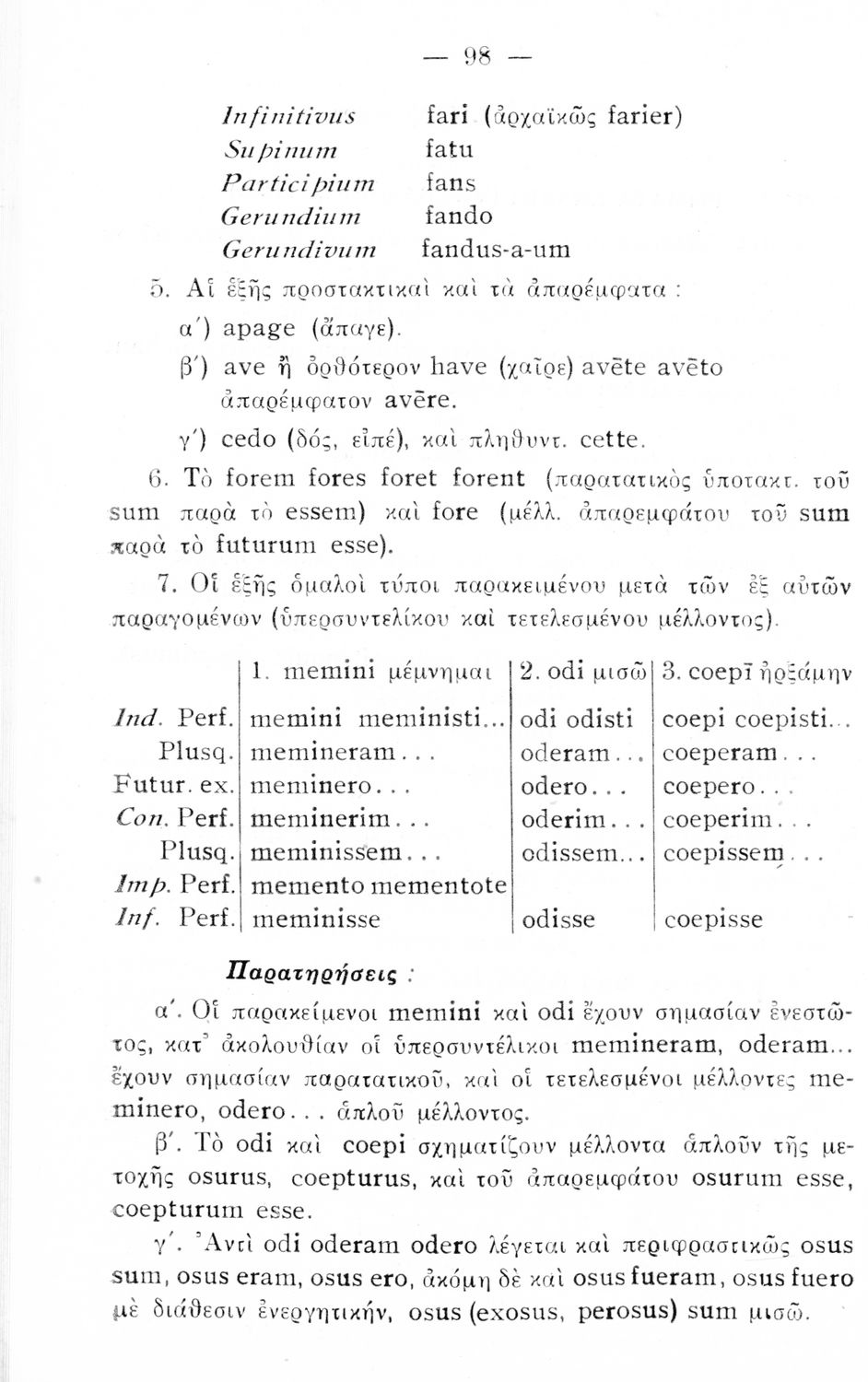 Σχολικό εγχειρίδιο Λατινικών Α΄, Β΄, Γ' Γυμνασίου που περιλαμβάνει γραμματική και συντακτικό και είναι χωρισμένο σε φθογγολογικό, τυπολογικό και ετυμολογικό μέρος.