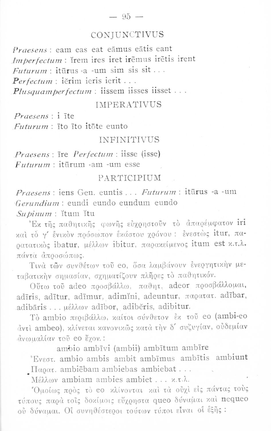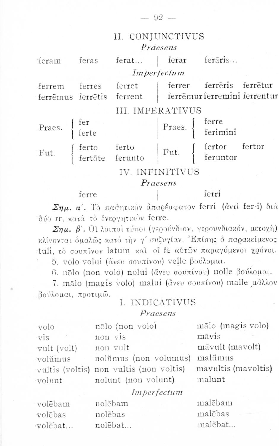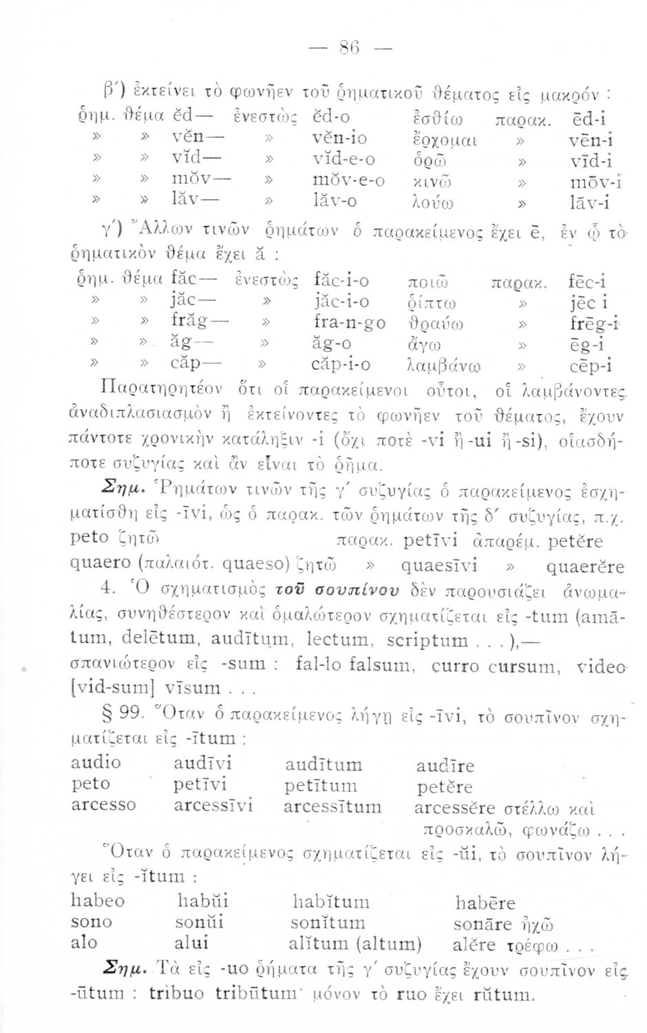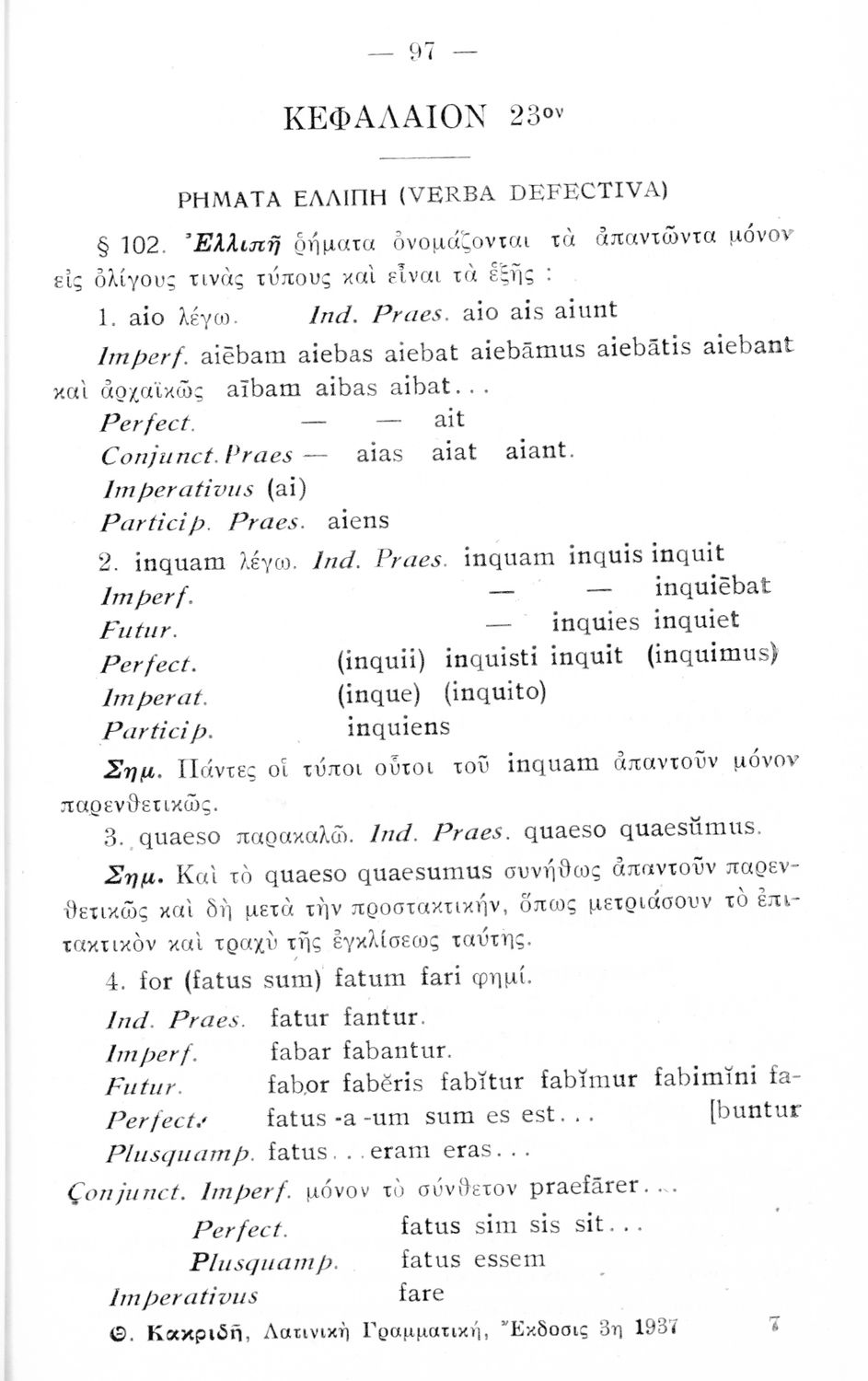 Σχολικό εγχειρίδιο Λατινικών Α΄, Β΄, Γ' Γυμνασίου που περιλαμβάνει γραμματική και συντακτικό και είναι χωρισμένο σε φθογγολογικό, τυπολογικό και ετυμολογικό μέρος.