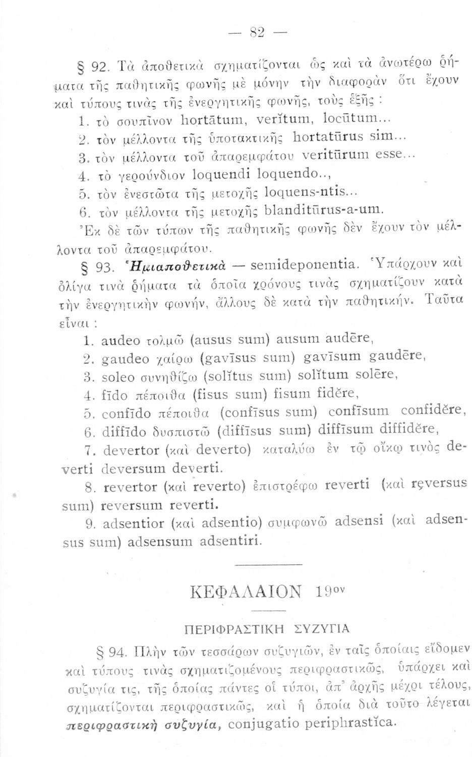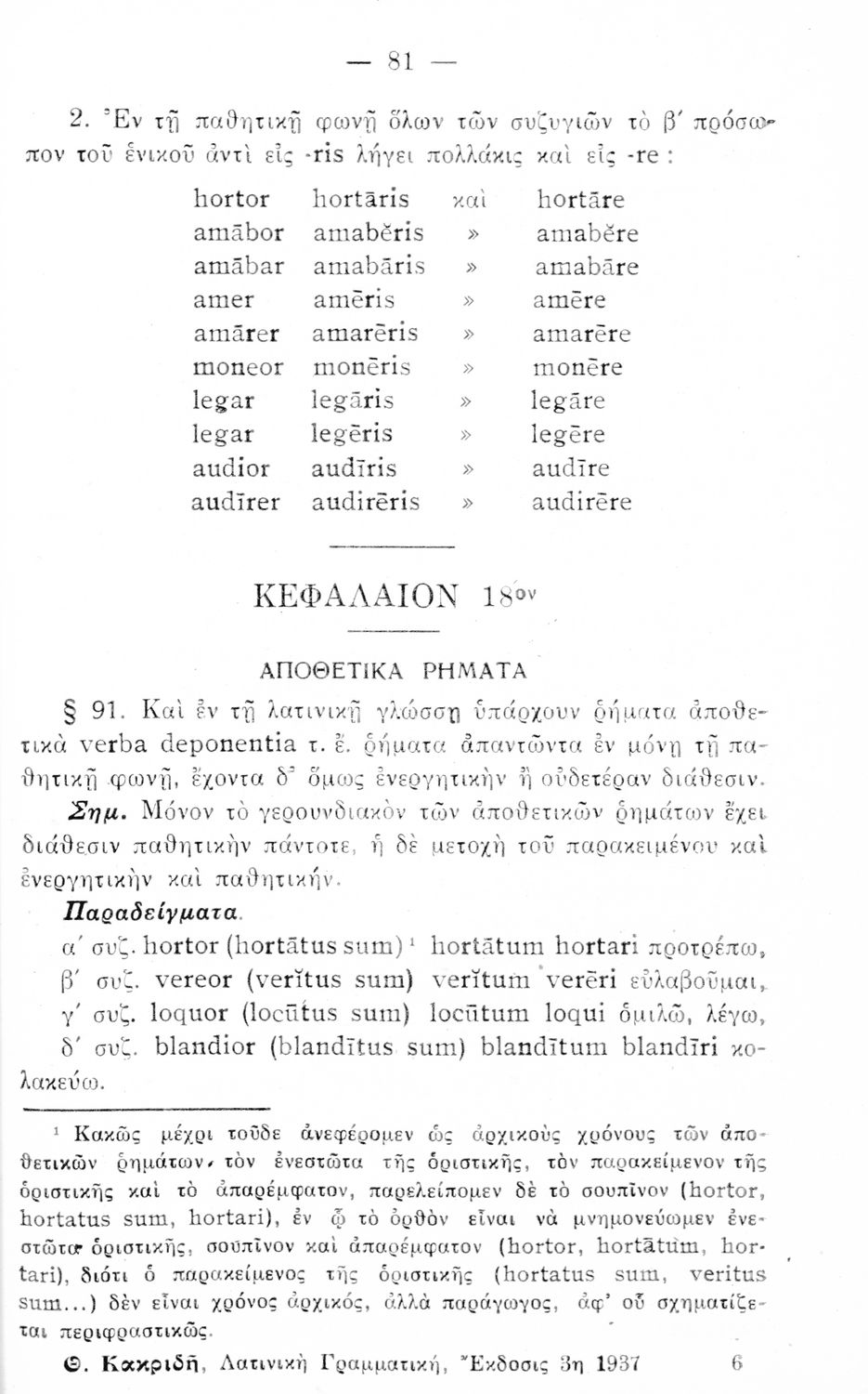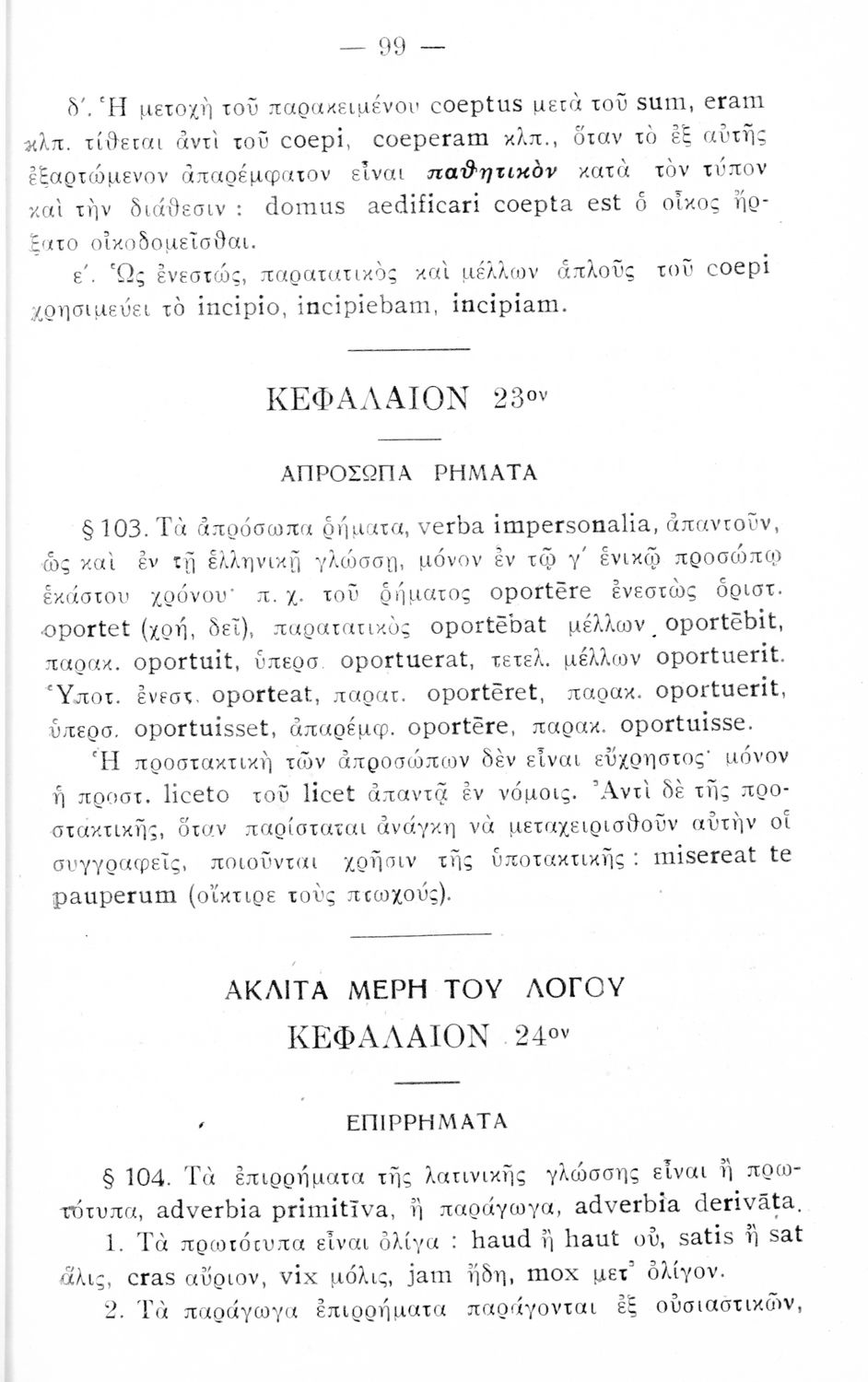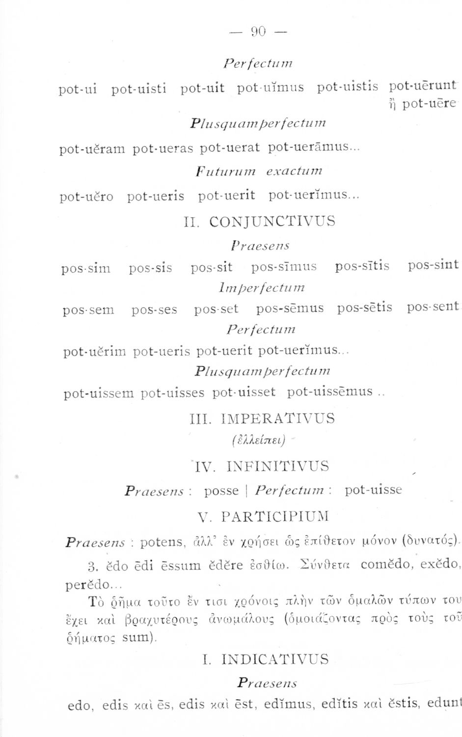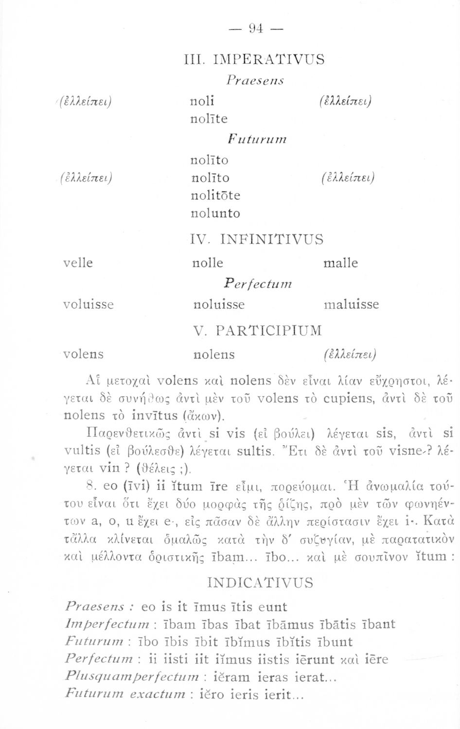Σχολικό εγχειρίδιο Λατινικών Α΄, Β΄, Γ' Γυμνασίου που περιλαμβάνει γραμματική και συντακτικό και είναι χωρισμένο σε φθογγολογικό, τυπολογικό και ετυμολογικό μέρος.