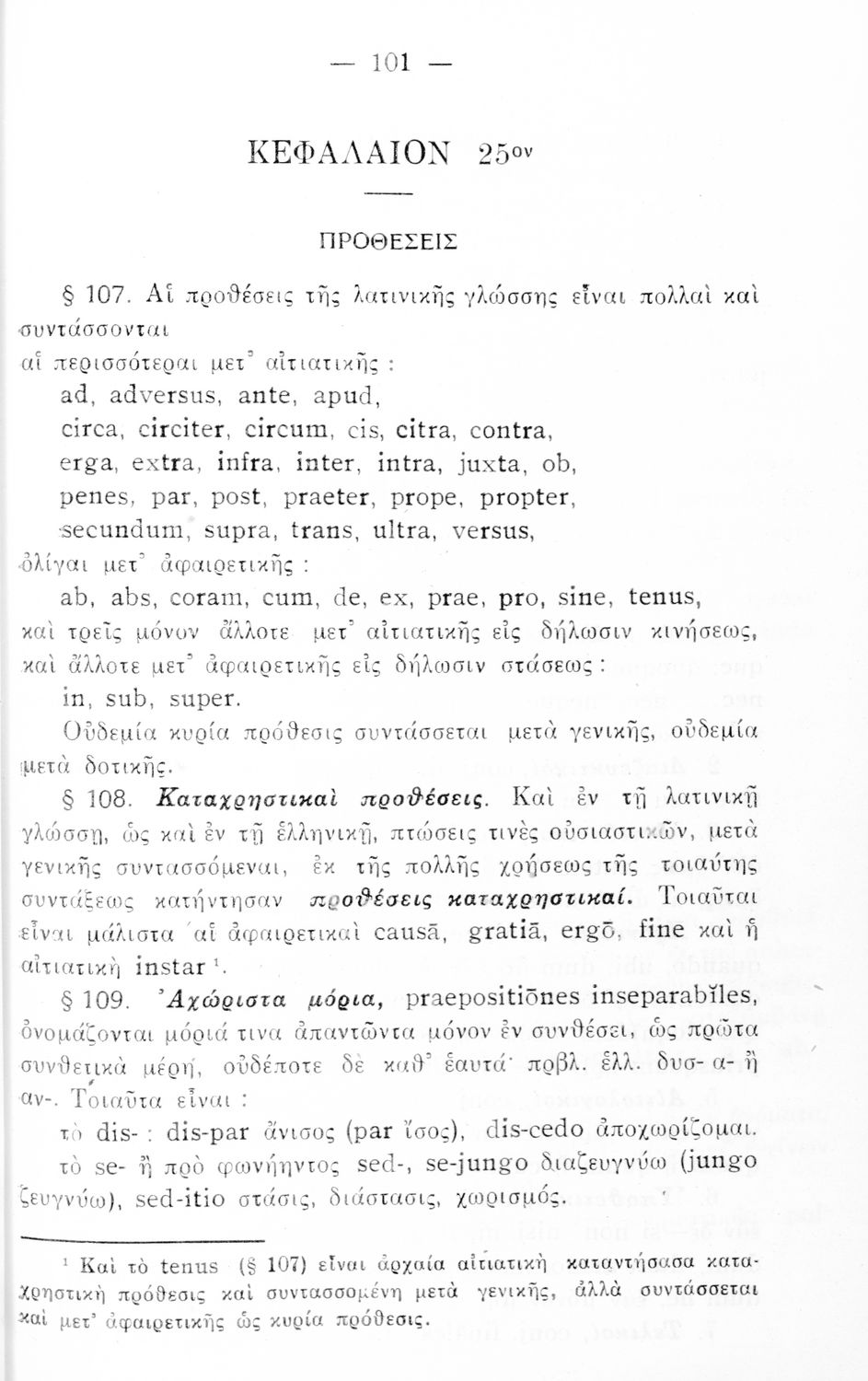 Παρουσίαση περιεχομένου: Σχολικό εγχειρίδιο Λατινικών Γυμνασίου που περιλαμβάνει γραμματική και συντακτικό και είναι χωρισμένο σε φθογγολογικό, τυπολογικό και ετυμολογικό μέρος. Περιέχει και μετρικό παράρτημα. Ο συγγραφέας ήταν καθηγητής της Λατινικής Φιλολογίας στο πανεπιστήμιο.