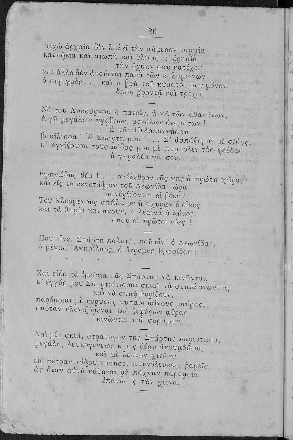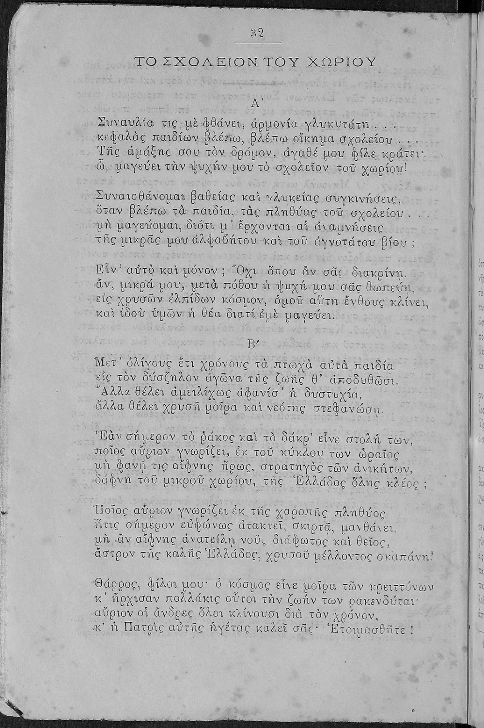 Σχολικό εγχειρίδιο Νέων Ελληνικών του 1889. Περιέχει πεζά και ποιήματα Ελλήνων λογοτεχνών εμπνευσμένα από την καθημερινή και ιστορική ζωή του τόπου. Έχει την έγκριση του Υπουργείου Δημόσιας Εκπαίδευσης.