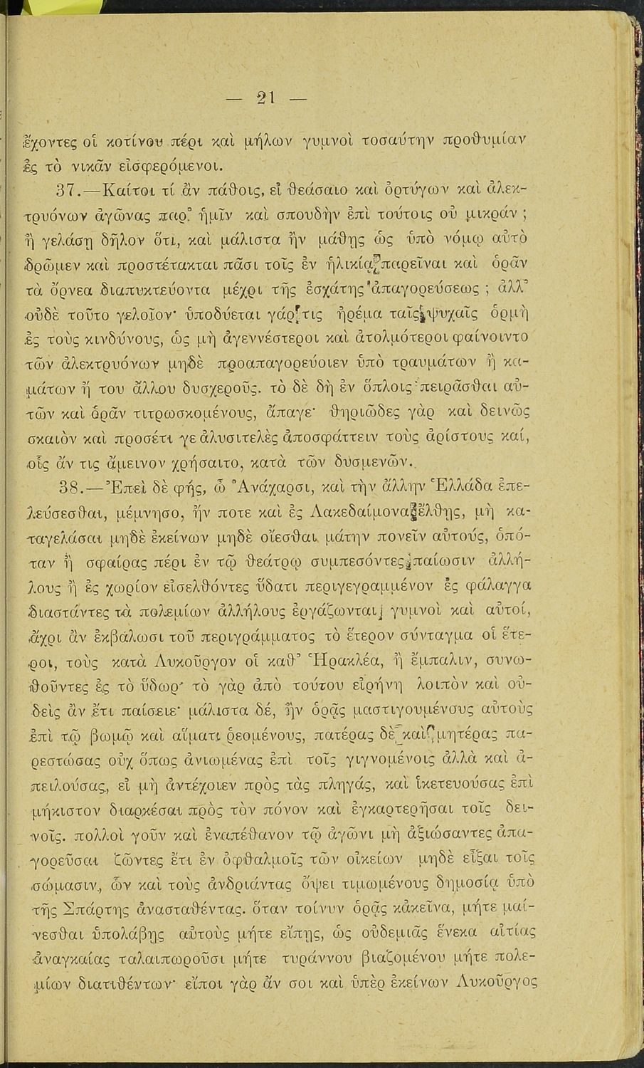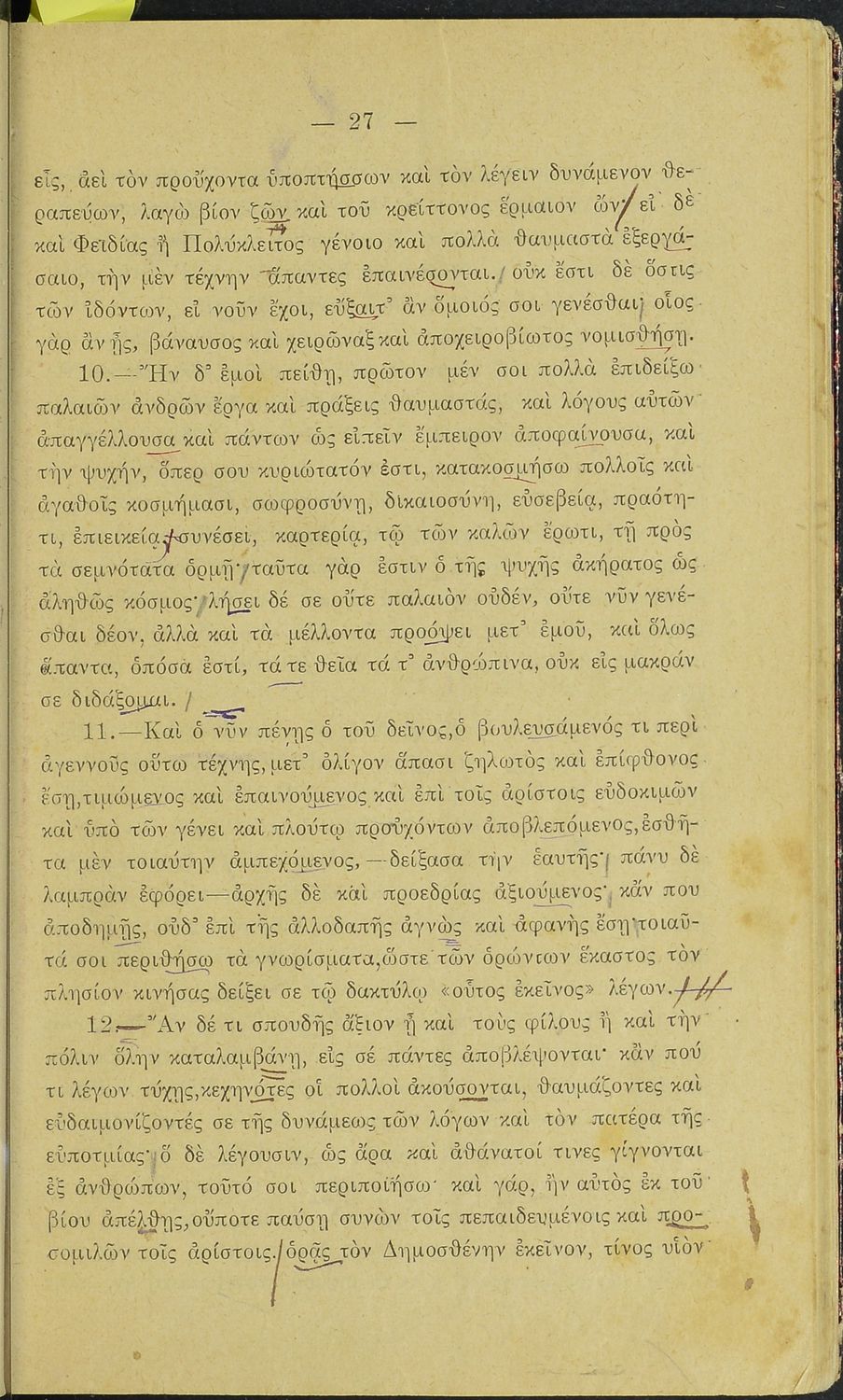 Μαθητικό βοήθημα Αρχαίων Ελληνικών της τρίτης τάξης των τετρατάξιων Γυμνασίων. Το βιβλίο περιέχει τα έργα του Δημοσθένη, Περί της ειρήνης και Α΄ Φιλιππικός από μετάφραση.