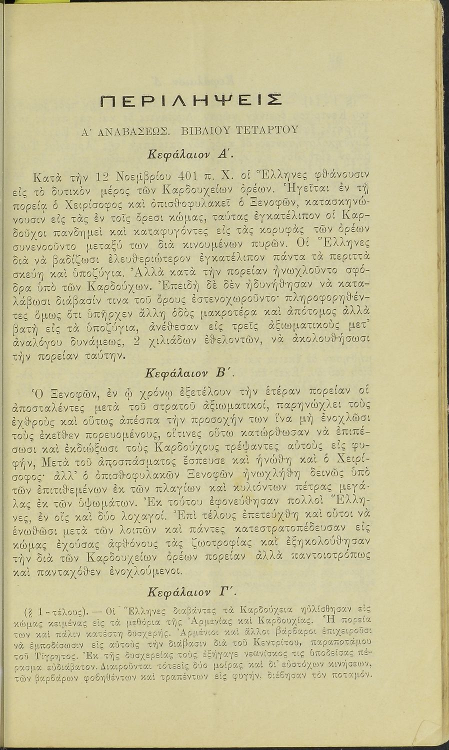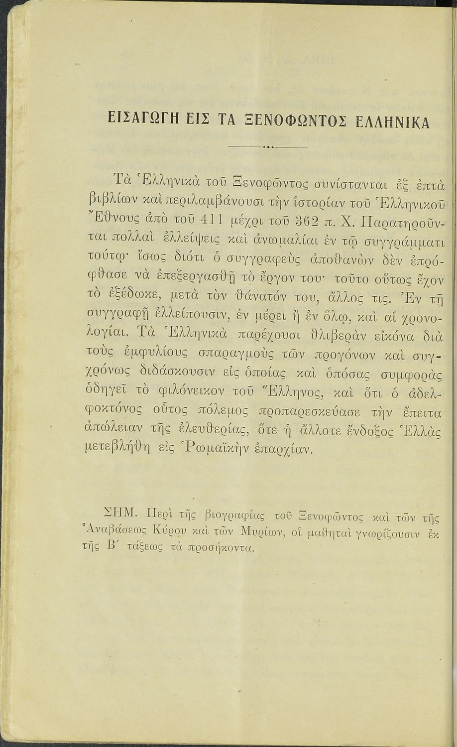 Σχολικό εγχειρίδιο Αρχαίων Ελληνικών Γ' Ελληνικού Σχολείου και Γ΄ Αστικού Σχολείου Θηλέων που περιλαμβάνει αποσπάσματα τα έργα του Ξενοφώντα Κύρου Ανάβαση και Ελληνικά και ερμηνευτικές και λεξιλογικές παρατηρήσεις.