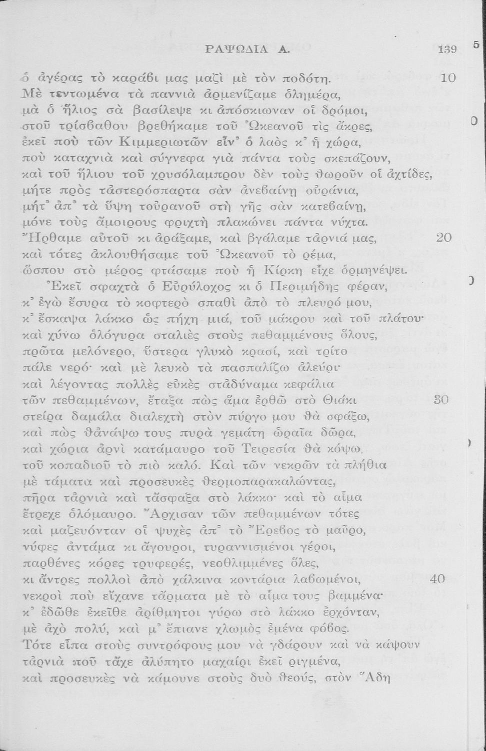 Σχολικό εγχειρίδιο Αρχαίων Ελληνικών Γυμνασίου που περιλαμβάνει αποσπάσματα από τις ραψωδίες της Οδύσσειας, ερμηνευτικά και πραγματολογικά σχόλια, και λεξιλογικές παρατηρήσεις.
