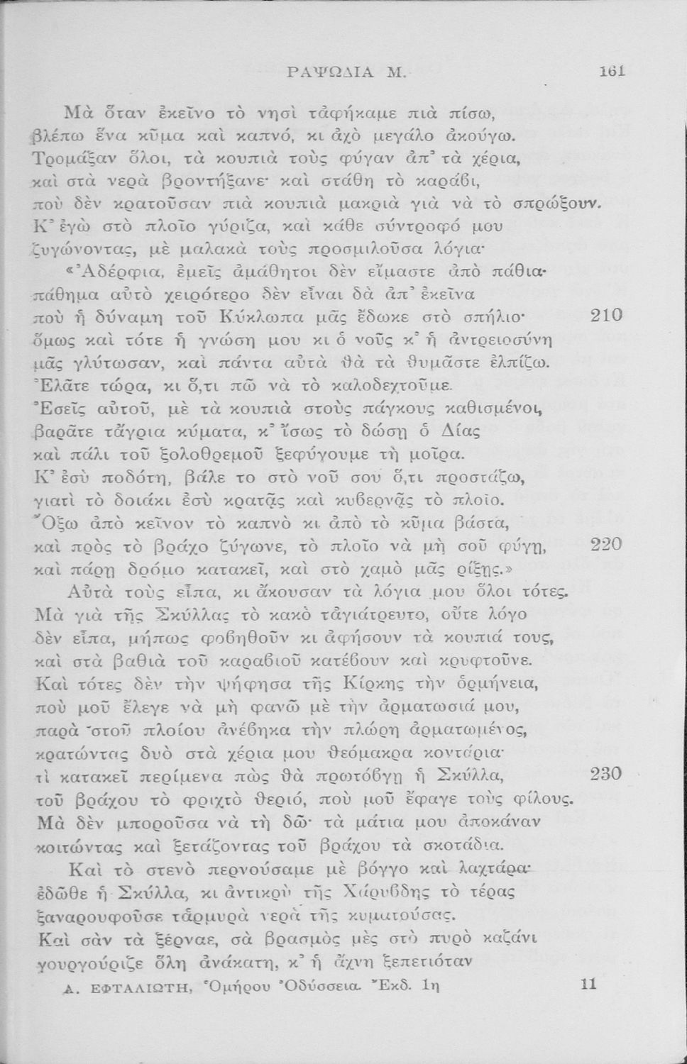 Σχολικό εγχειρίδιο του Γυμνασίου για το μάθημα των Αρχαίων Ελληνικών. Περιέχει τις ραψωδίες της Οδύσσειας και ερμηνευτικά, πραγματολογικά σχόλια, καθώς κ και γραμματικές παρατηρήσεις του συγγραφέα. Εγκρίθηκε για μια πενταετία 1932-1937.